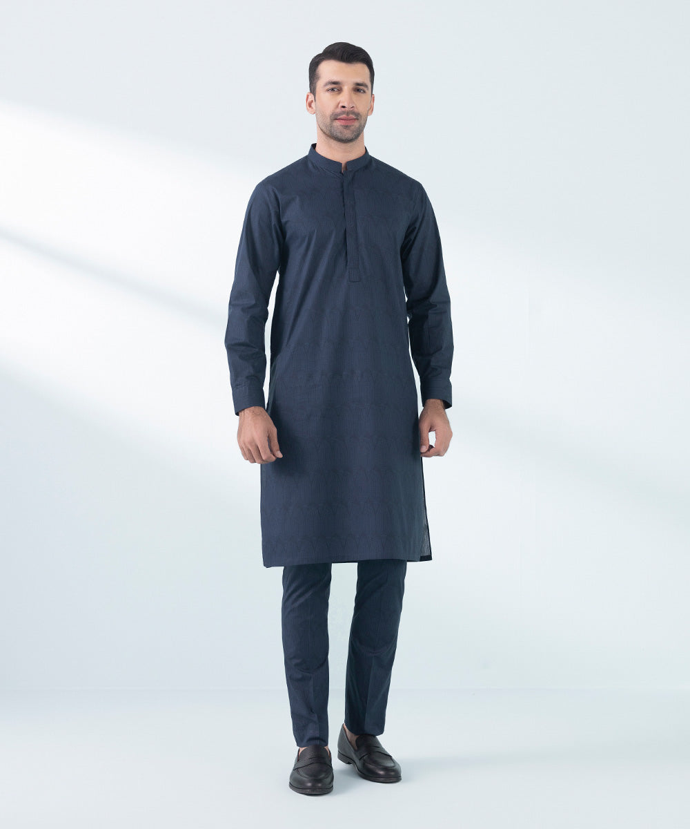 Match Your Little One In Our Stitched Printed Blue, Cotton, Slim-Fit Kurta And Straight Trousers.