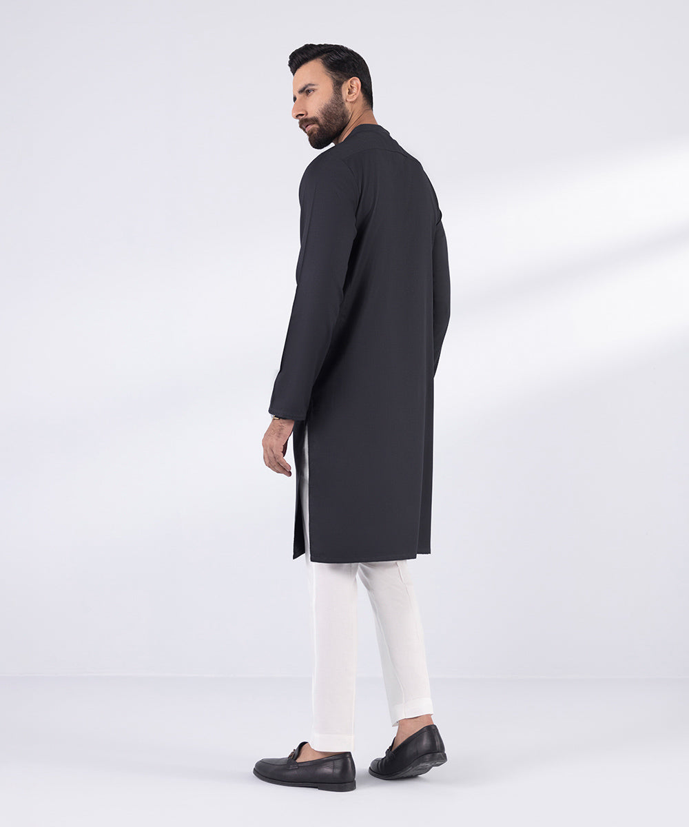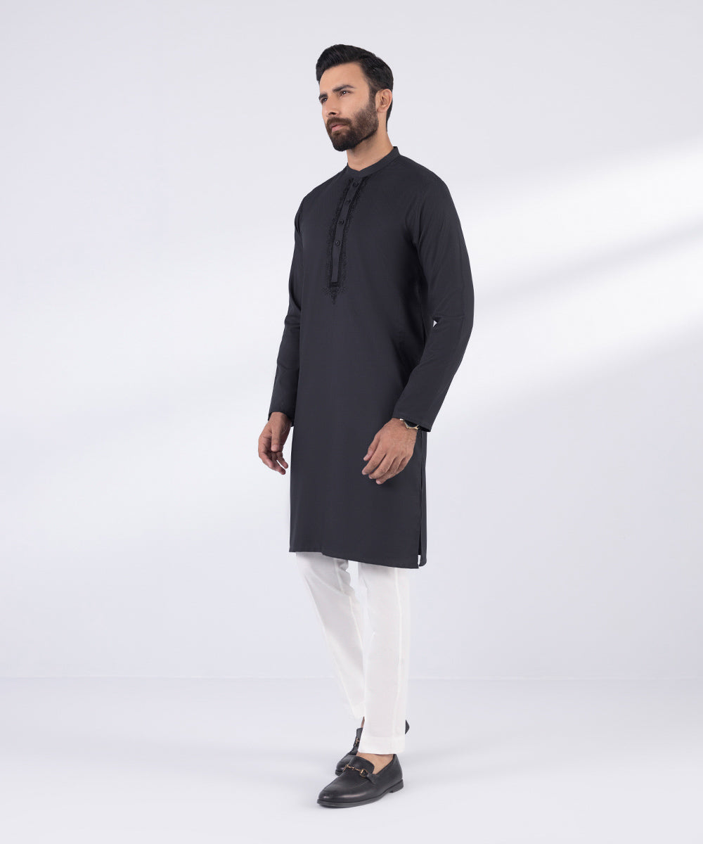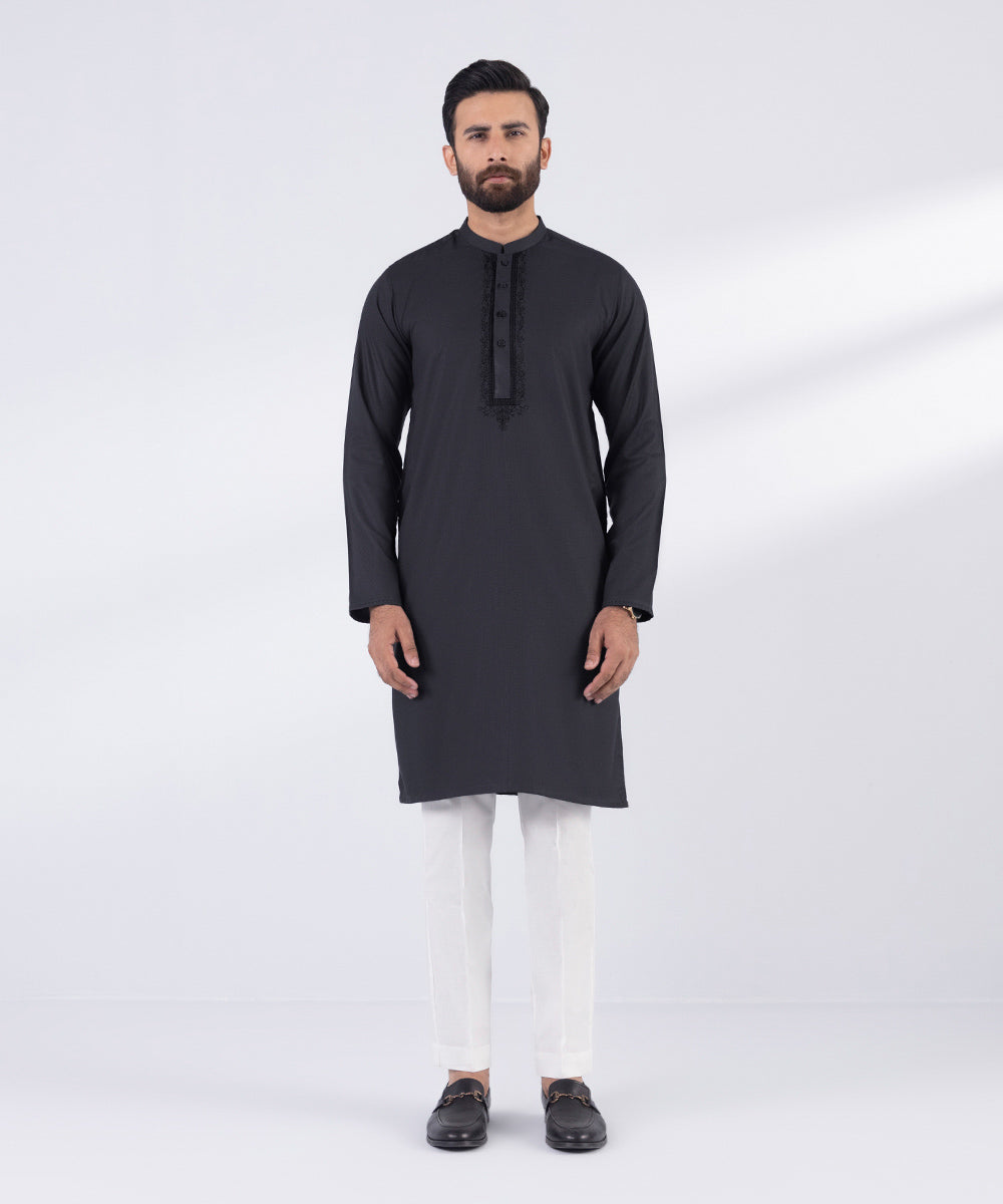 Make a dapper statement with our charcoal embroidered jacquard kurta.