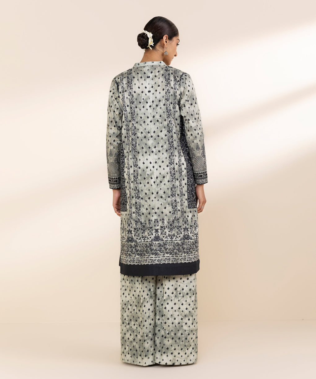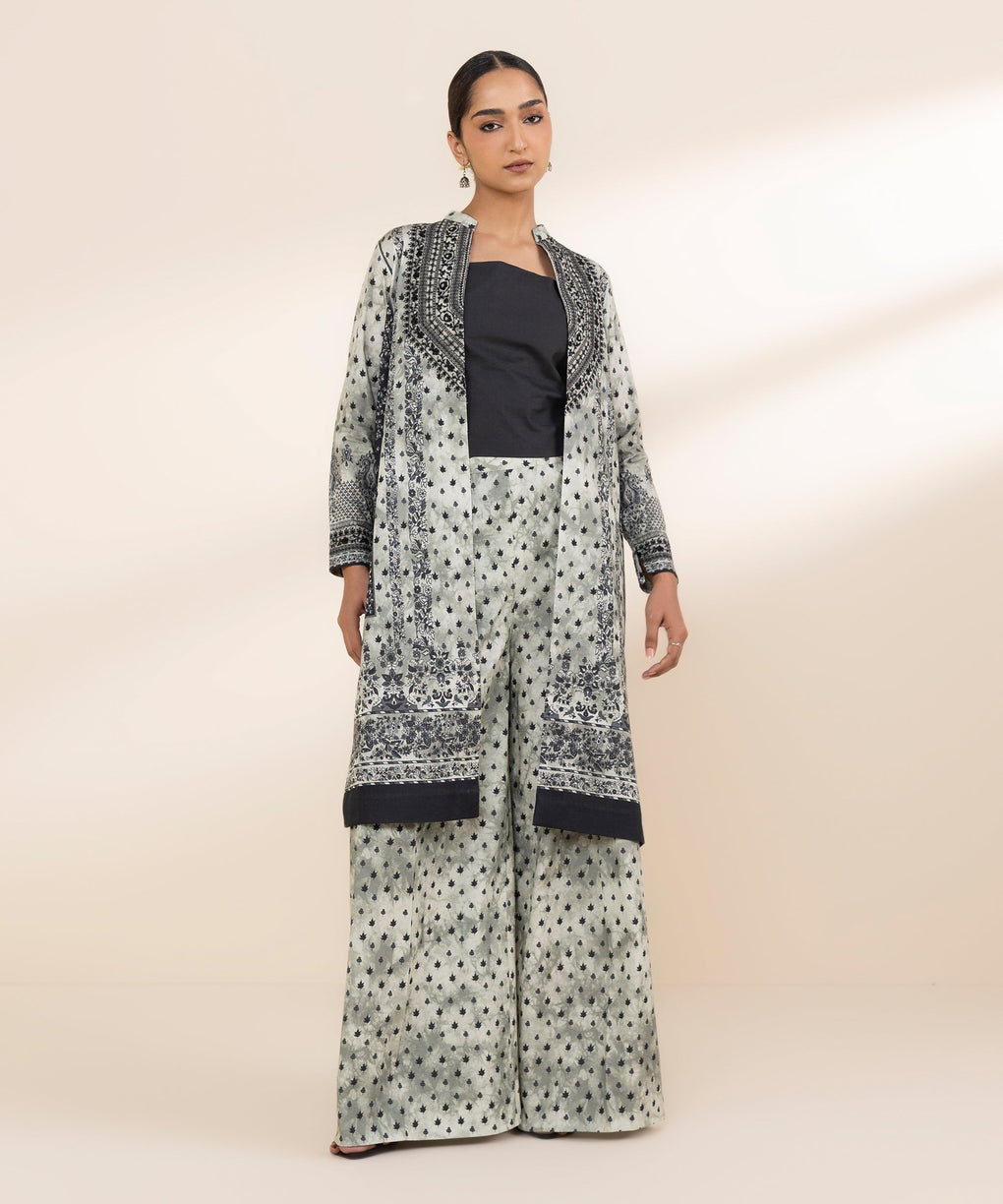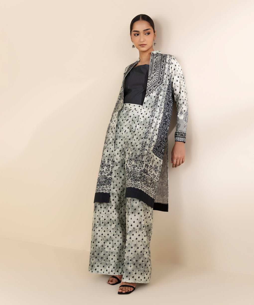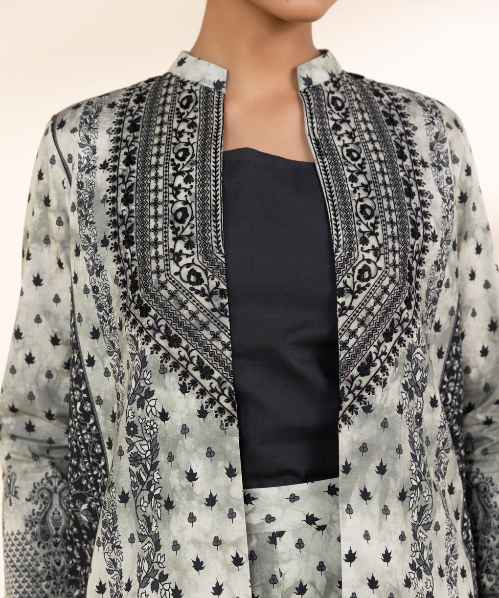 Elevate your style with our two-piece embroidered ensemble in black and off white featuring a lawn shirt paired with cotton trousers.