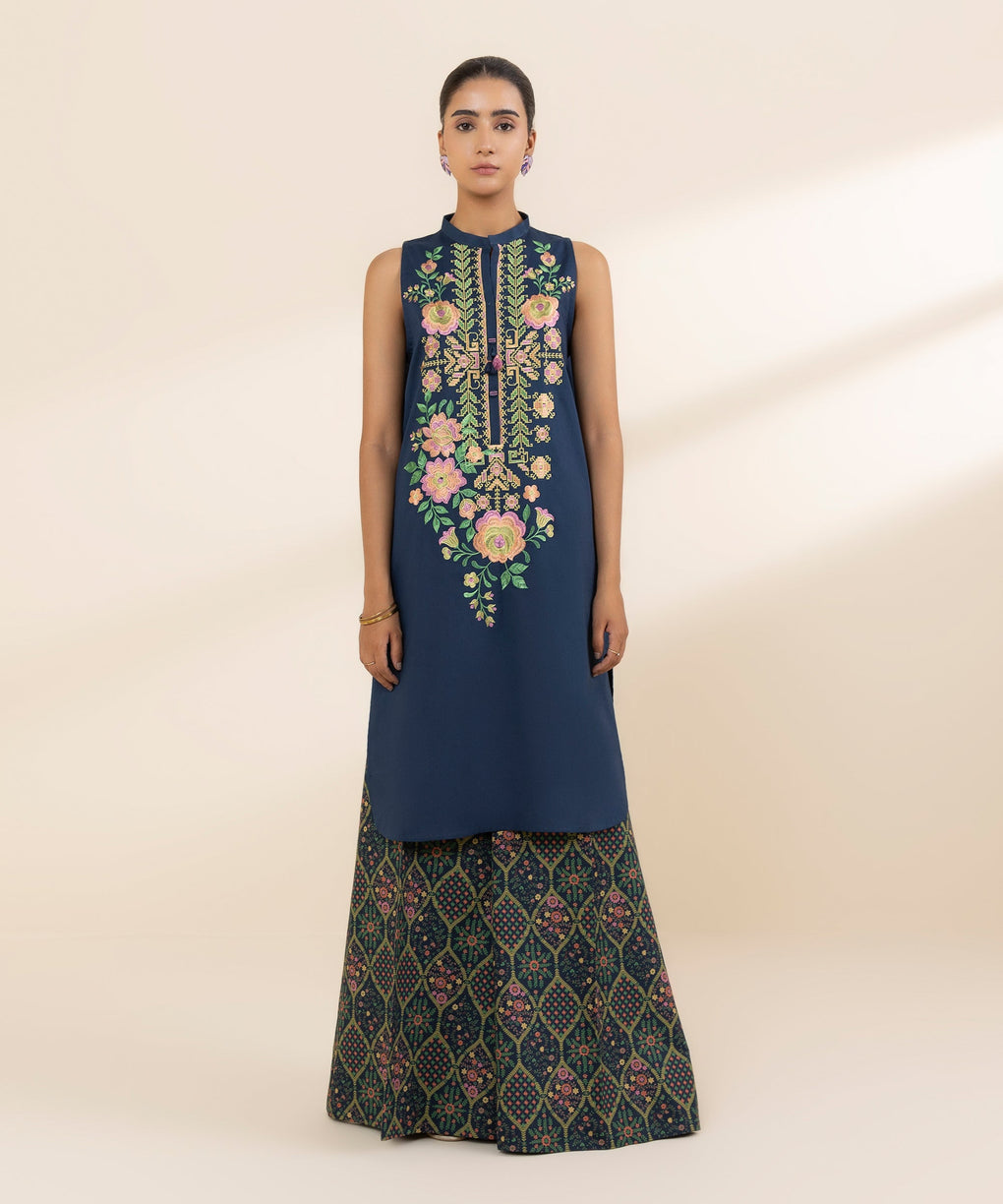 Make a statement with our two-piece embroidered ensemble featuring a blue lawn shirt paired with multicoloured cotton trousers.