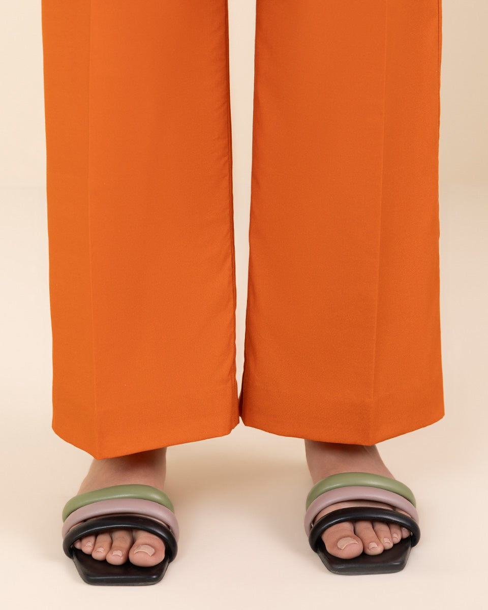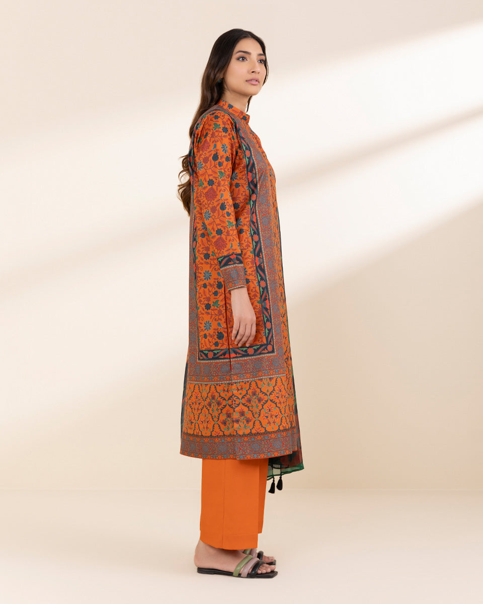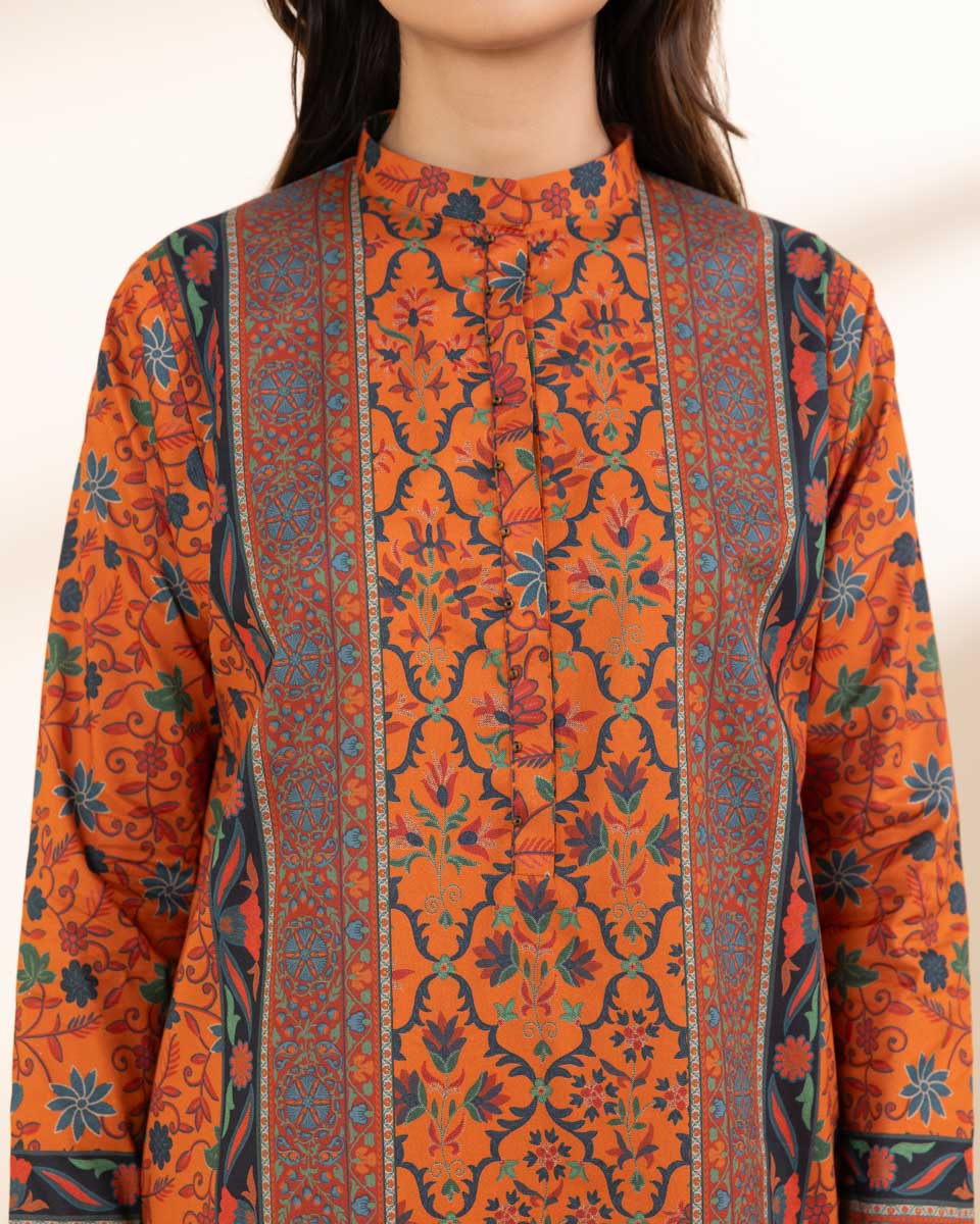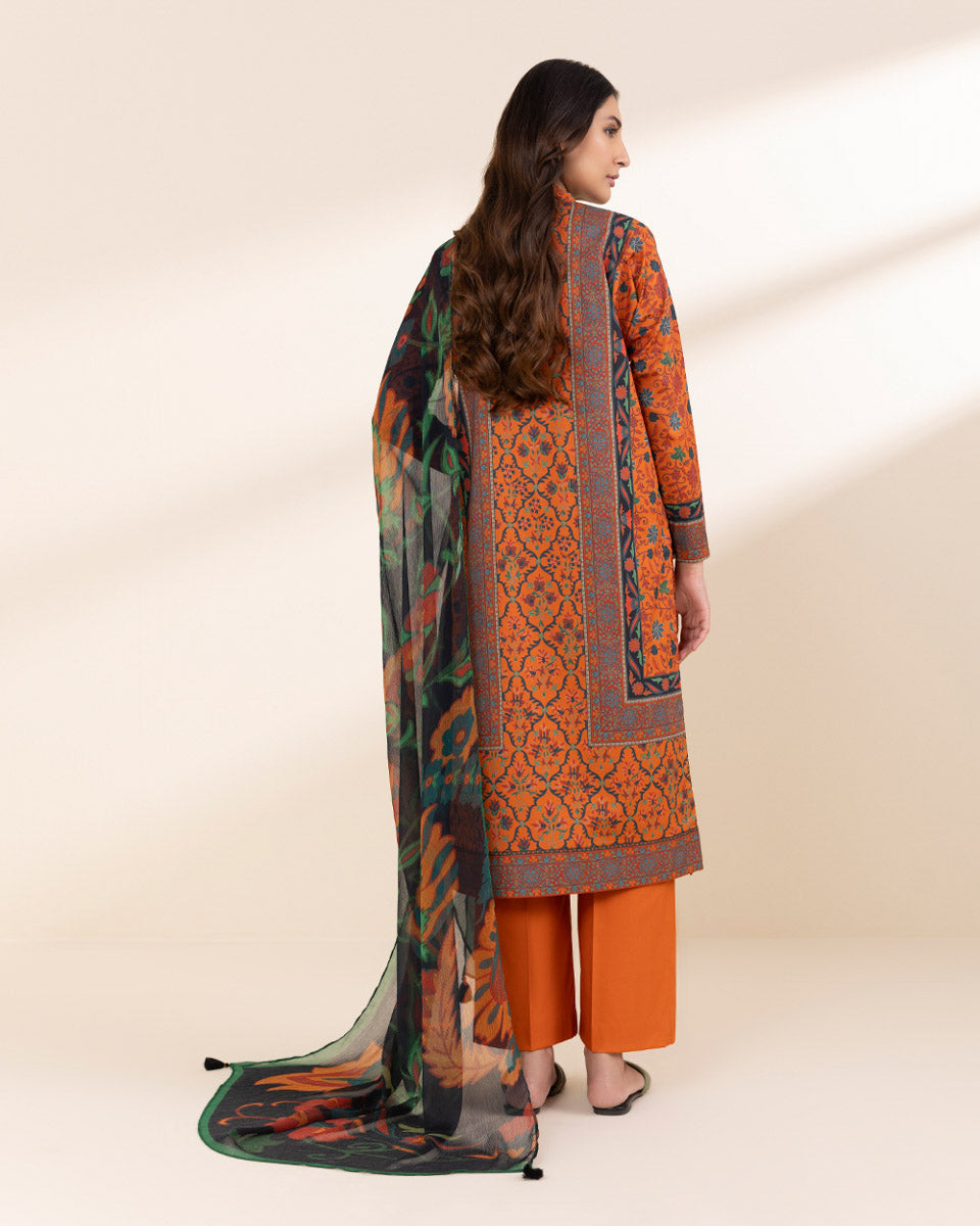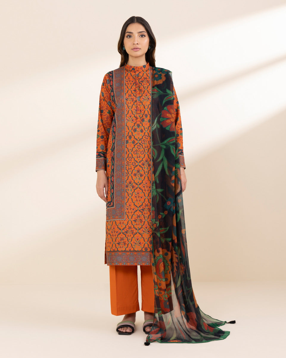 Step out in style in our printed rust orange lawn shirt and cotton trousers ensemble with a multi-coloured blended chiffon dupatta.