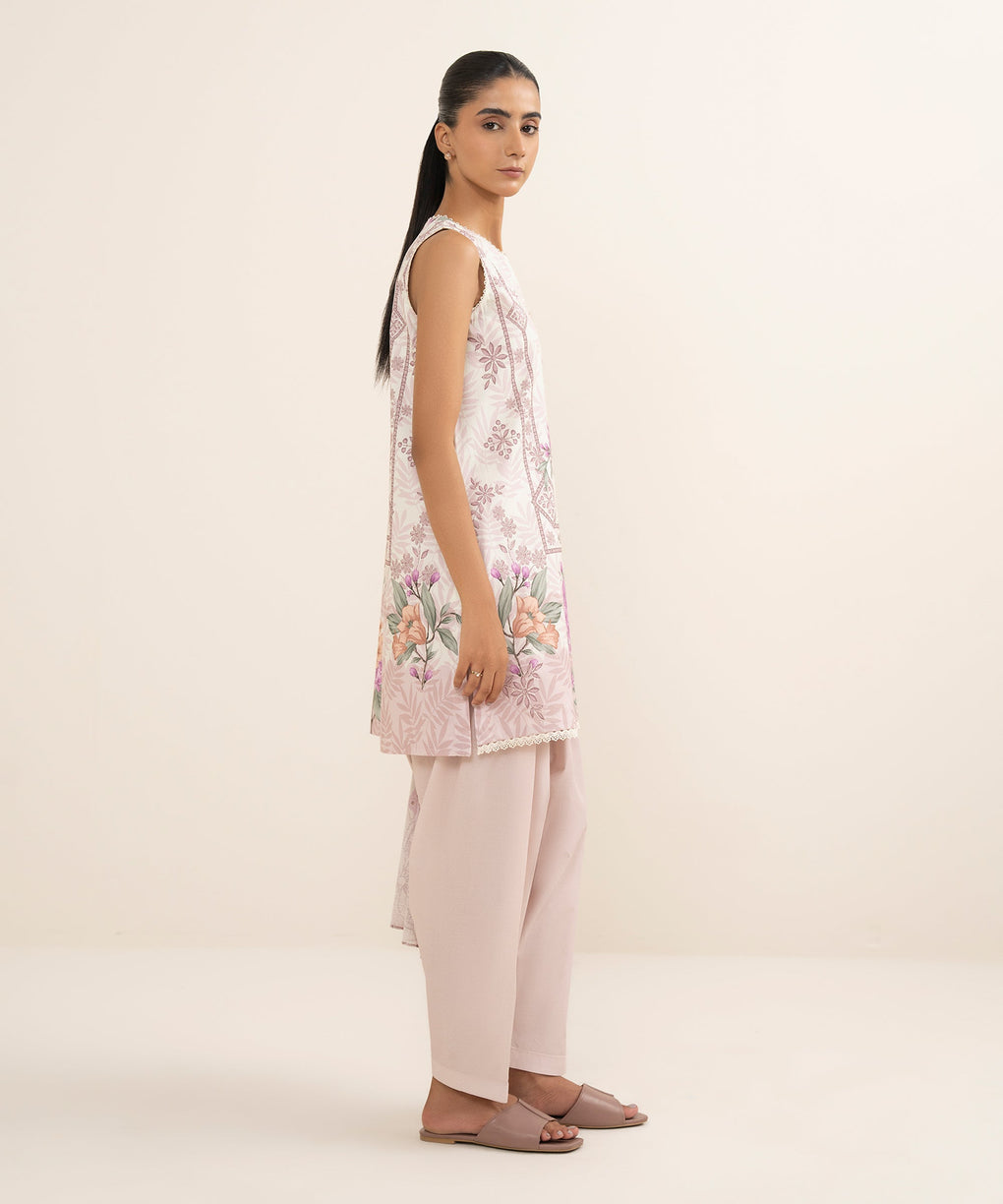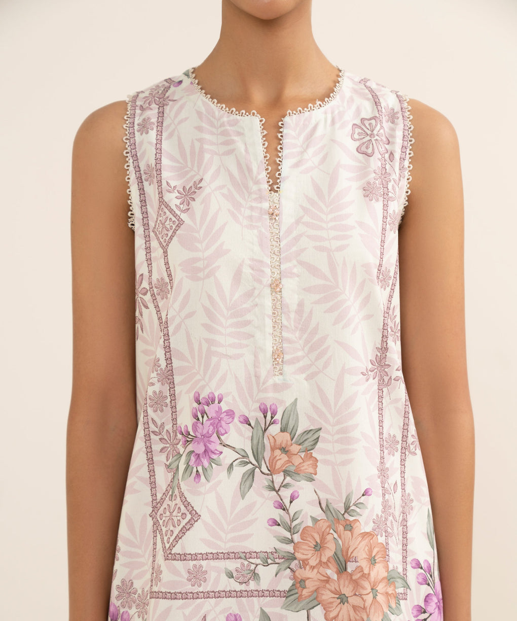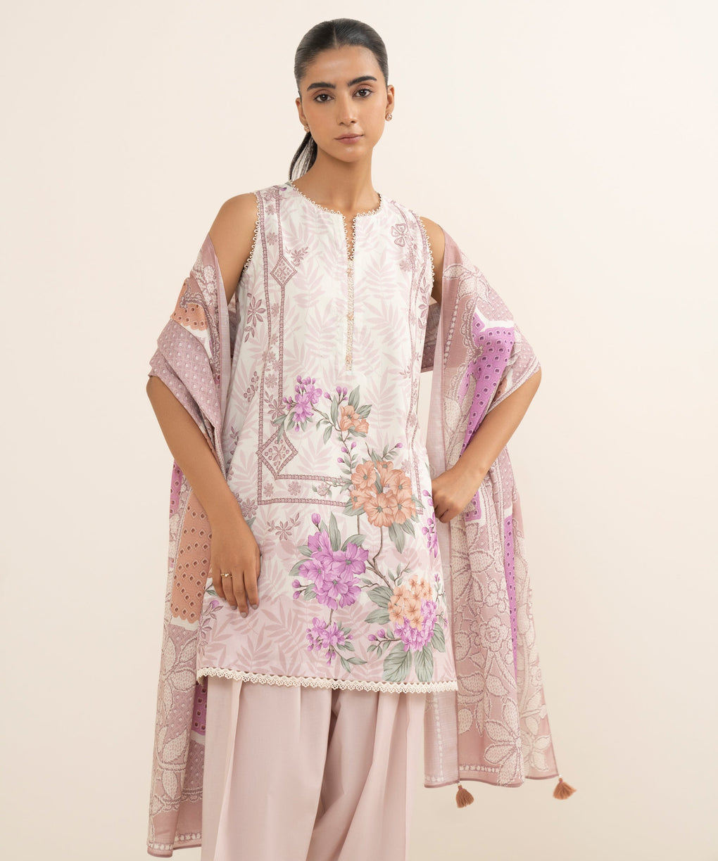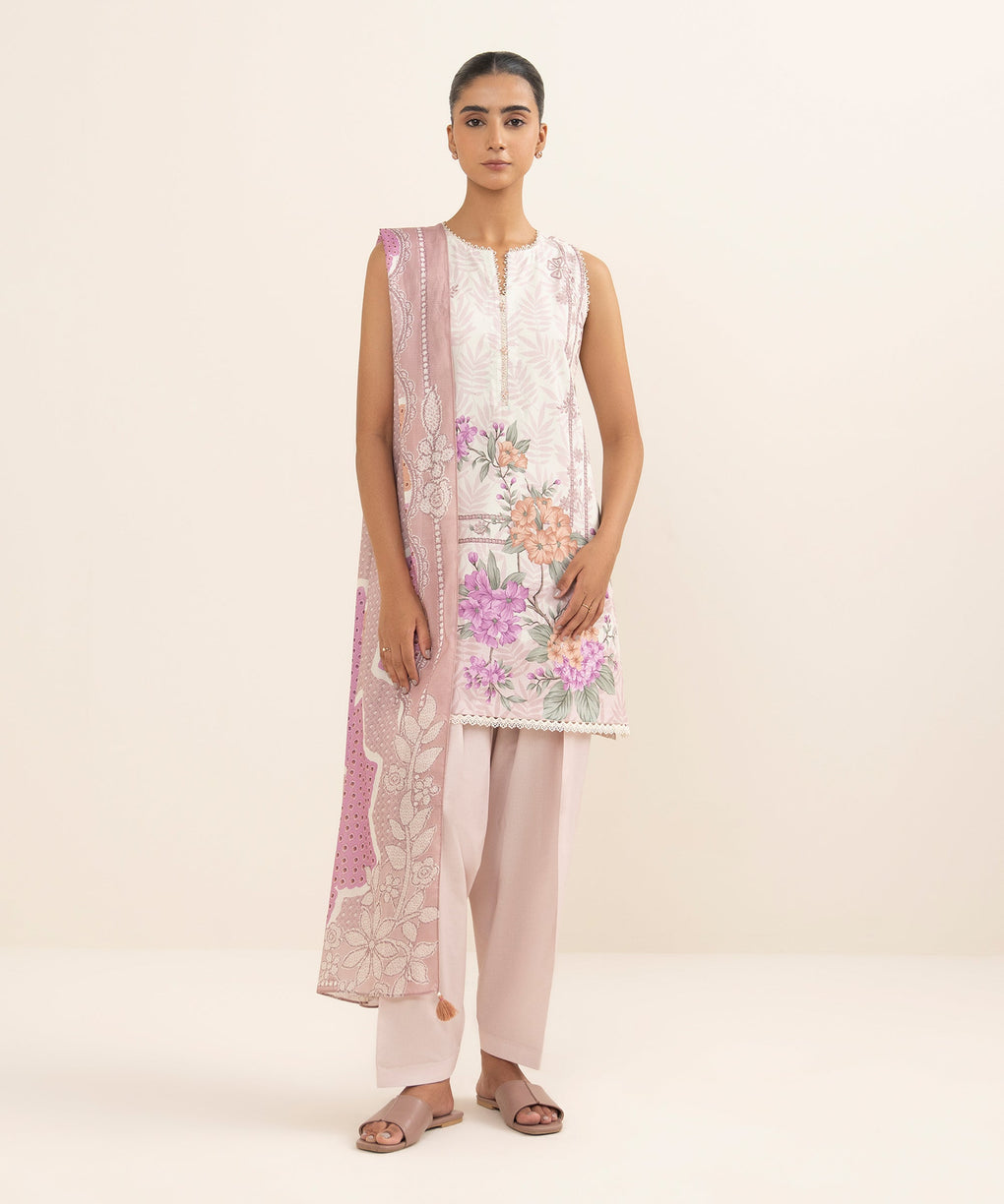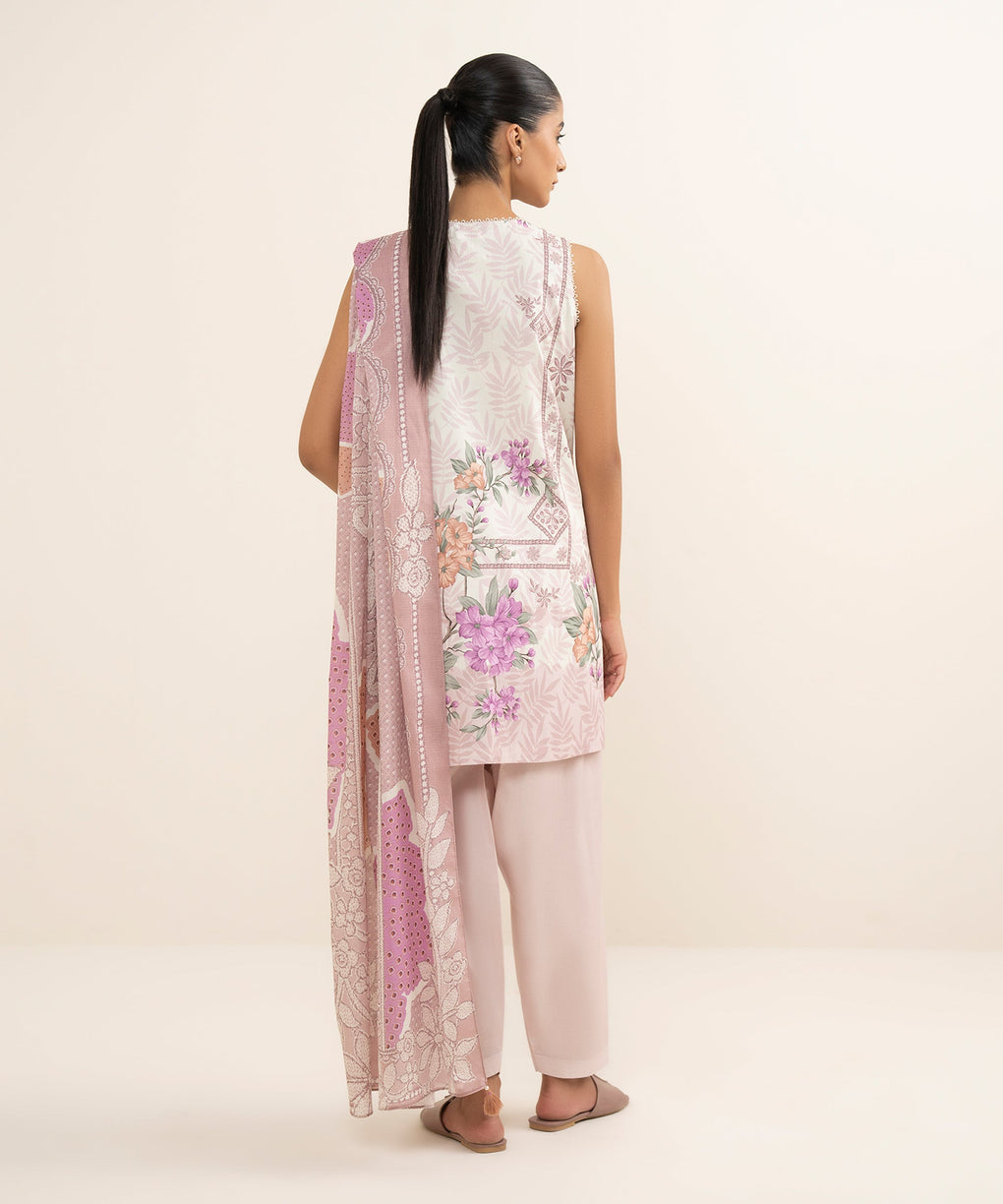 Make a statement with our three-piece printed pink ensemble featuring a lawn shirt paired with a multicoloured voile dupatta and cotton trousers.