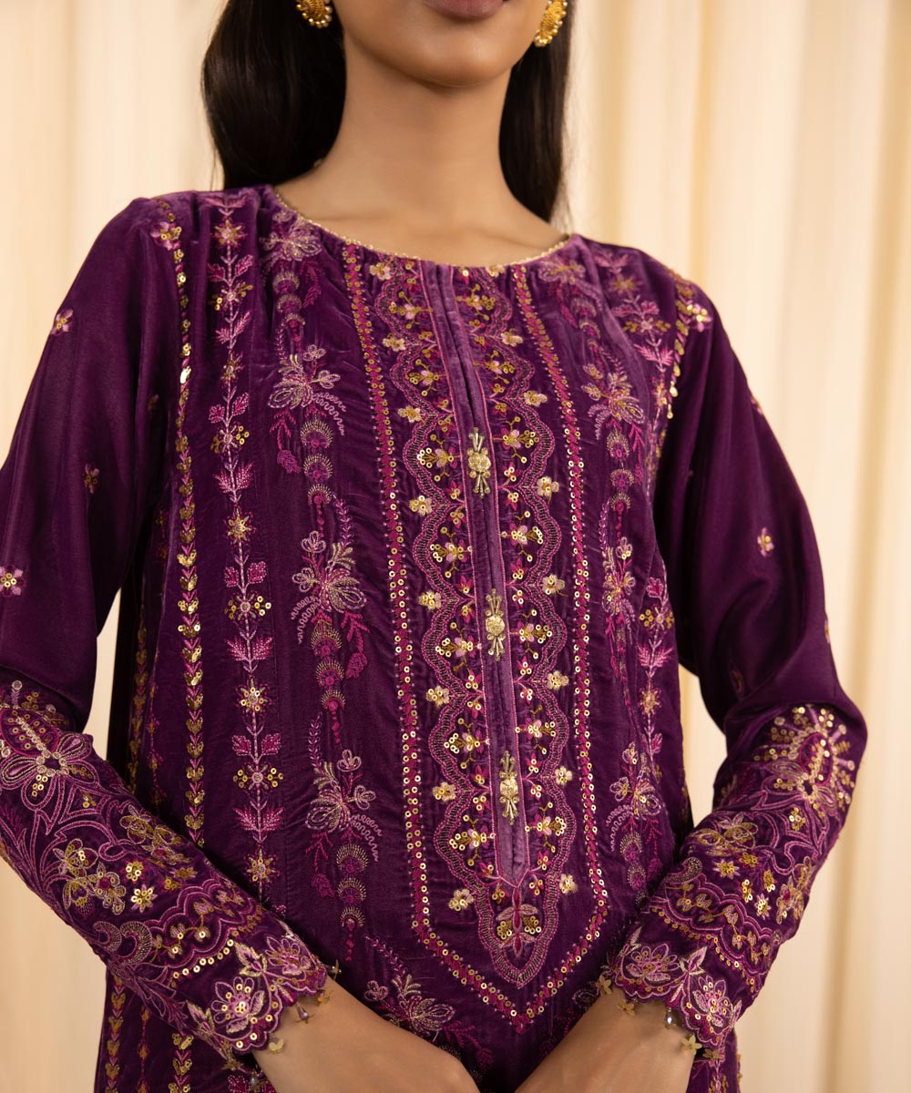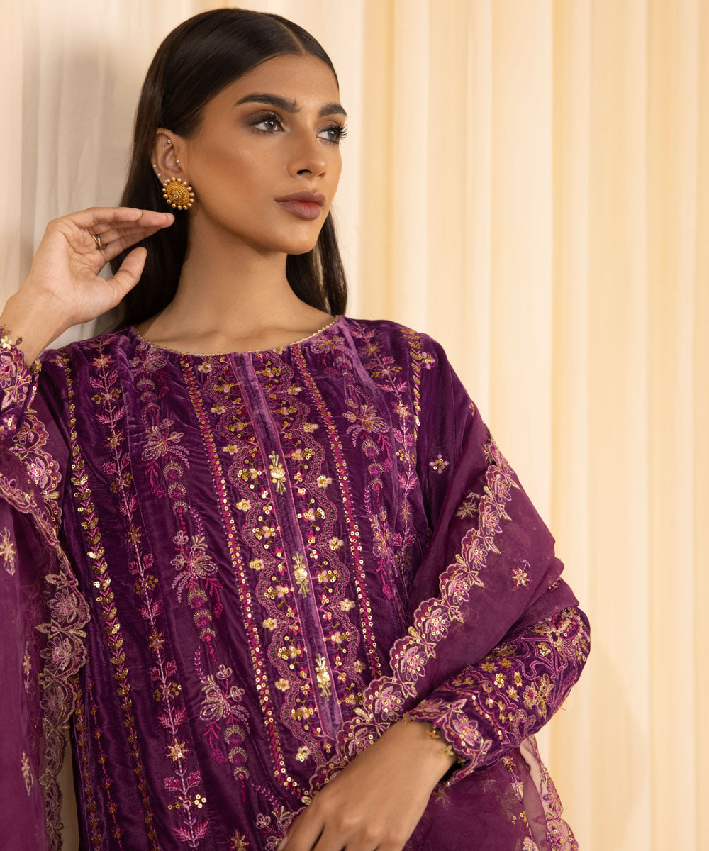 Look regal in our purple three-piece featuring intricate detailing and patterns flawlessly paired with an organza dupatta.