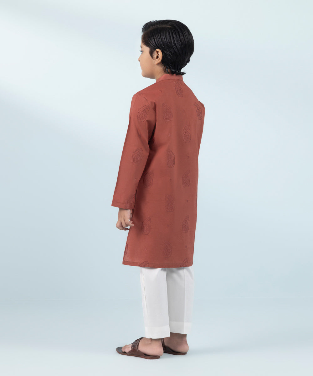 Dress your little one in our rust, all-over embroidered cotton schiffli kurta.