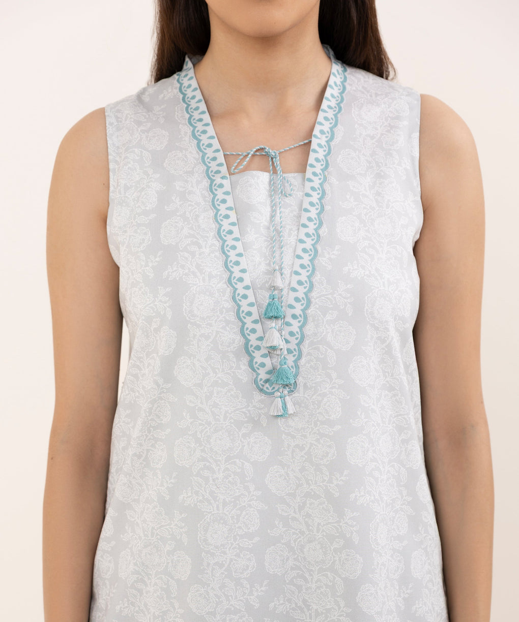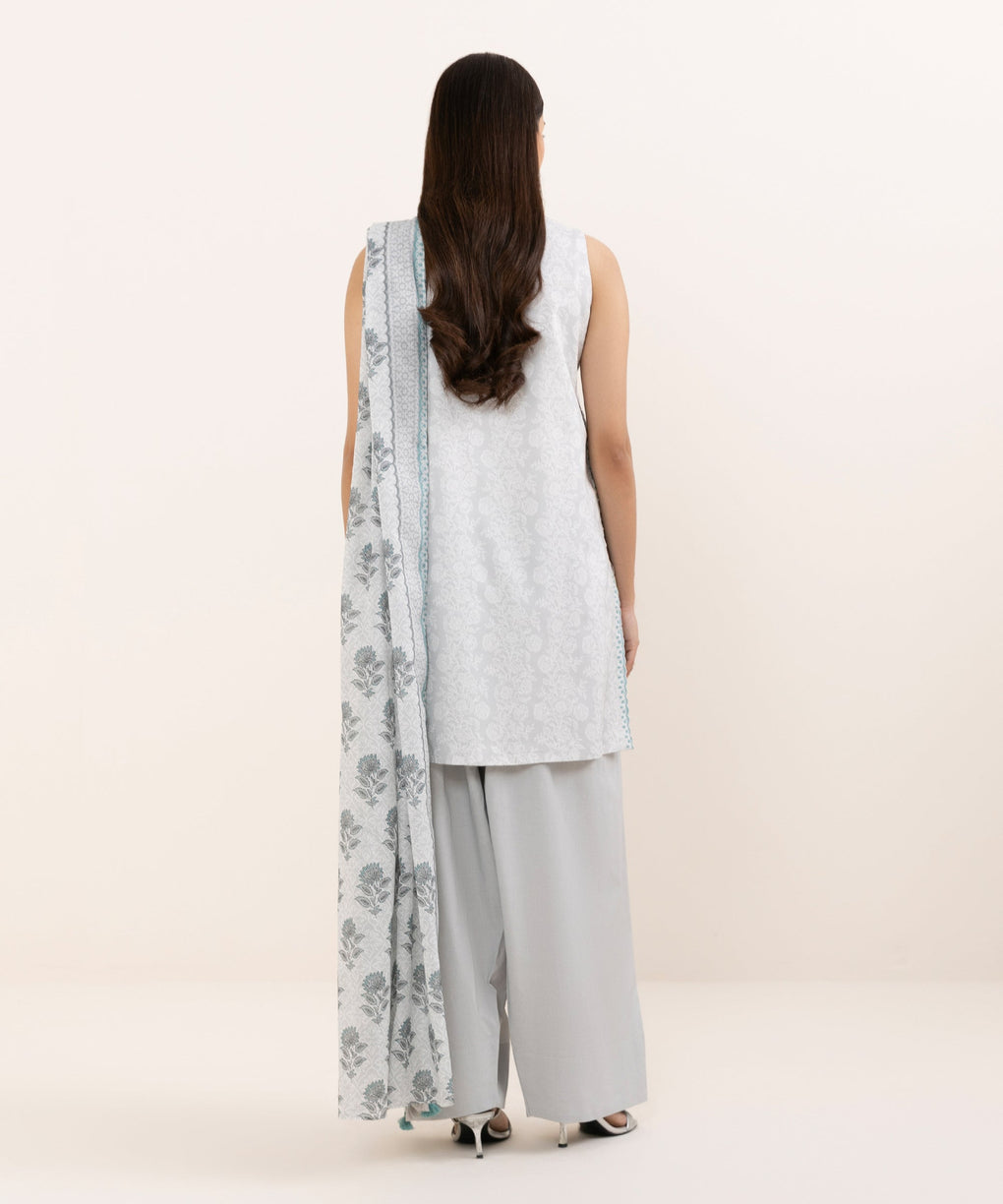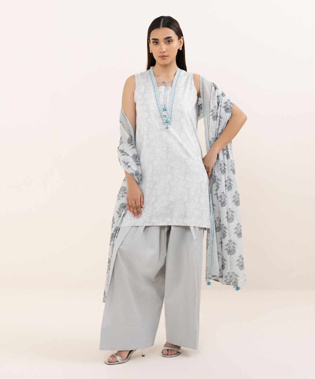 Elevate your style with our three-piece printed grey and off-white ensemble featuring an arabic lawn shirt paired with a voile dupatta and cotton trousers.