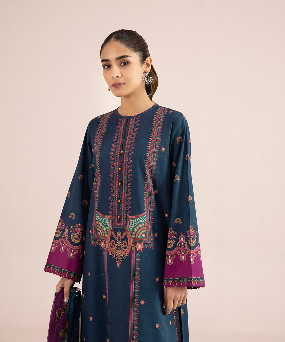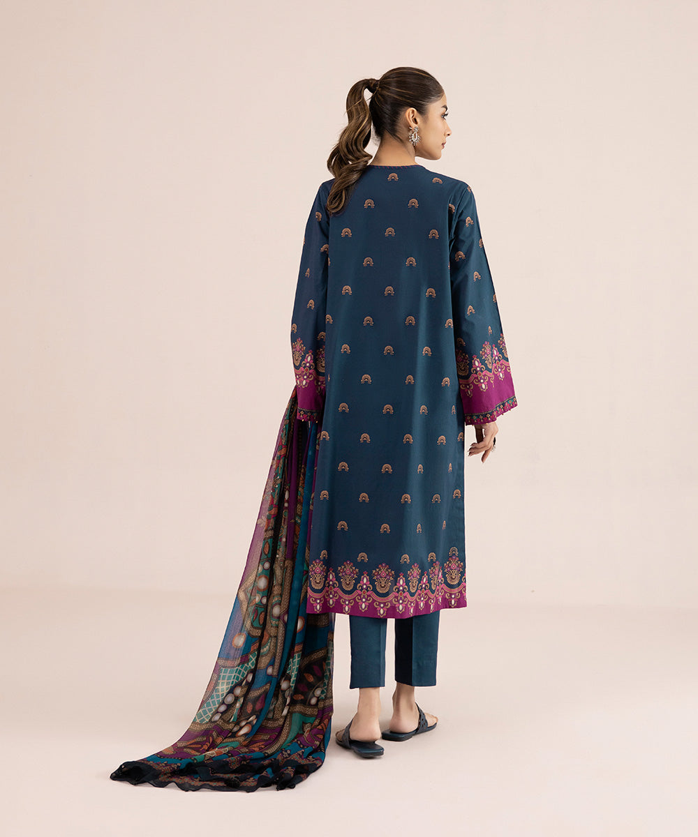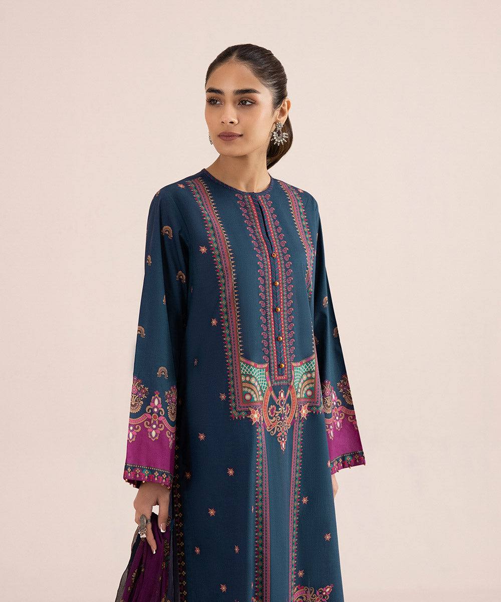 Flaunt your femininity with delicate dainty patterns with our blue & pink digital printed two piece ensemble featuring a chiffon dupatta.