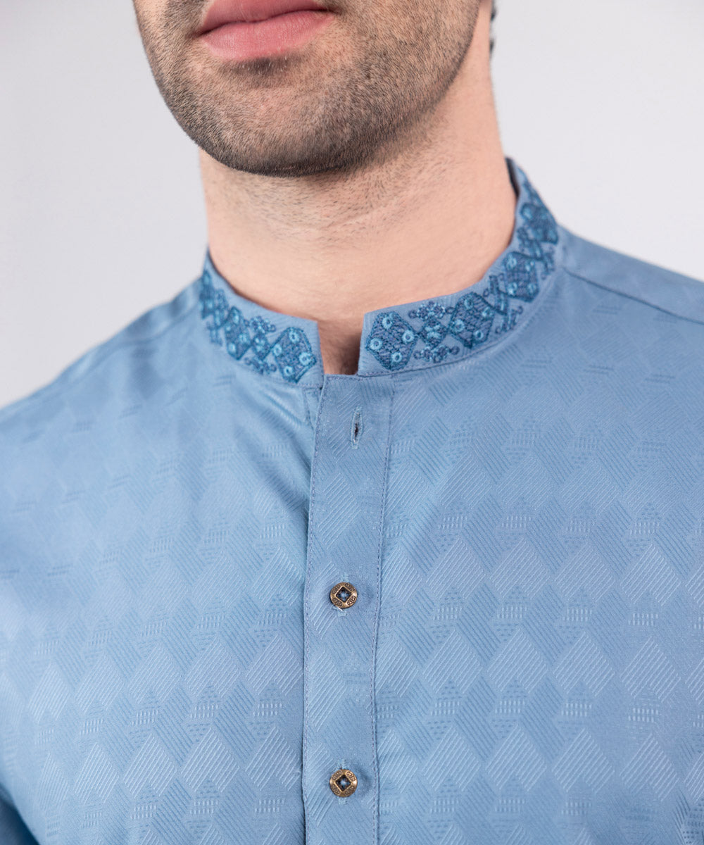 Details: Dyed Embroidered Front, Dyed Embroidered Back, Full Sleeves, Band NecklineColour: BlueFabric: 100% Cotton