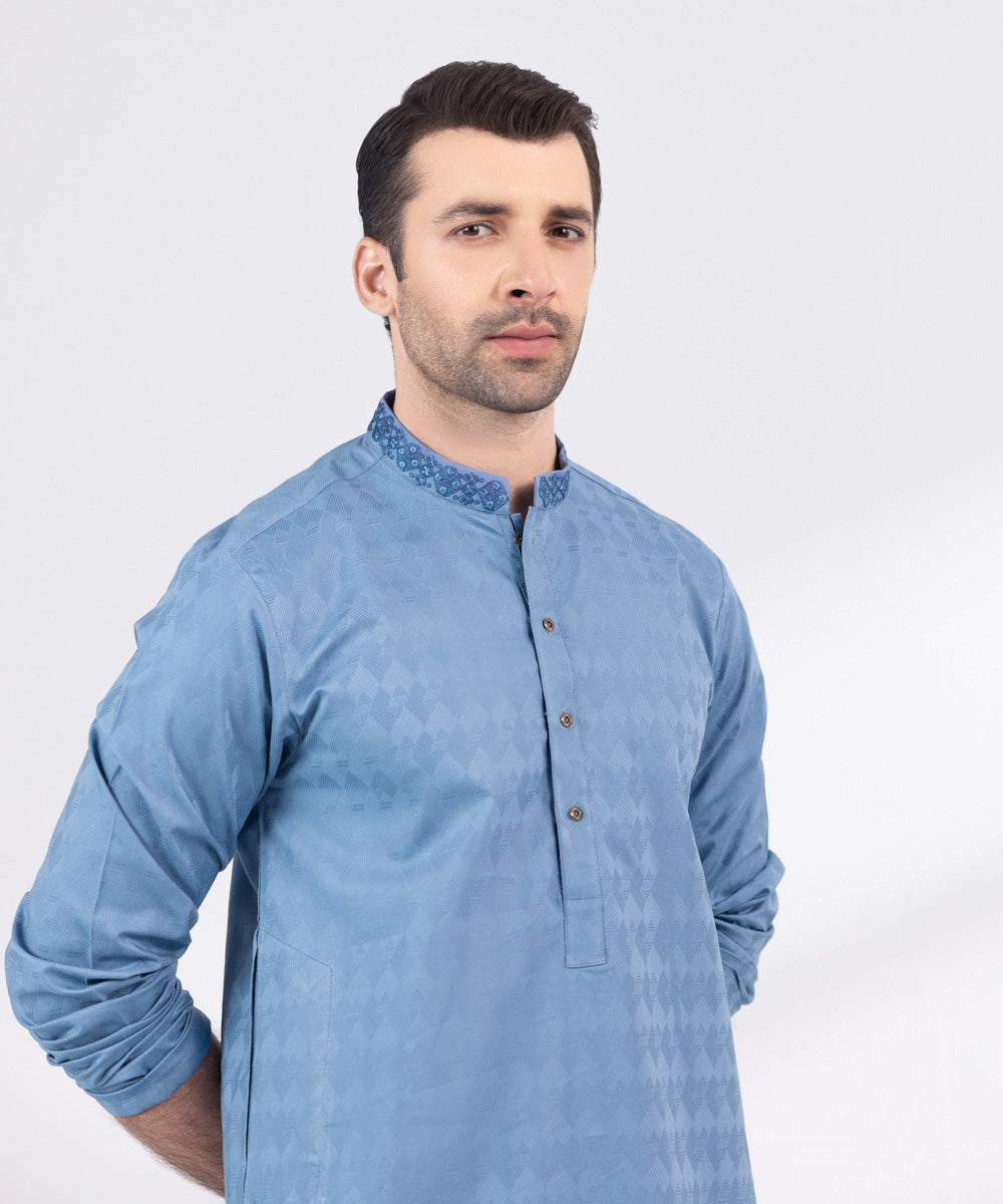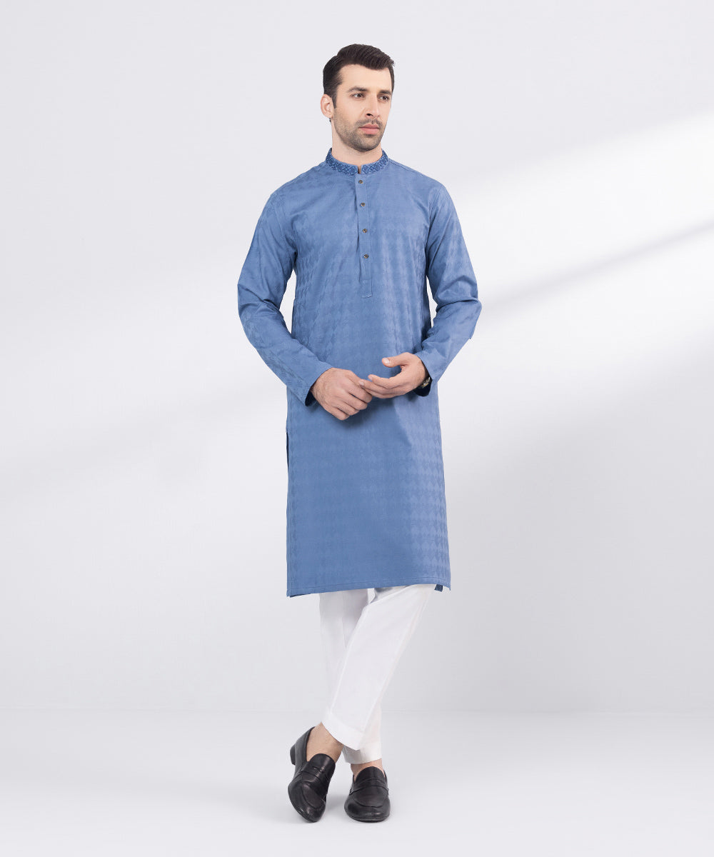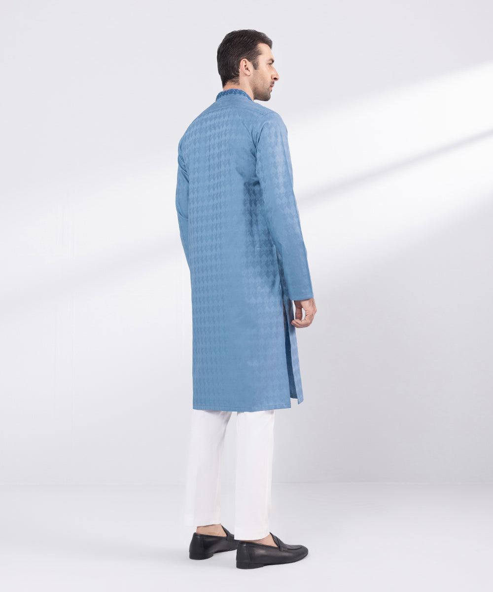 Straight KurtaUplift your seasonal look with our blue embroidered cotton jacquard kurta.