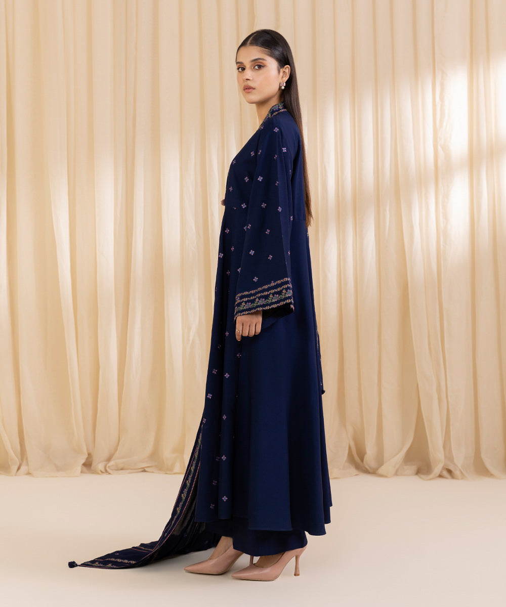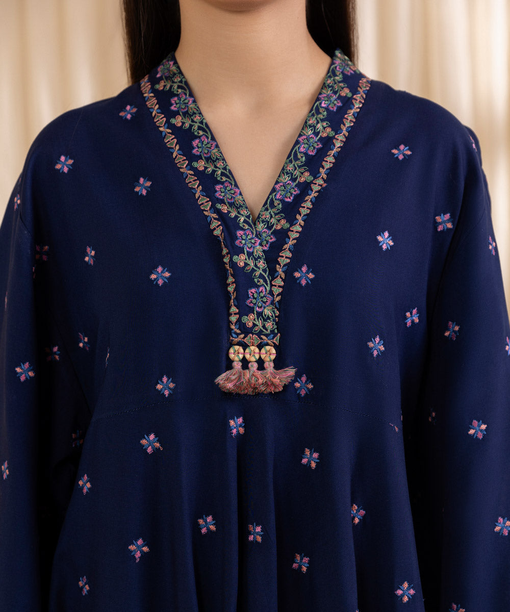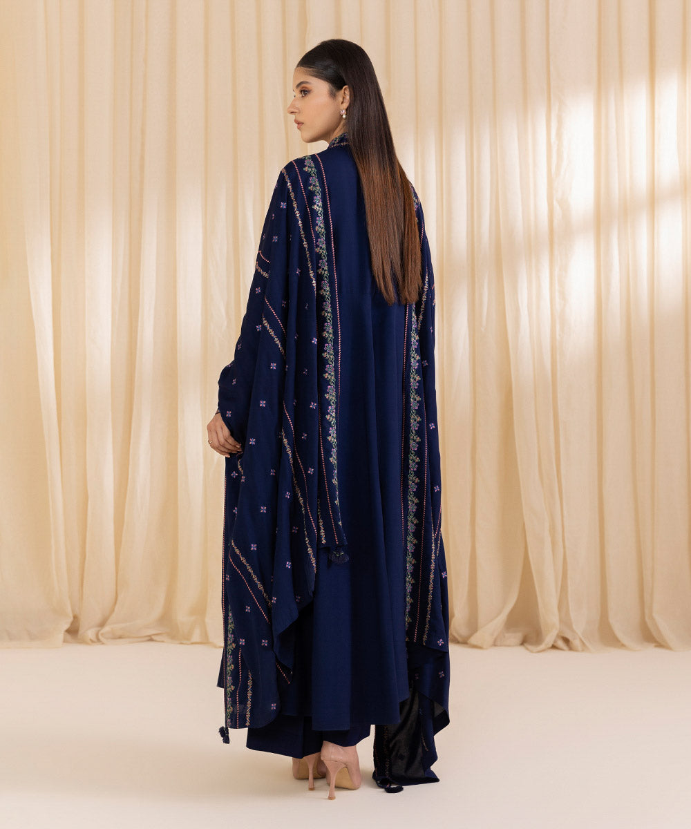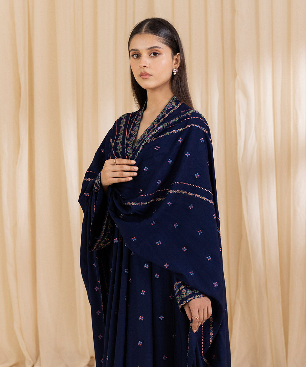 Turn heads this festive season with our two-piece embroidered Navy Blue ensemble featuring a linen shirt paired with a matching linen dupatta.