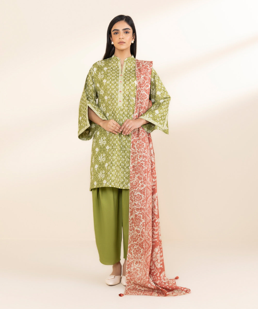 Elevate your seasonal wardrobe with our printed parrot green and dark pink, lawn two piece suit with cotton trousers.