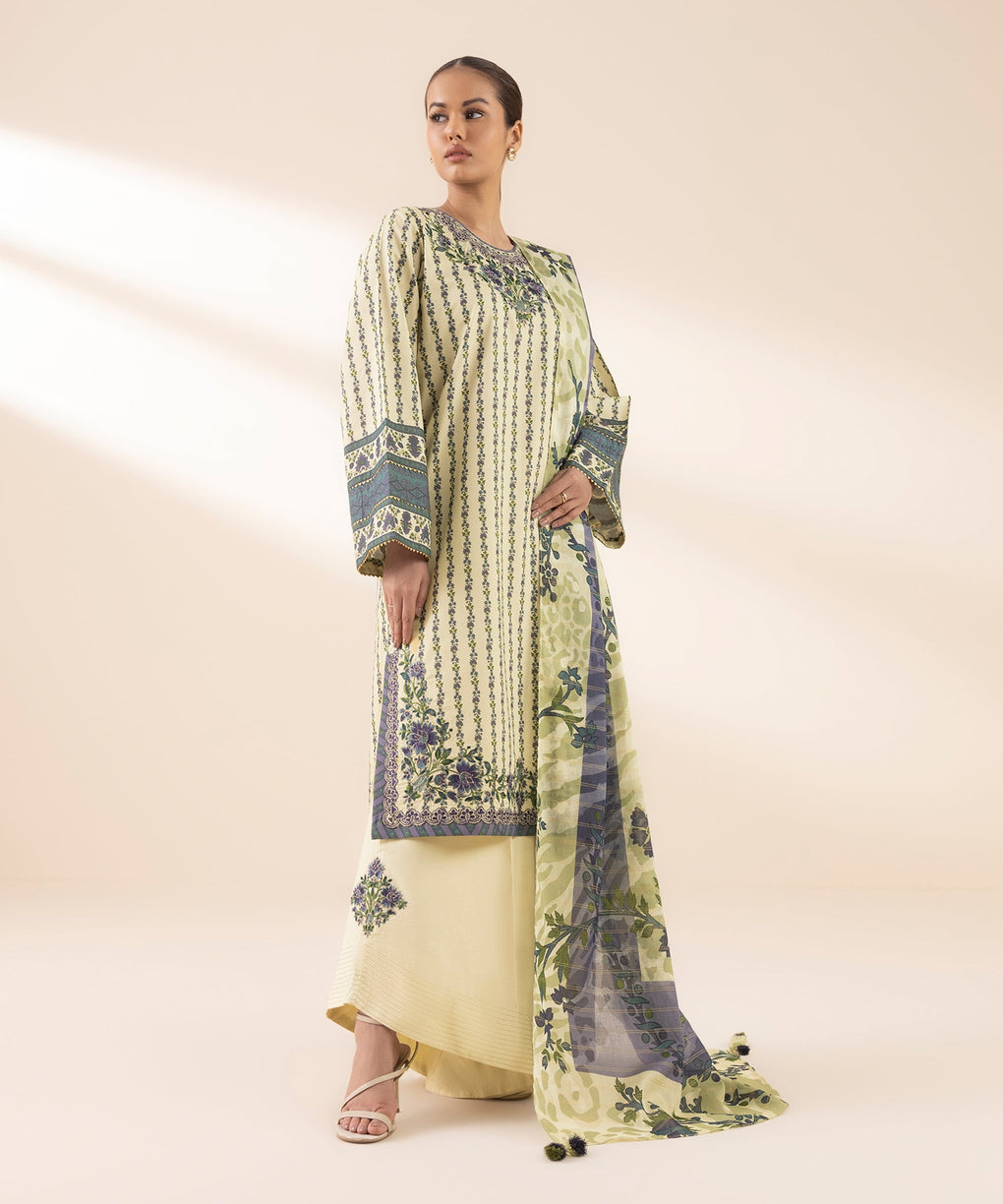 Make a statement with our three-piece embroidered off white and purple ensemble featuring a zari lawn shirt paired with a zari voile dupatta and cotton trousers.