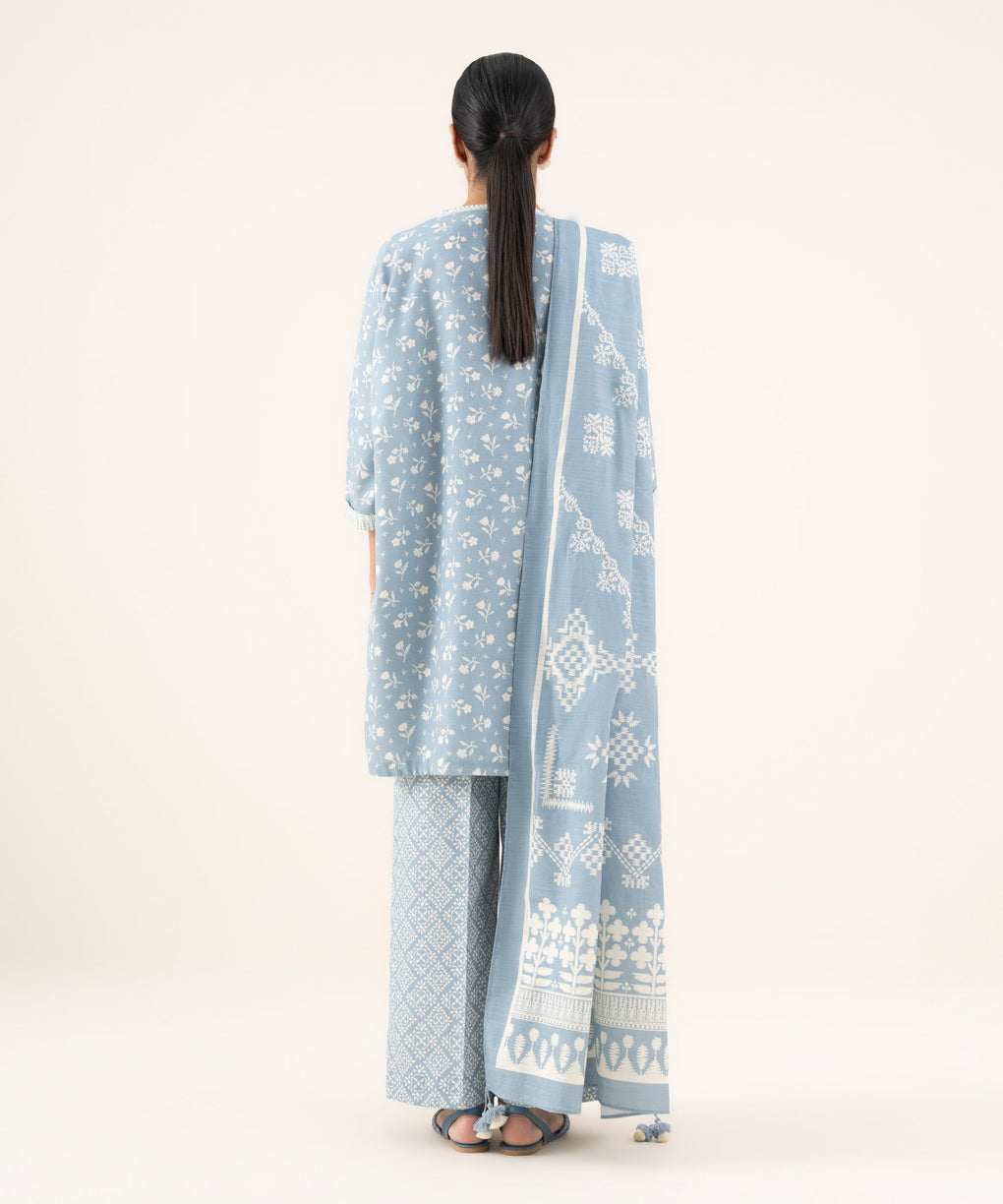 Make a statement with our three-piece printed blue and off white ensemble featuring a light khaddar shirt and trousers paired with a matching dupatta.