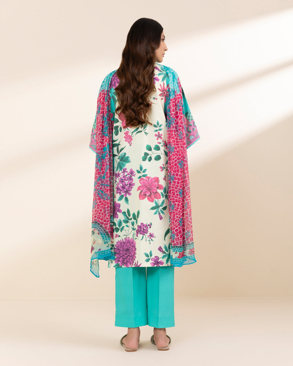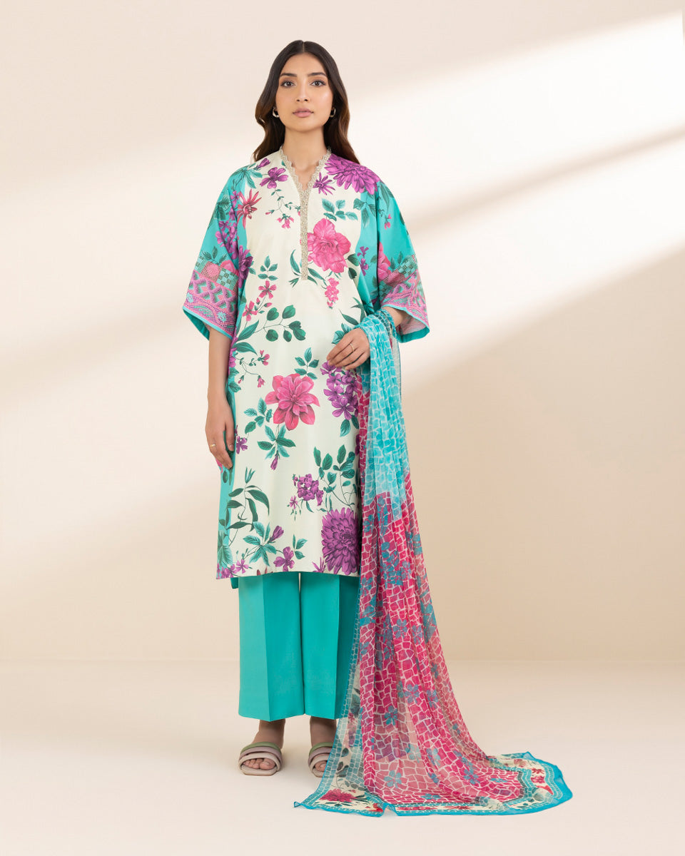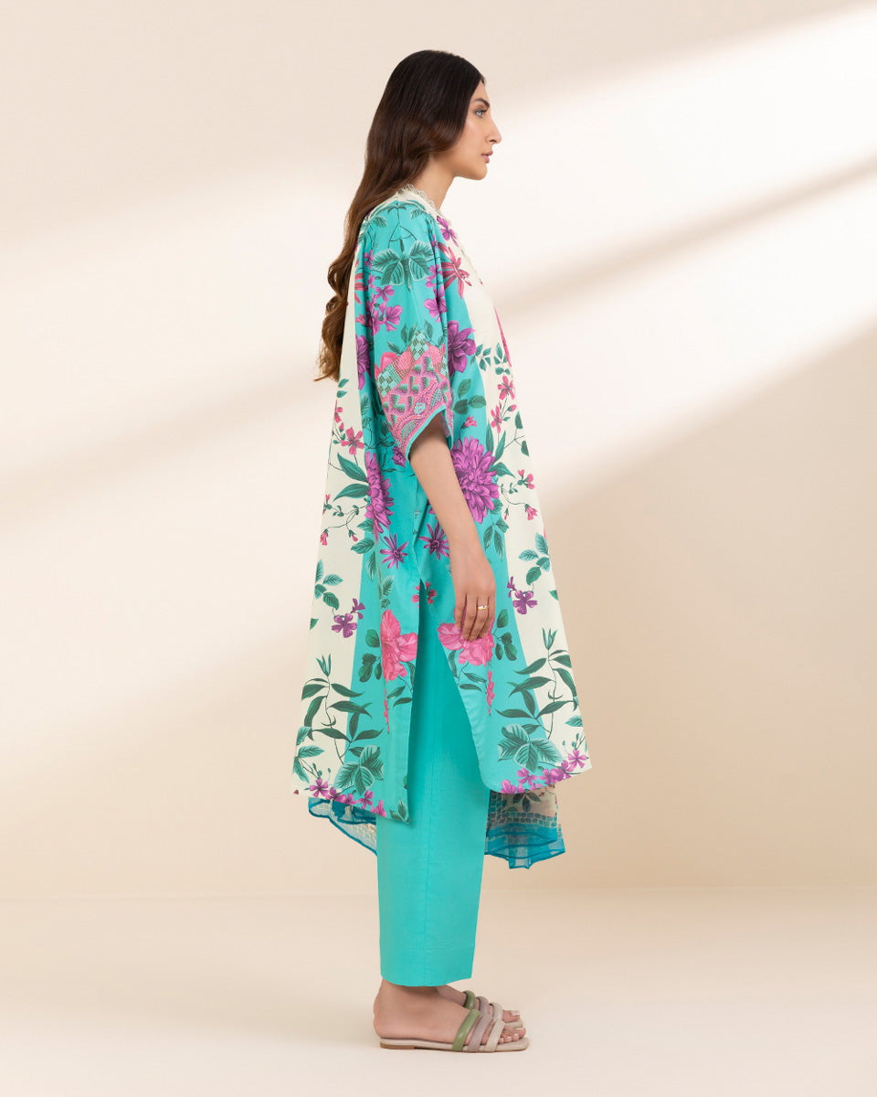 Step out in style in our printed teal green lawn shirt and cotton trousers ensemble with a multi-coloured blended chiffon dupatta.