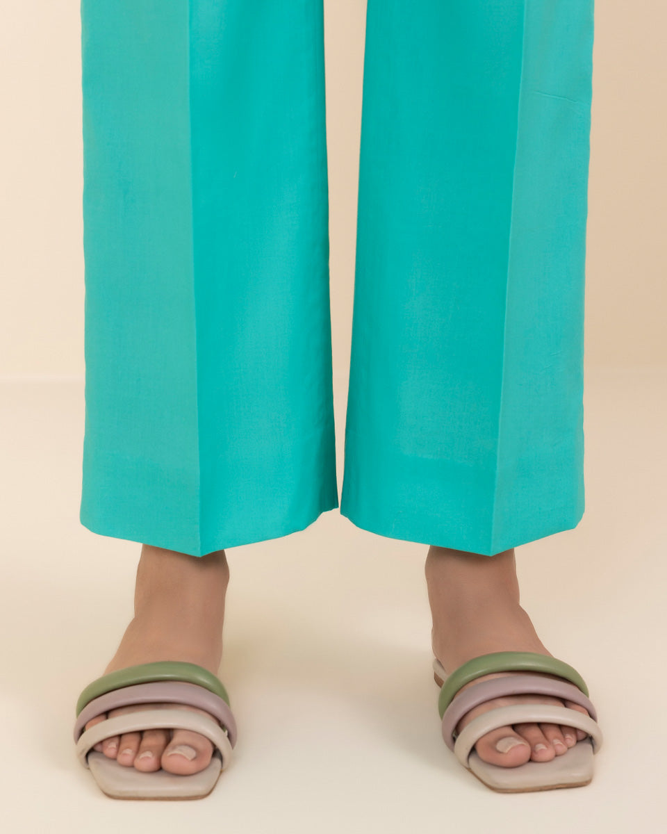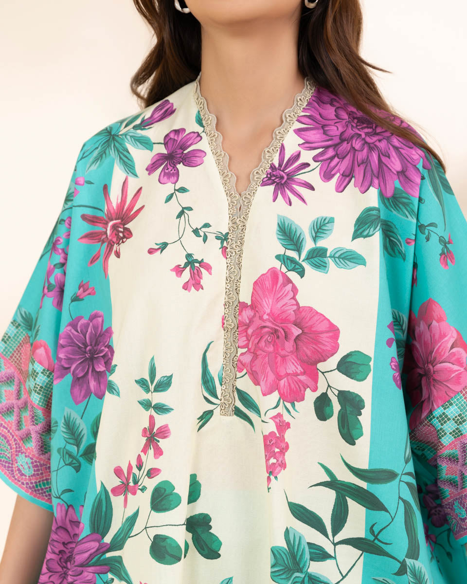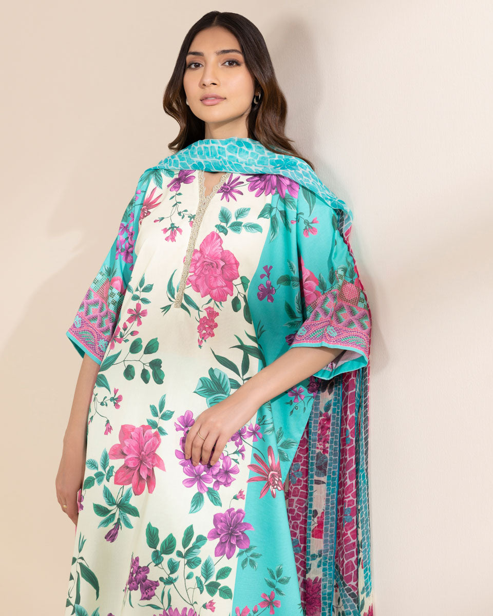 Step out in style in our printed teal green lawn shirt and cotton trousers ensemble with a multi-coloured blended chiffon dupatta.