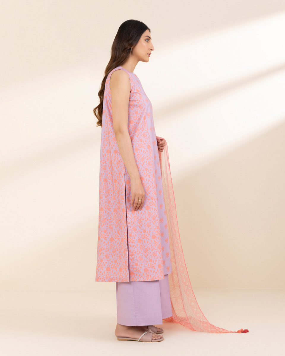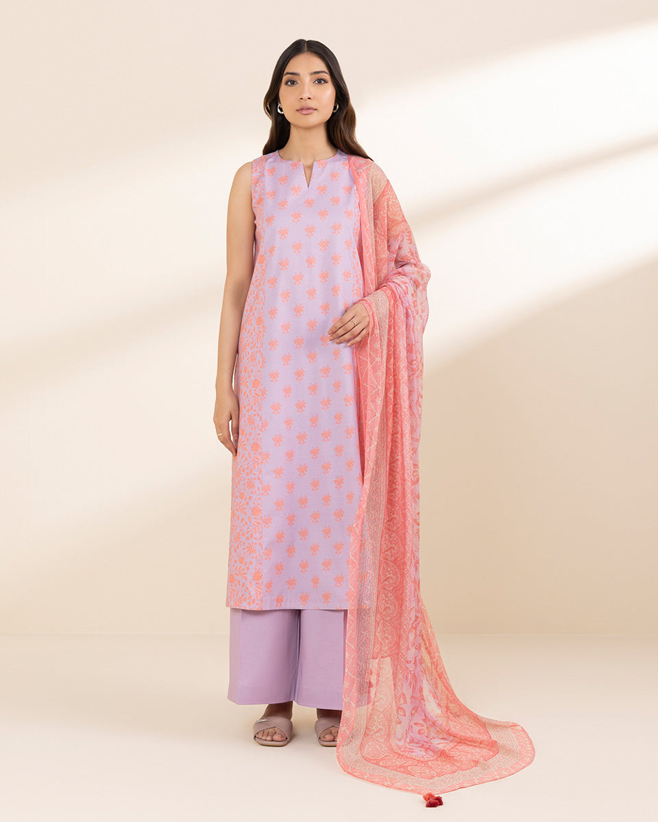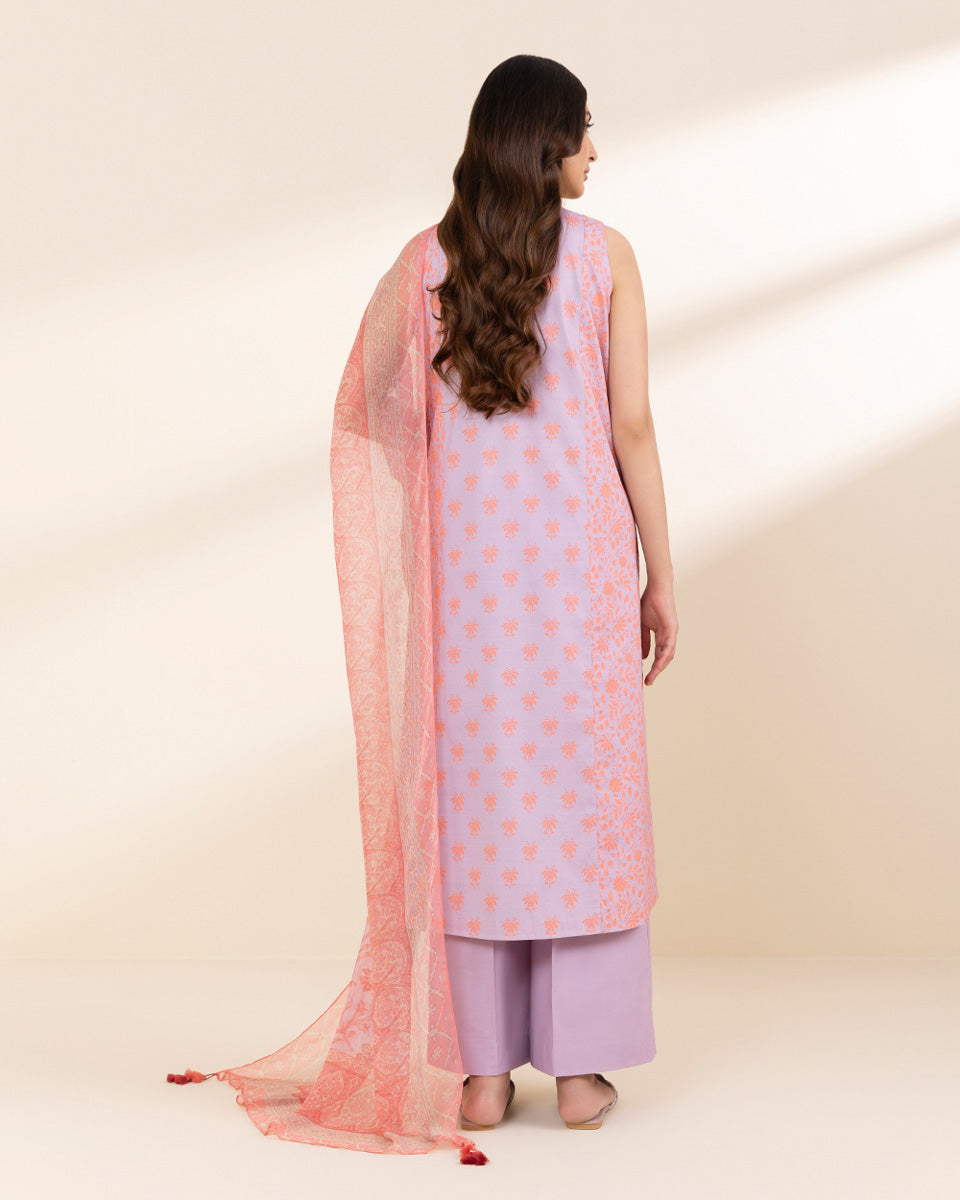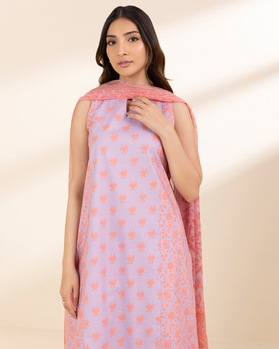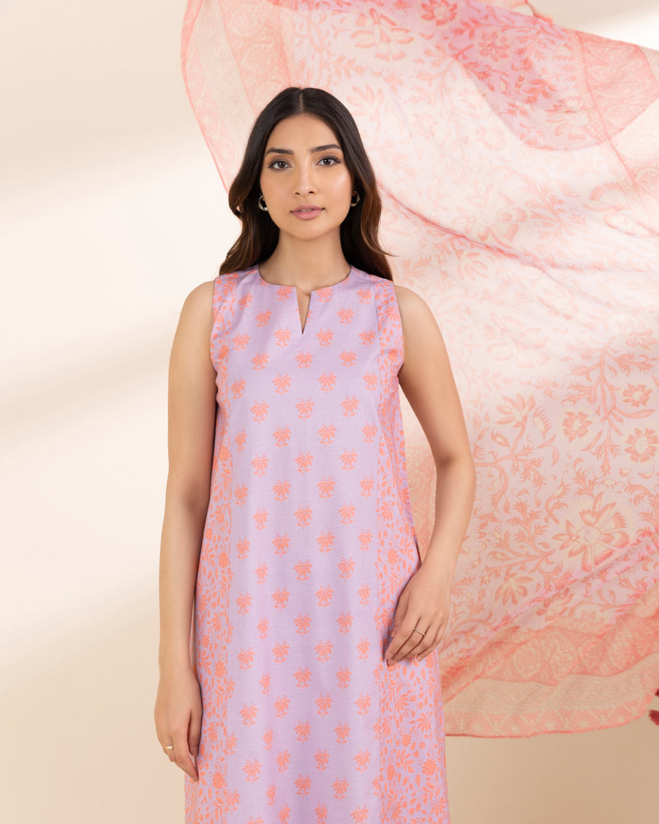 Elevate your summer style with our two-piece printed ensemble, featuring a lilac and coral lawn shirt paired with a matching blended chiffon dupatta.