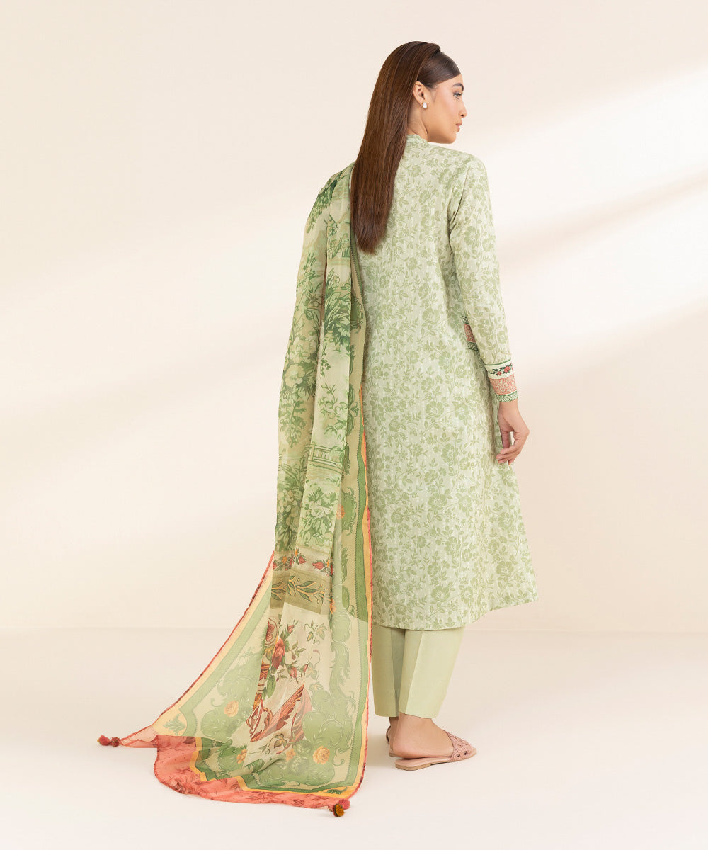 Elevate your style with our three-piece printed ensemble, featuring a pistachio green lawn shirt and cotton trousers paired with a lime green blended tissue dupatta.