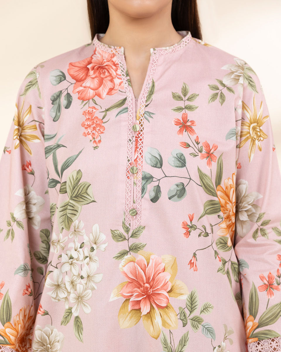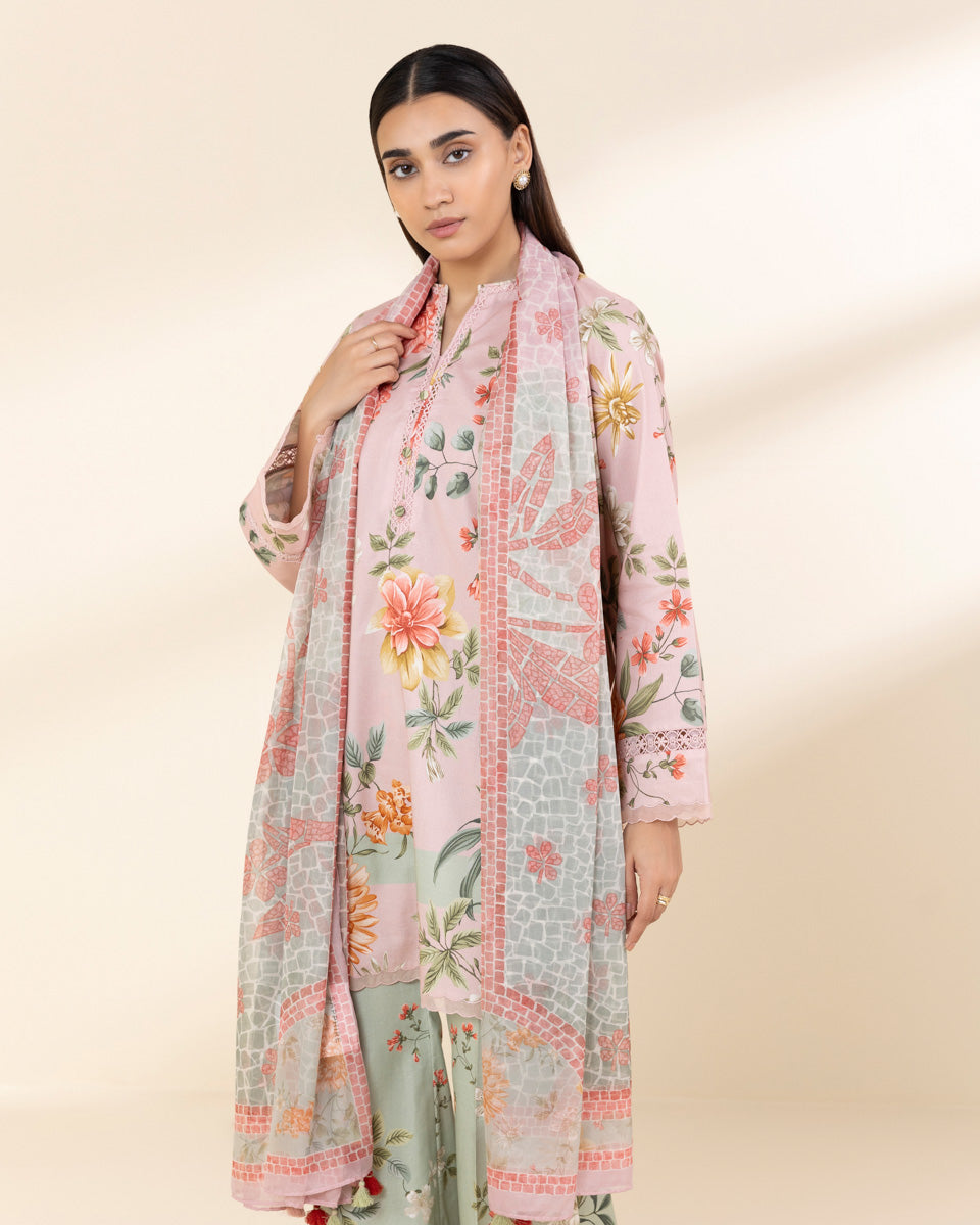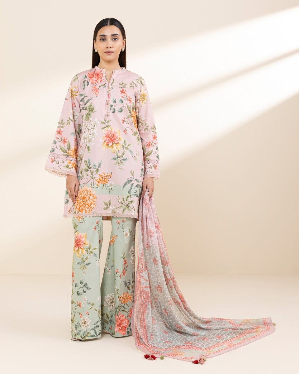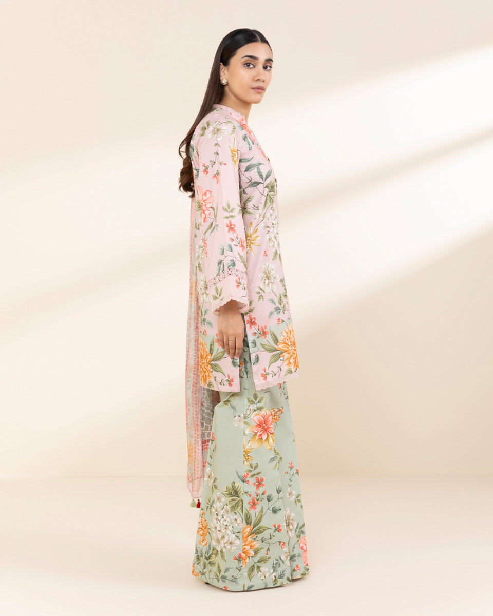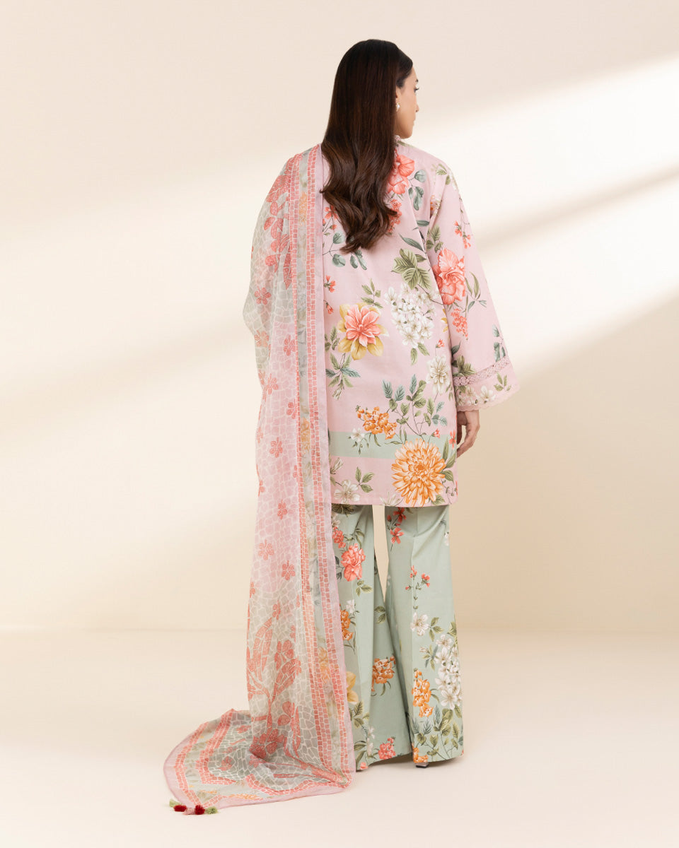 Step out in style in our printed pink and mint green lawn shirt and cotton trousers ensemble with a matching blended tissue dupatta.