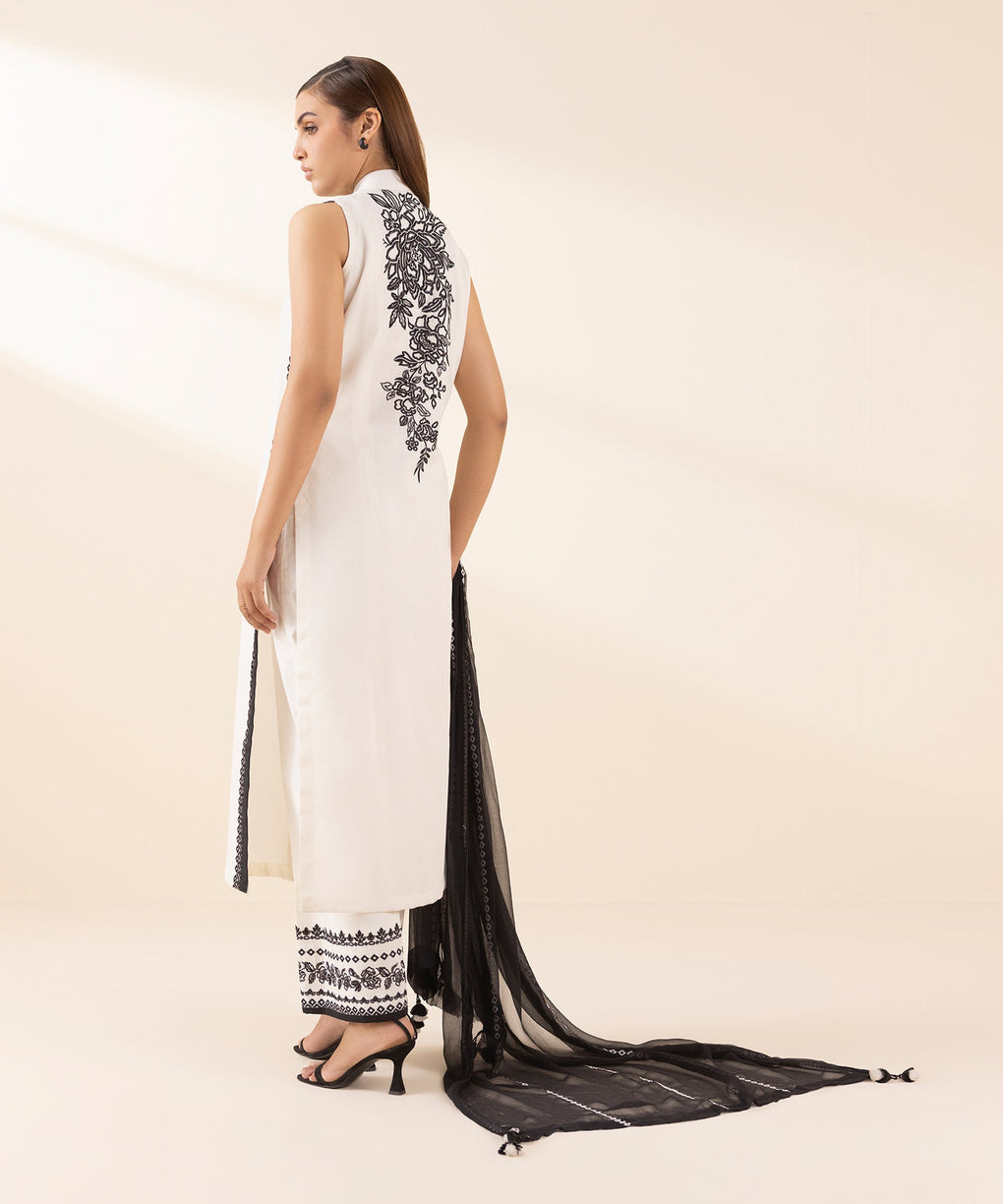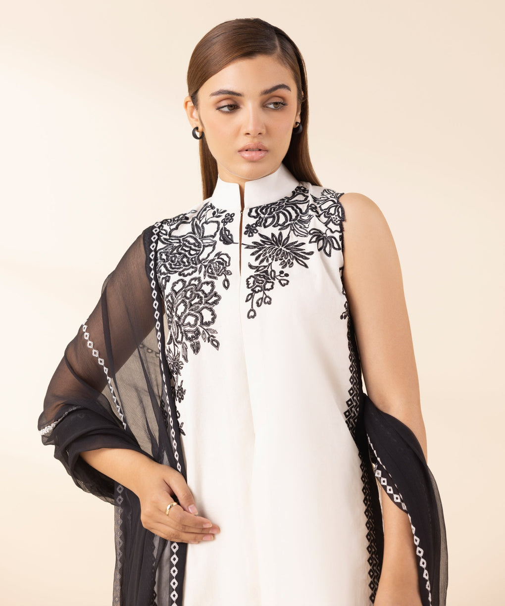 Refresh your style with our three-piece embroidered ensemble featuring a cotton jacquard shirt paired with a crinkle chiffon dupatta and dyed cotton trousers.