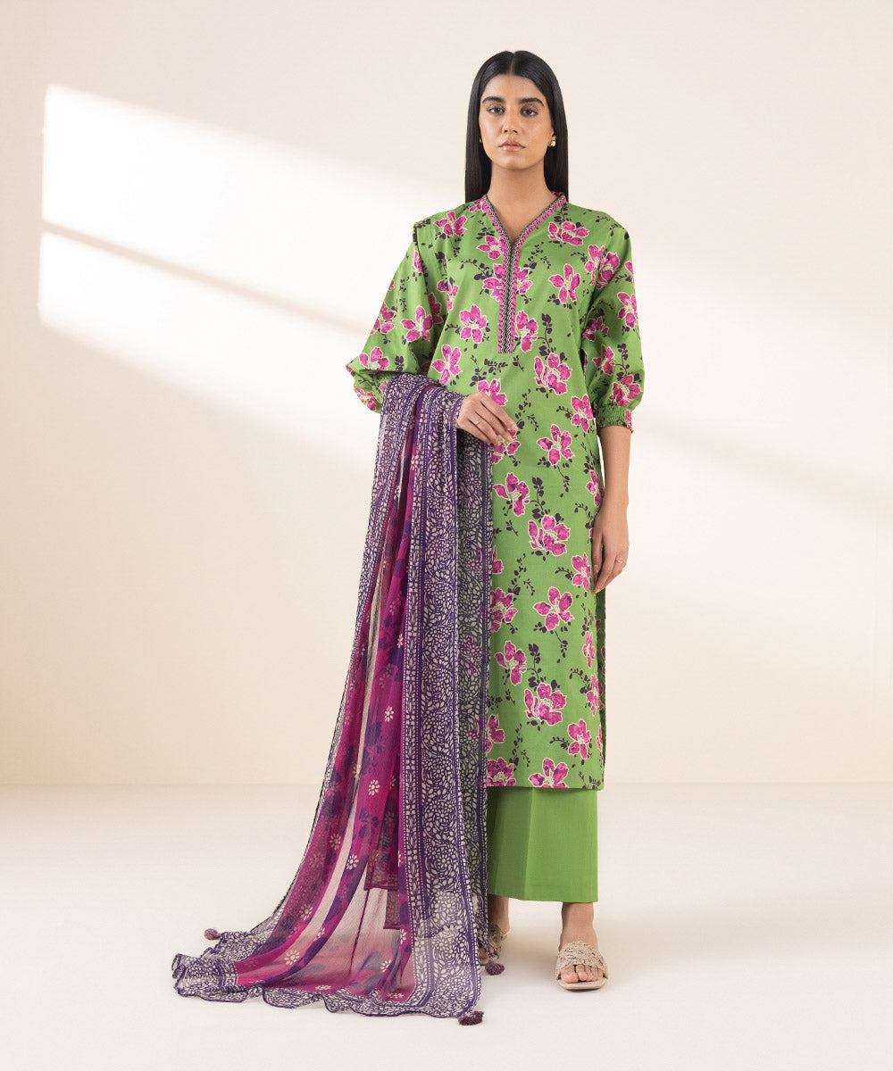 Elevate your everyday style in our kelly green and dark fuchsia printed, lawn shirt and blended chiffon dupatta fabric.