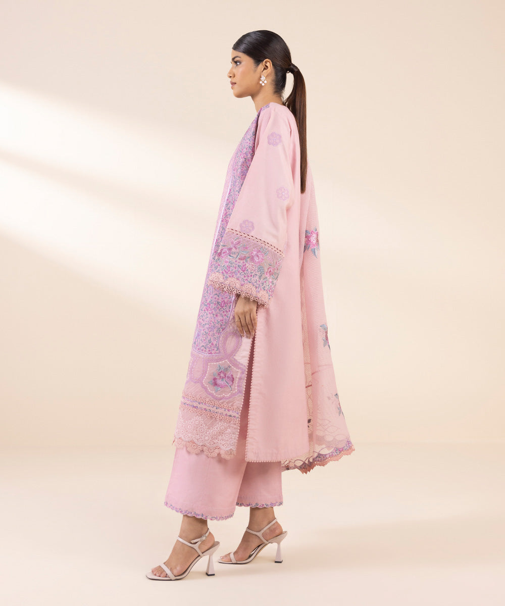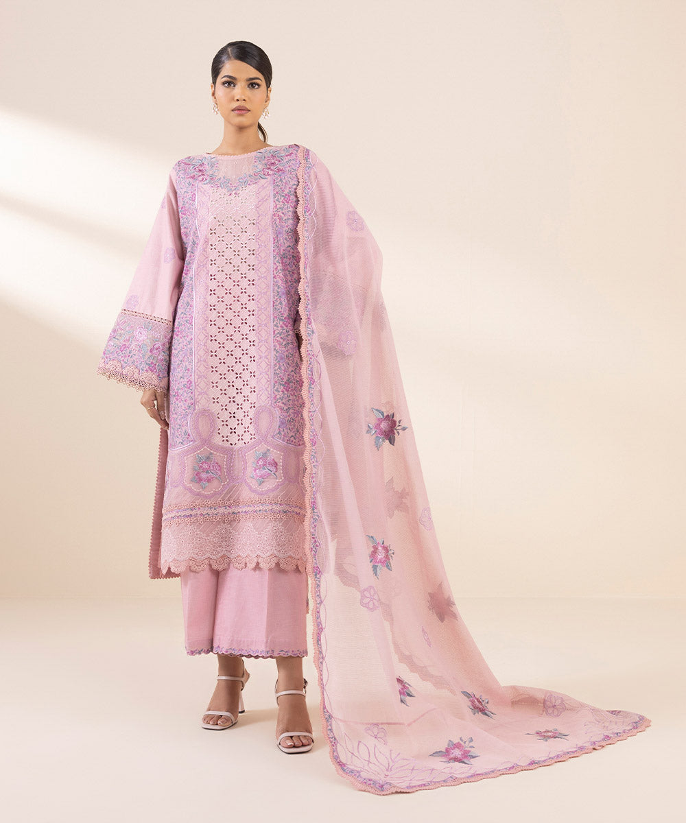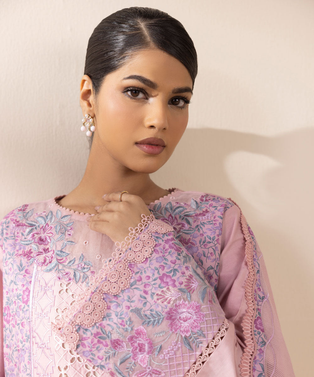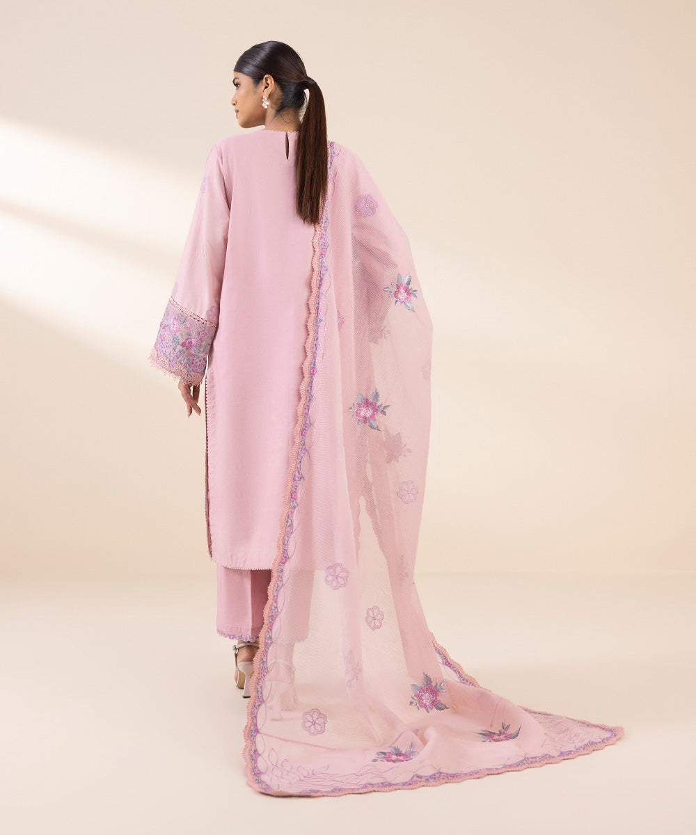 Make a statement with our three-piece ensemble in powder pink featuring a dyed embroidered cotton satin shirt and trousers paired with a textured karandi dupatta.
