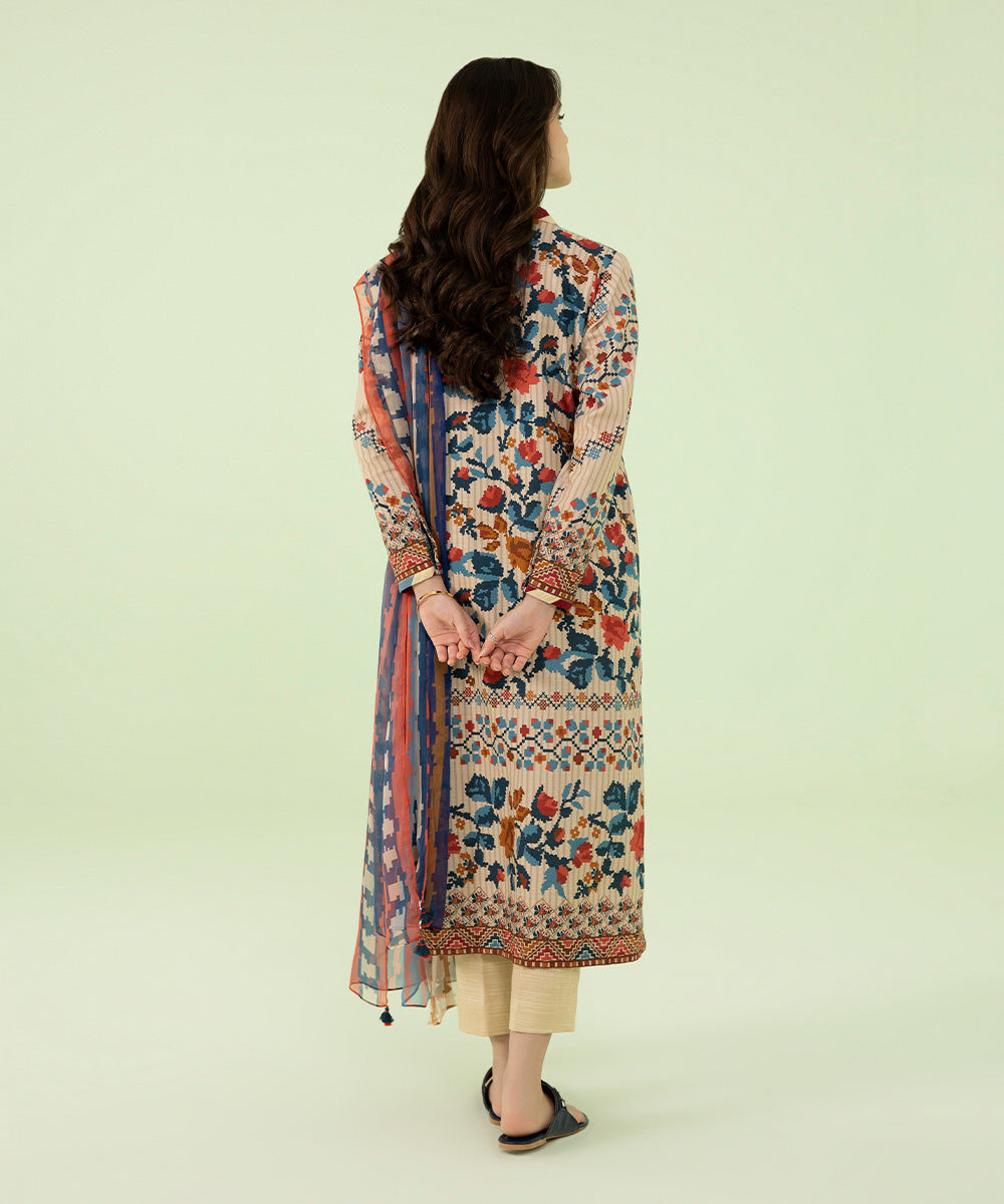 For a contemporary allure adorn our floral patterned three-piece ensemble in off white paired with a Lawn dupatta.