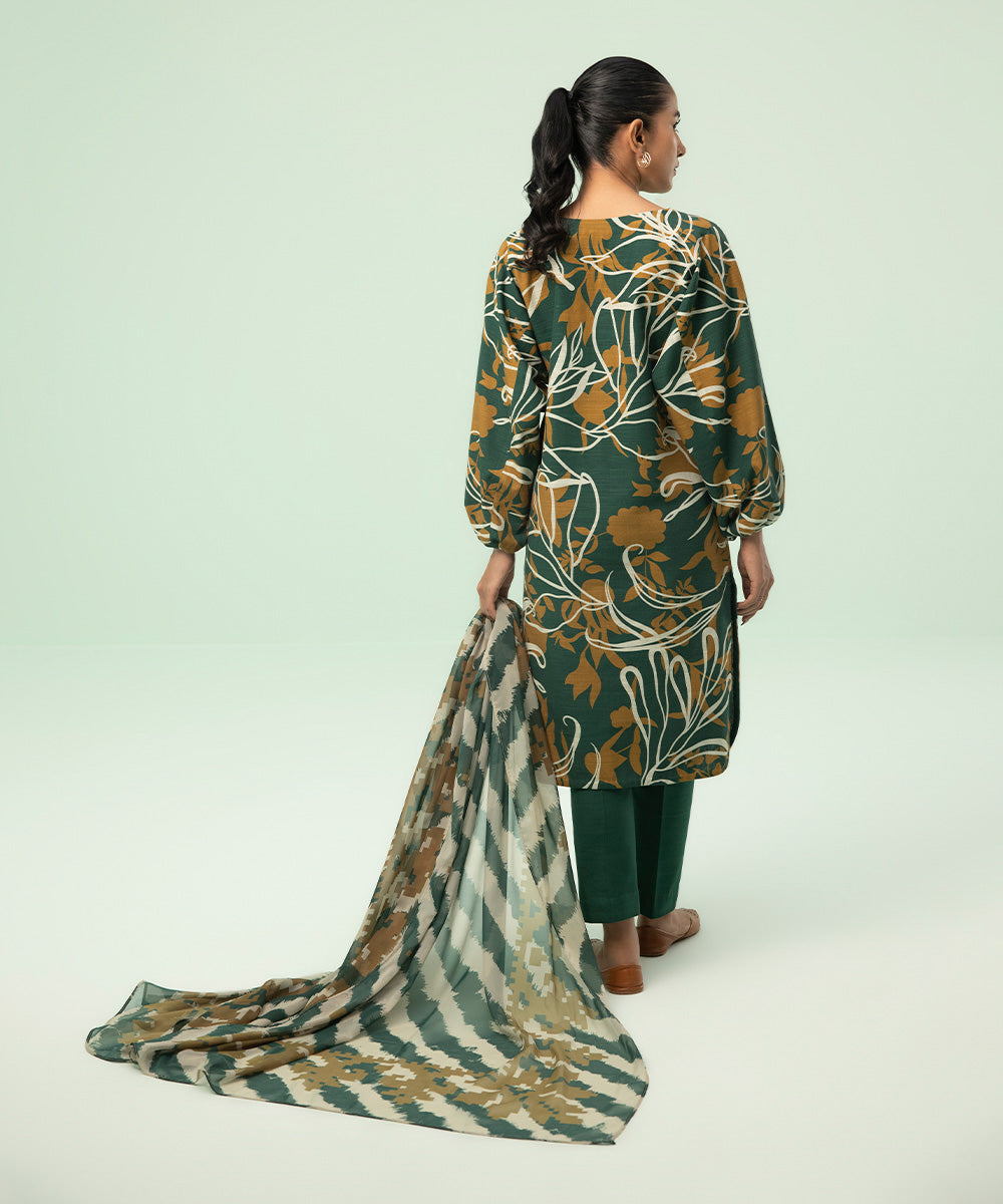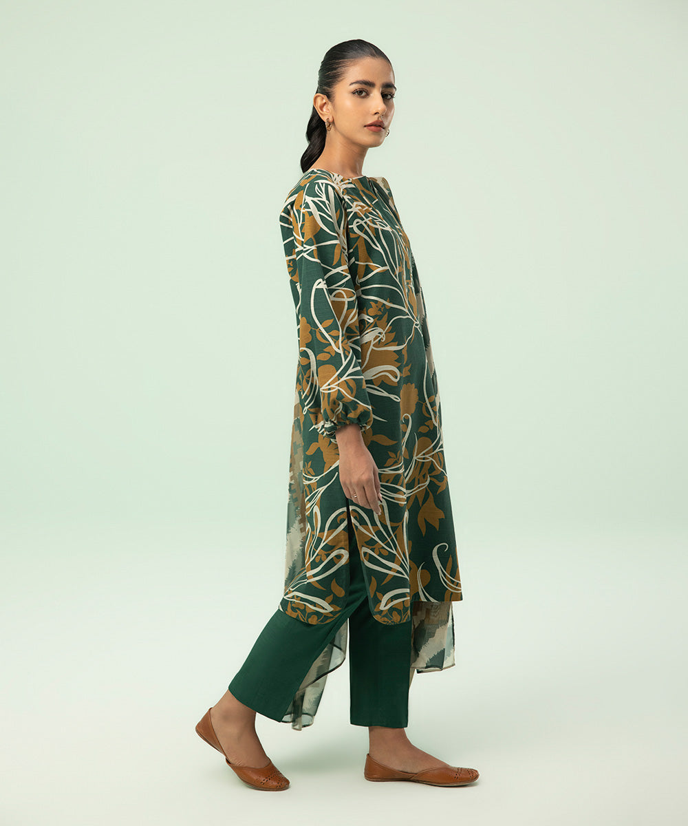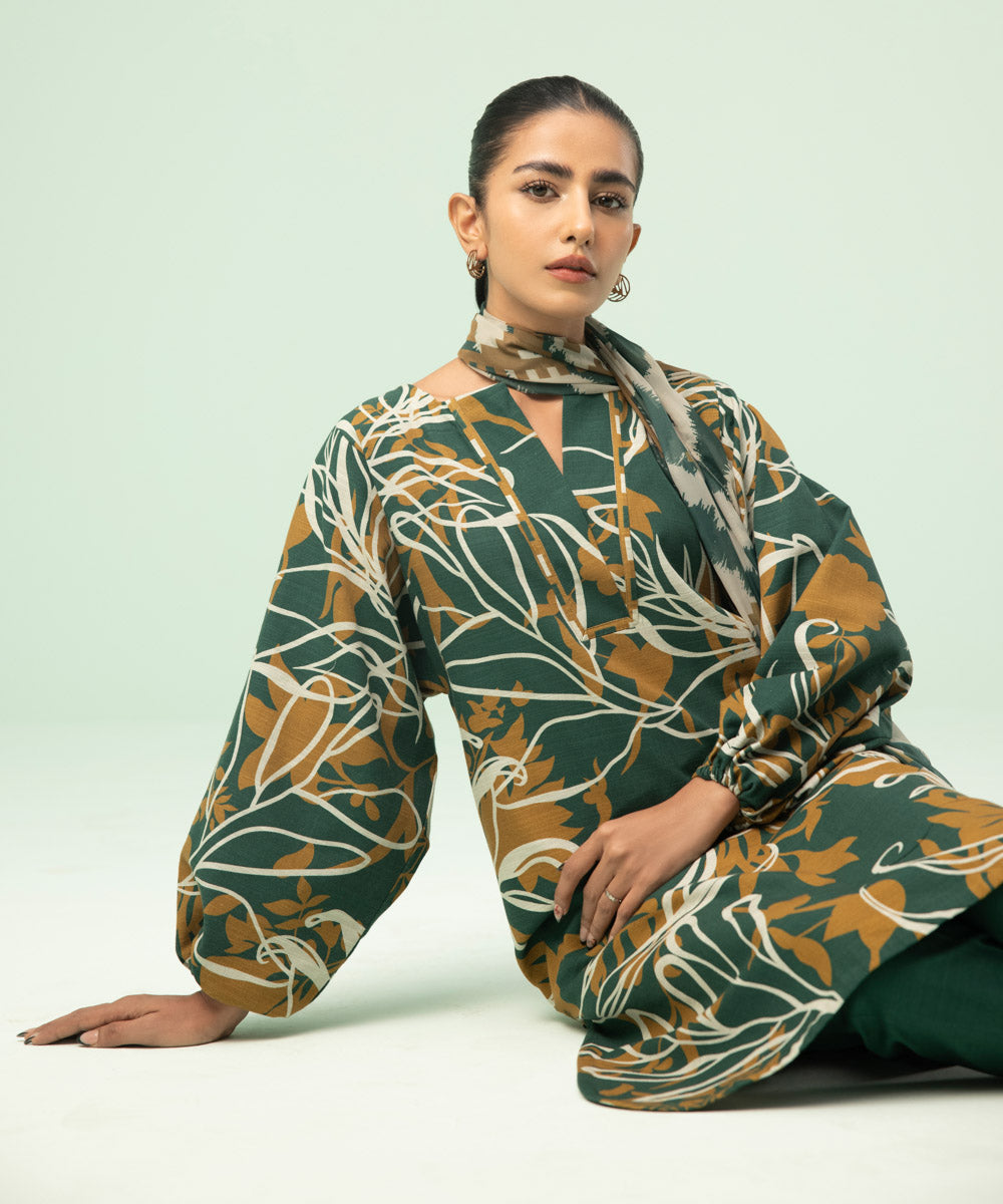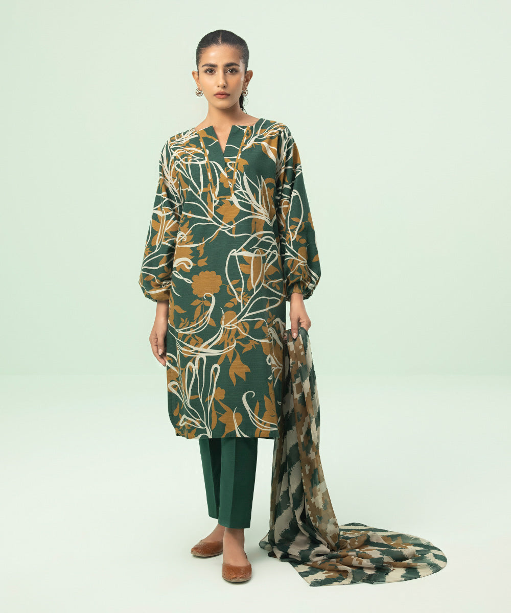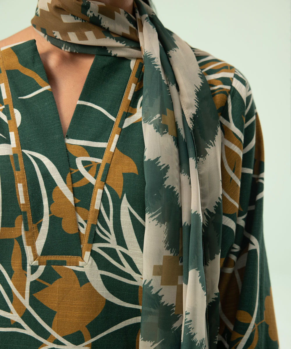 Our green floral tale of three-piece ensemble captivates at first sight paired with a poly tissue dupatta.