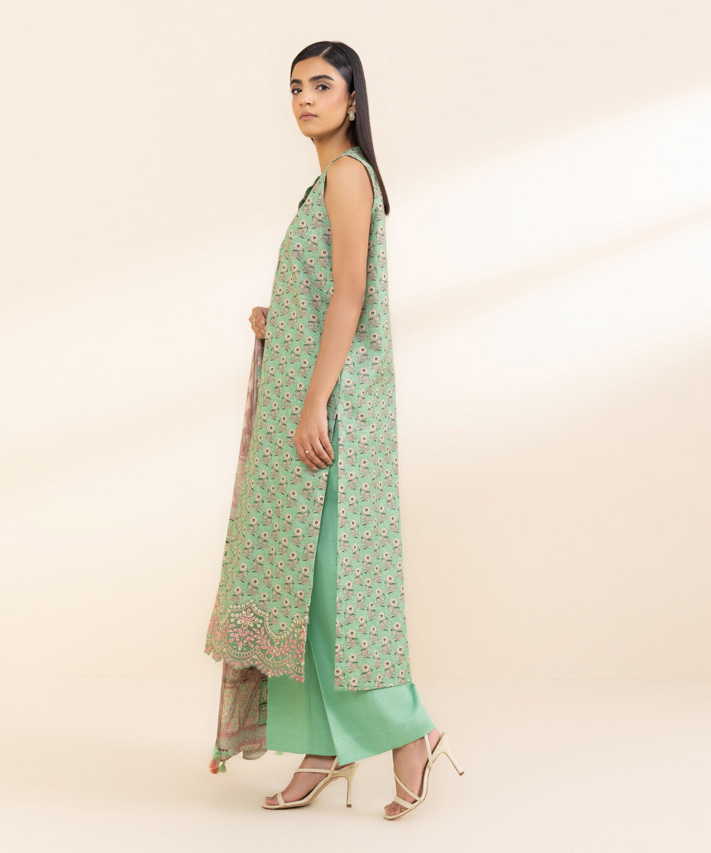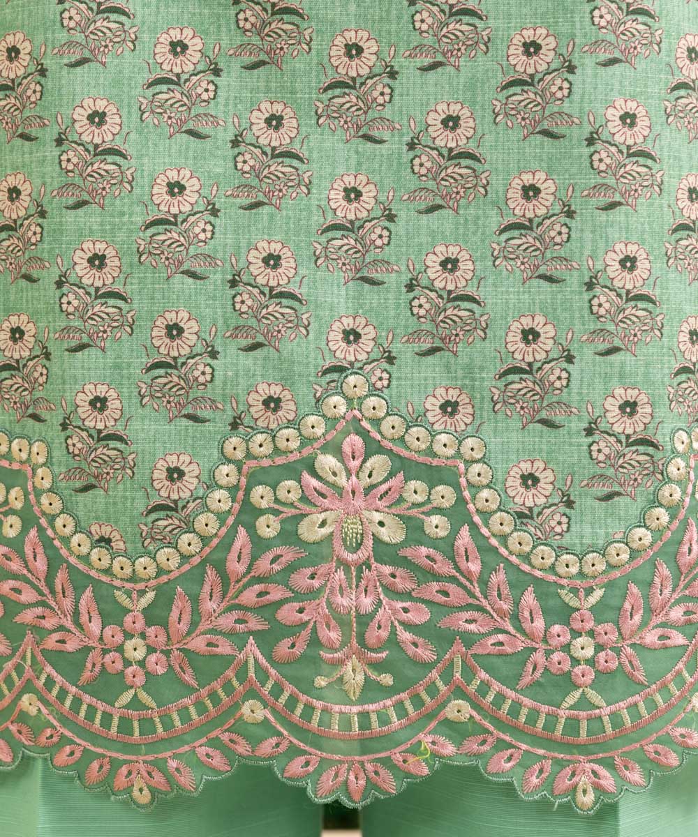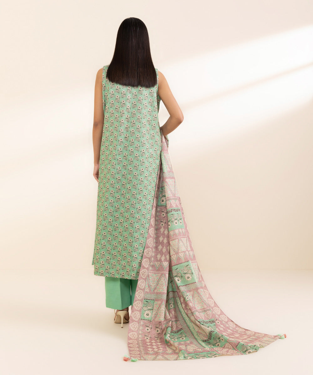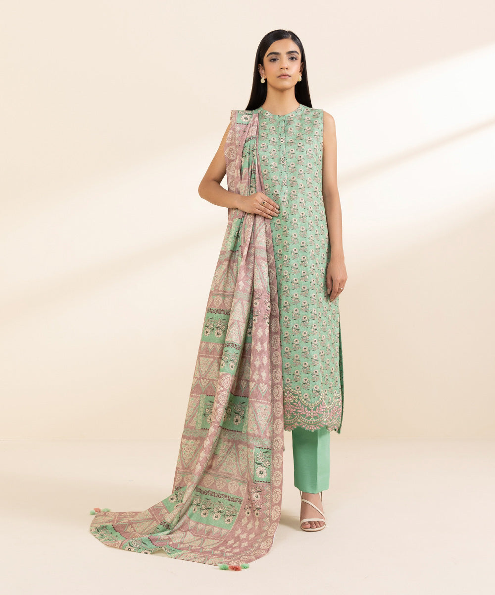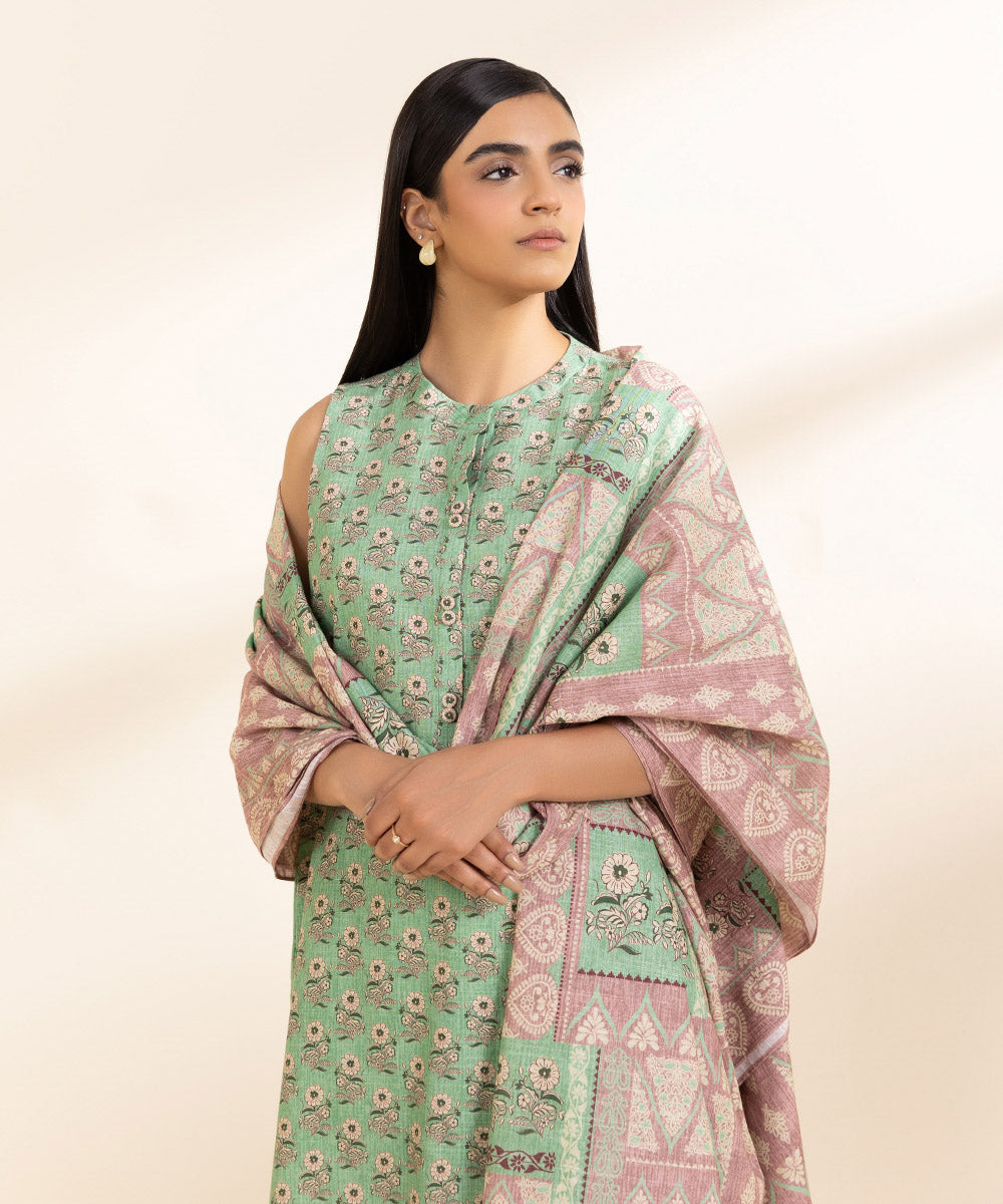 Embrace mild winter season in our pistachio green and pink three-piece featuring light khaddar shirt, trousers and dupatta.