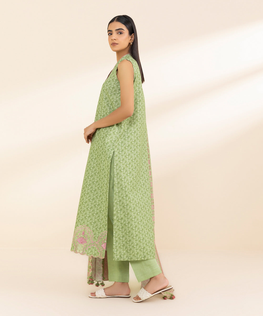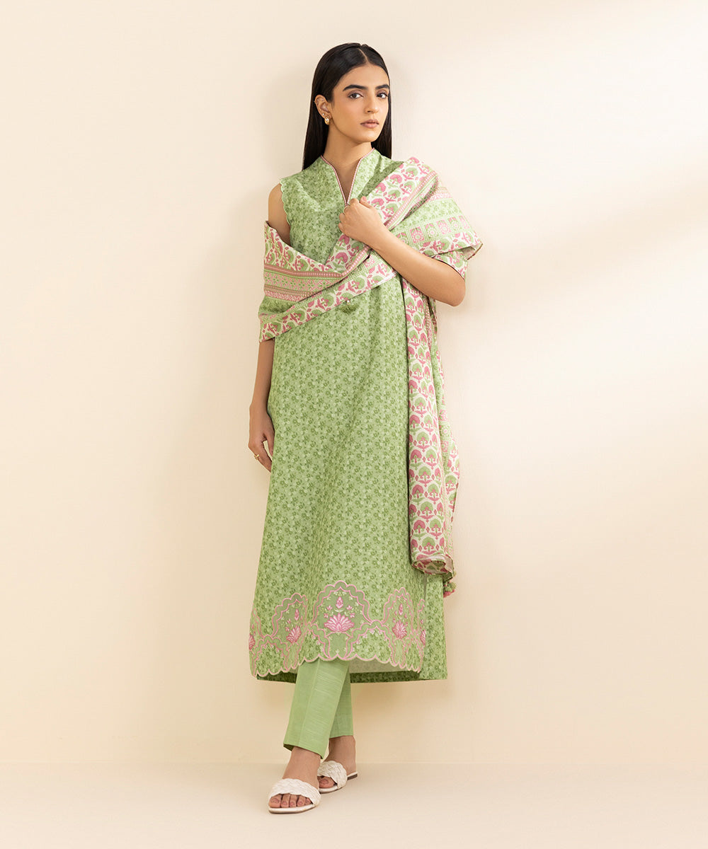 Make a floral statement with our embroidered three-piece light khaddar ensemble in pastel green and pink.