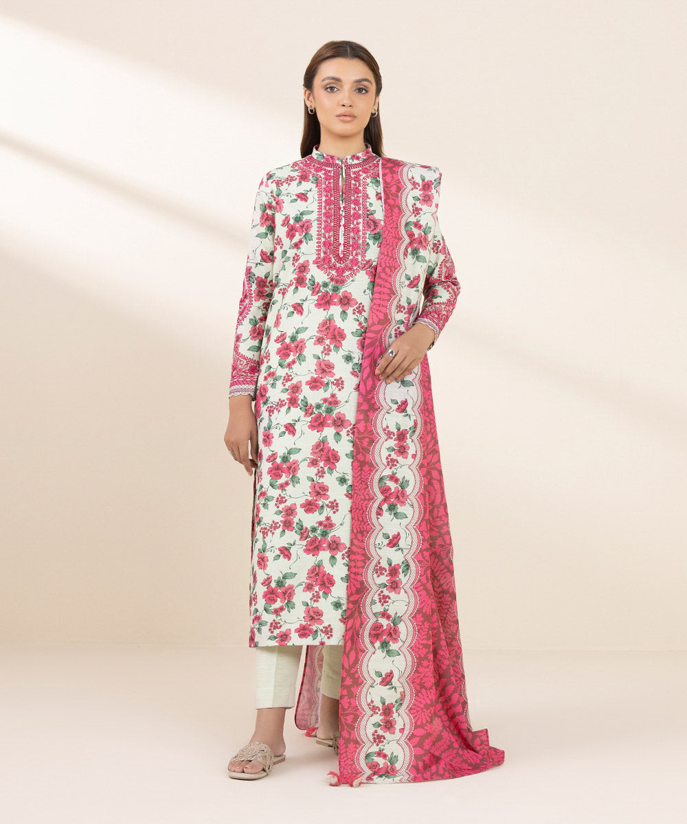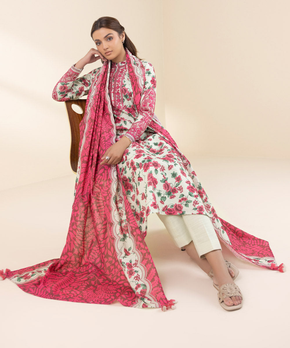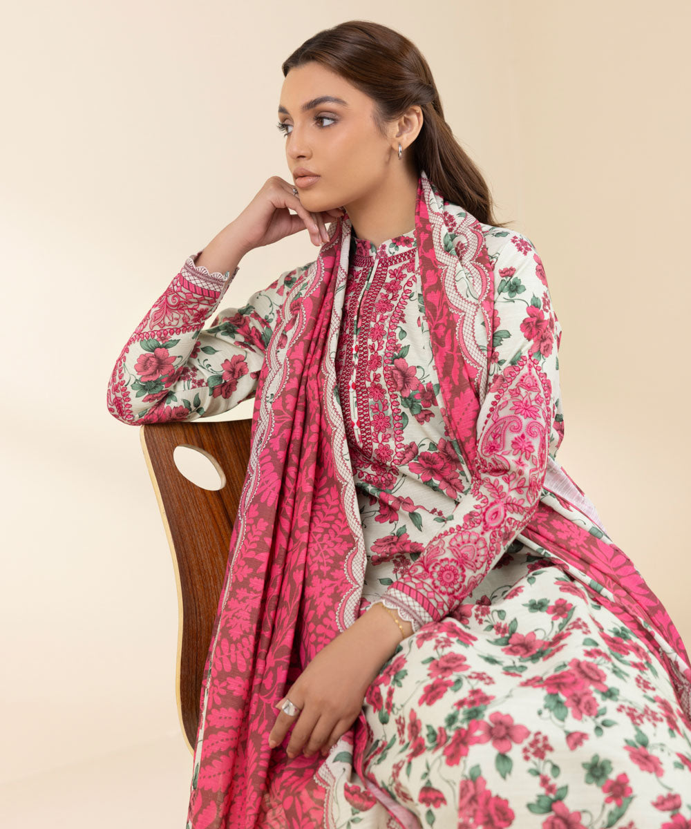 Make a floral statement with our embroidered three-piece khaddar ensemble in off-white and fuchsia pink.