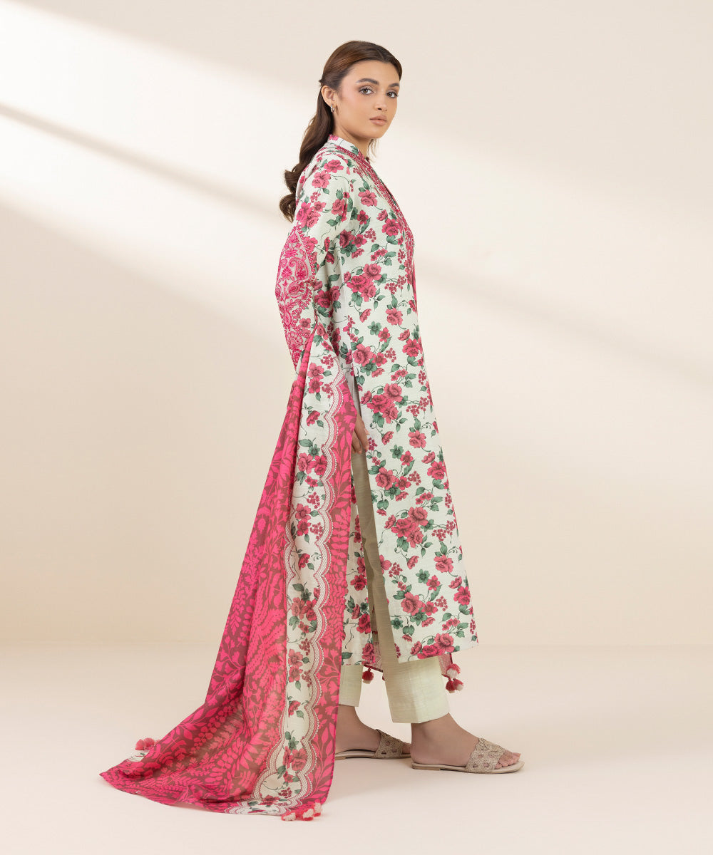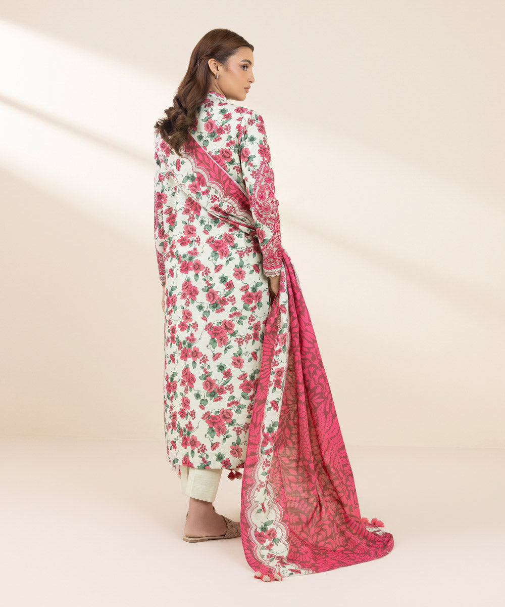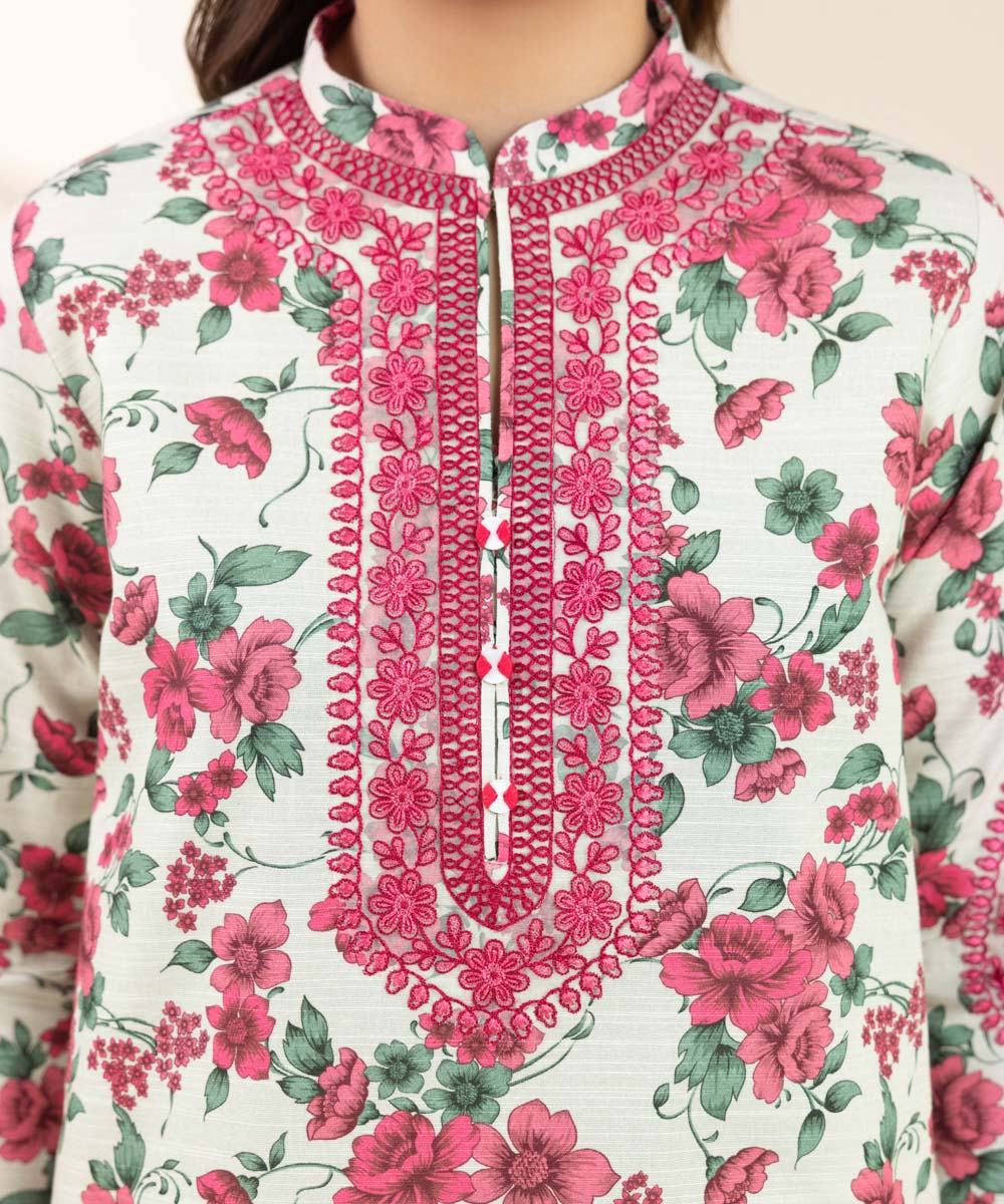 Make a floral statement with our embroidered three-piece khaddar ensemble in off-white and fuchsia pink.
