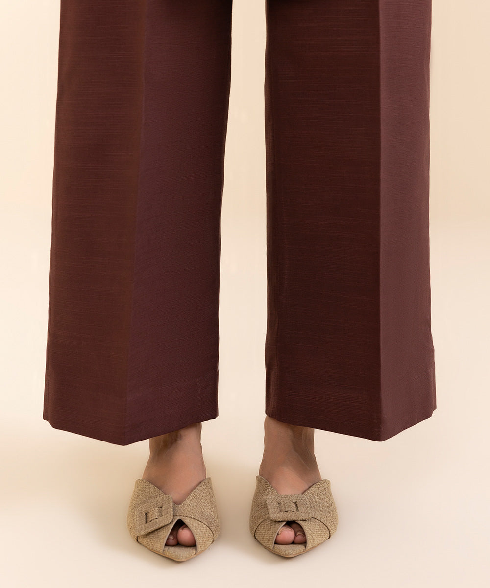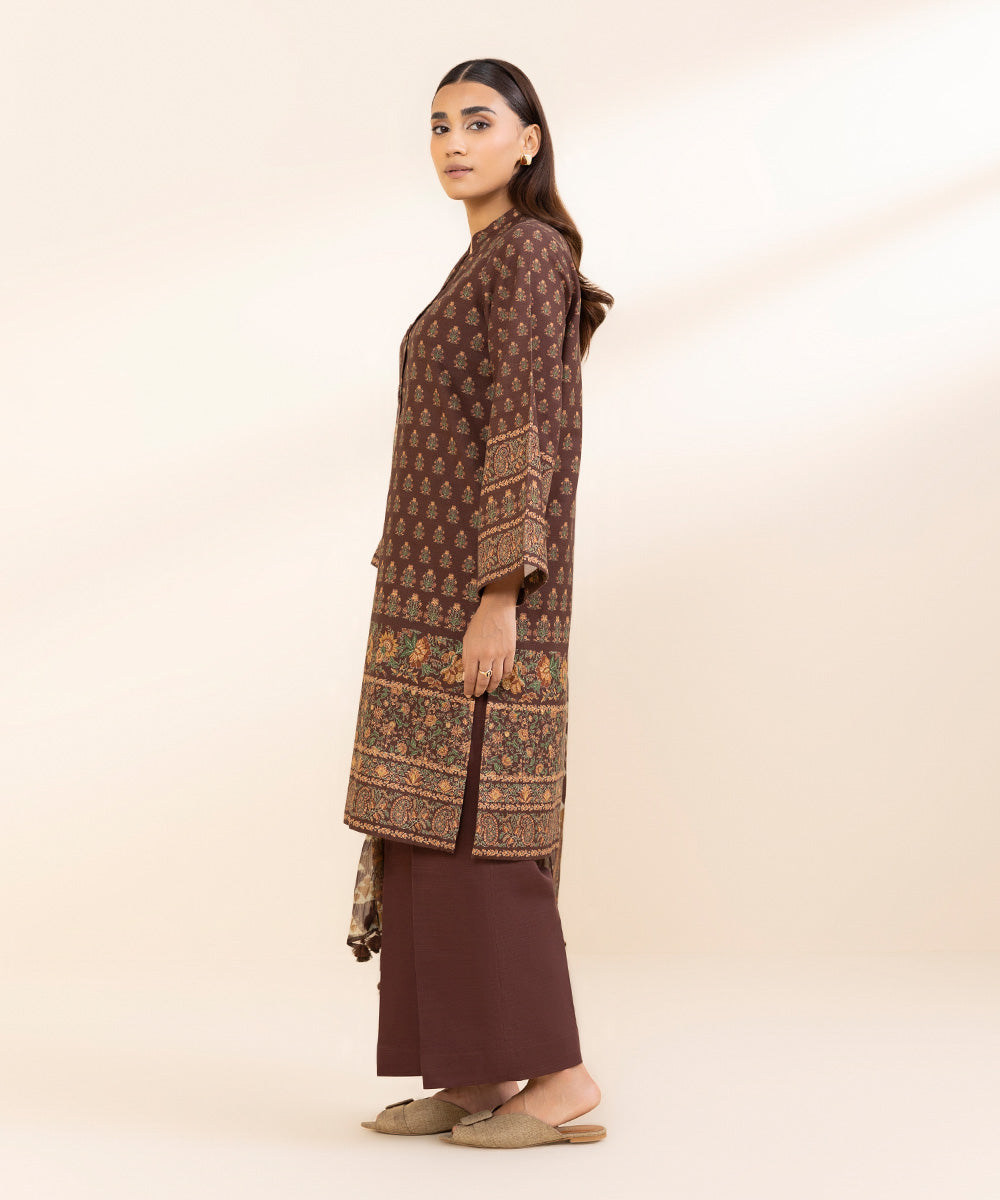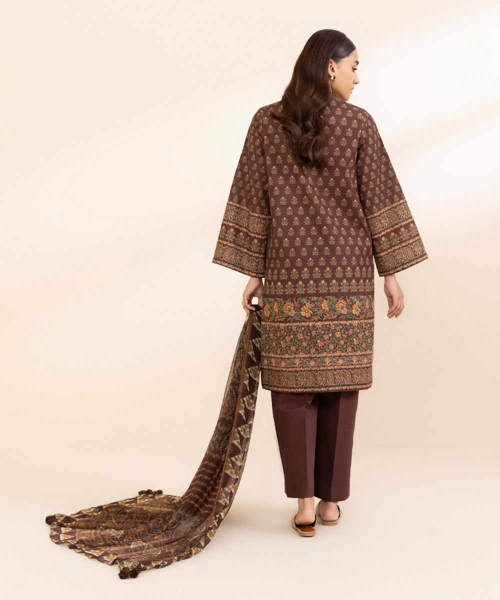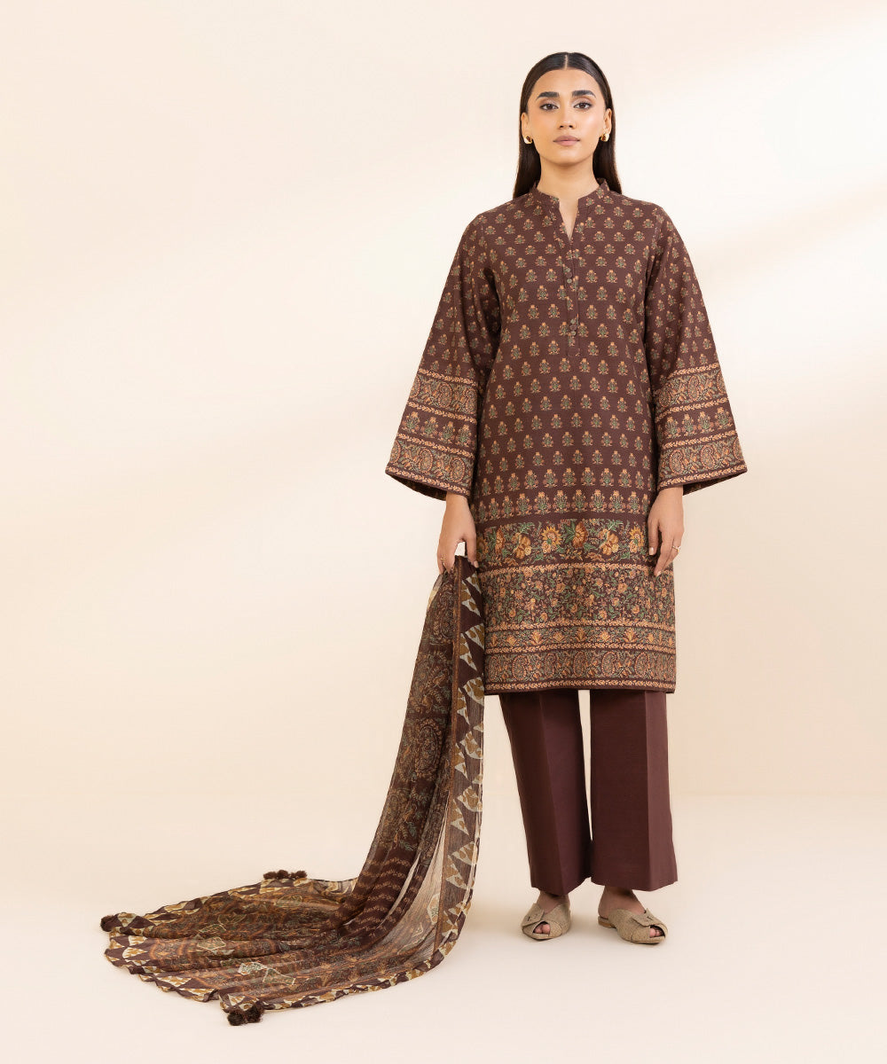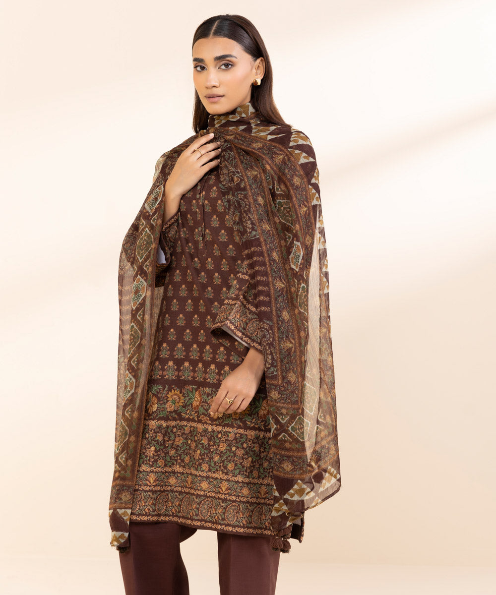 Curate the perfect winter outfit with our two-piece dark brown printed khaddar suit with a blended chiffon dupatta.