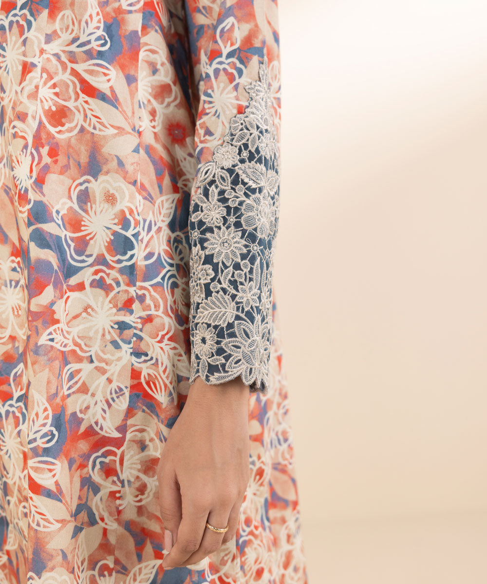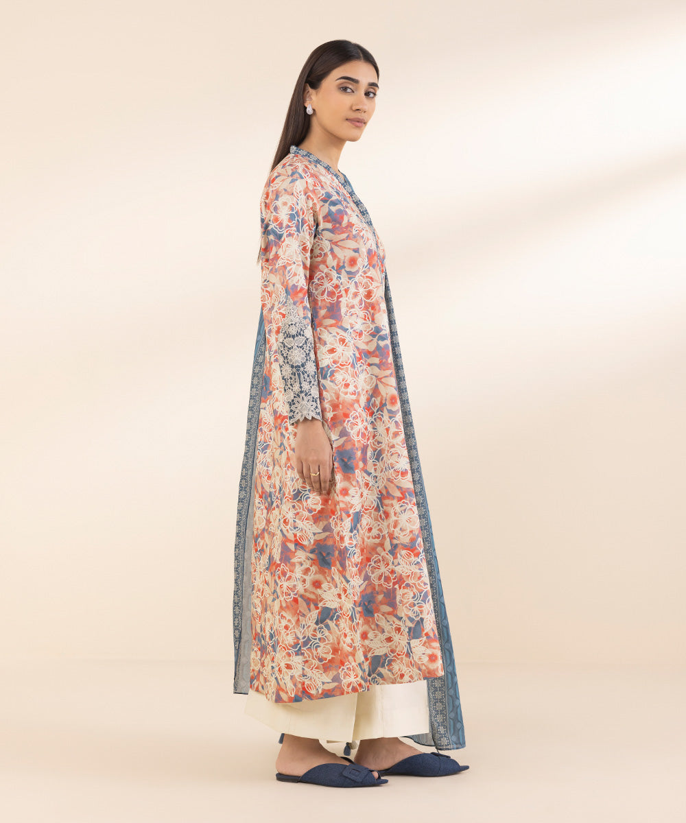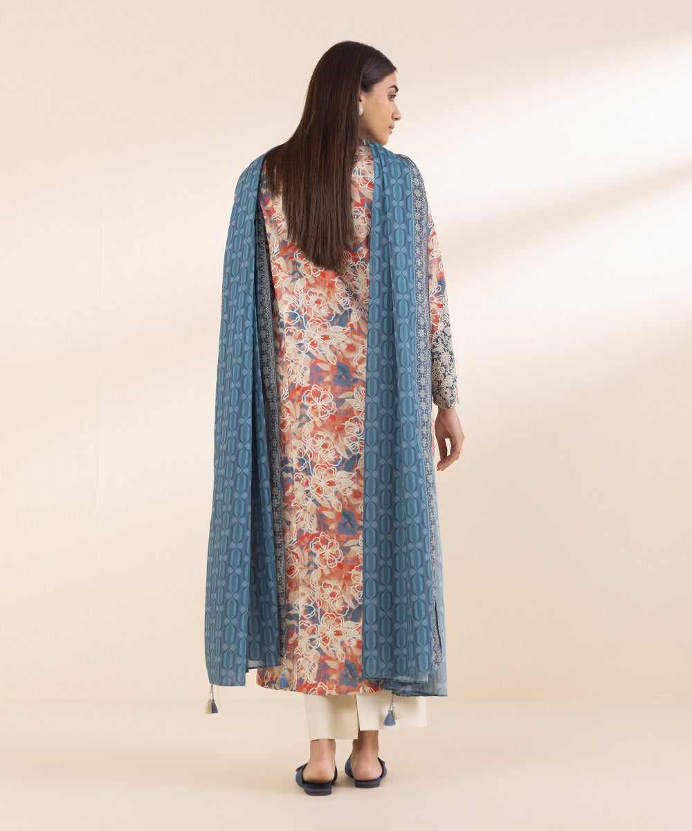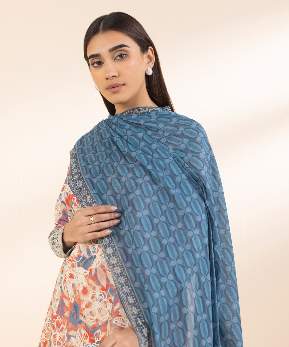 Make a statement with our three-piece embroidered ensemble in multicolours, featuring a lawn shirt, dyed cotton trousers, and a voile dupatta in steel blue.