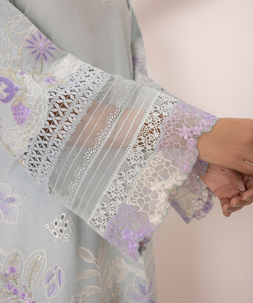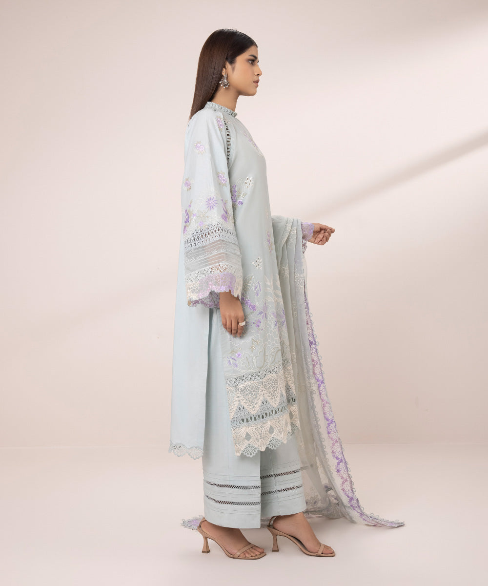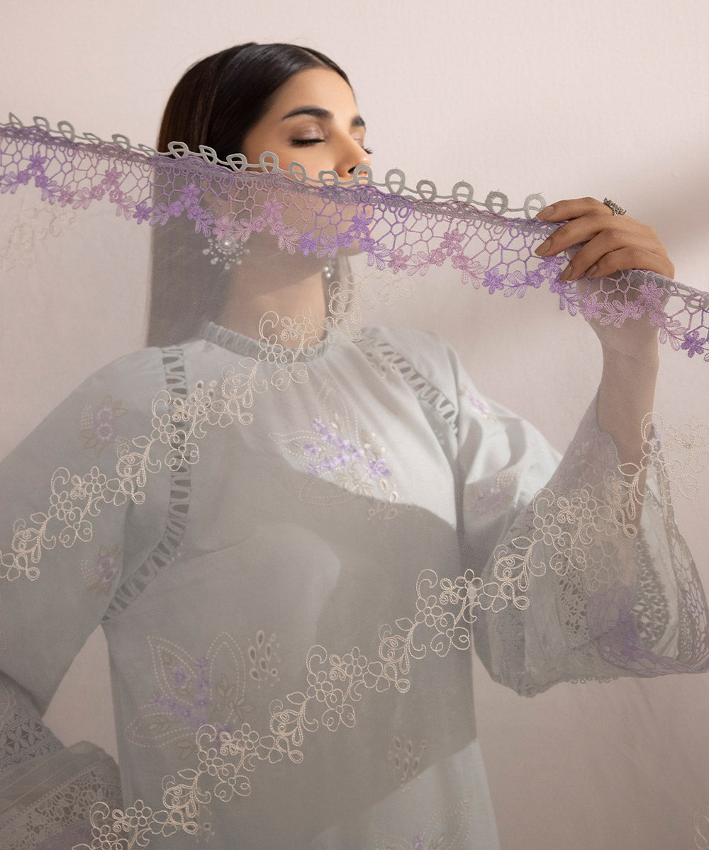 Make a statement this Eid in our sky blue embroidered two-piece featuring a cambric shirt and trouser.