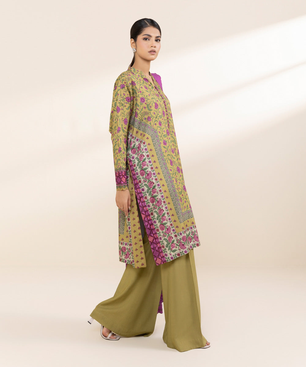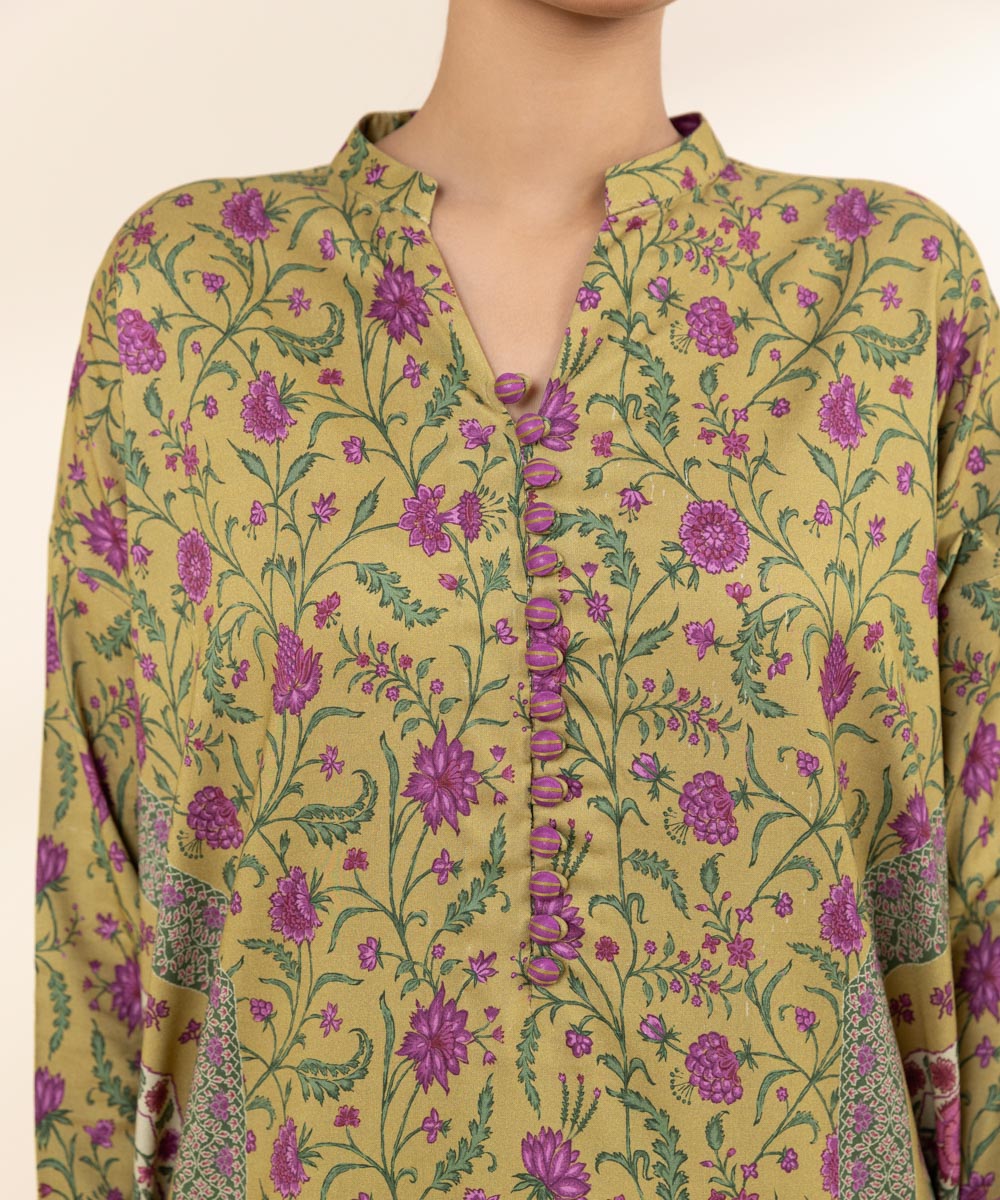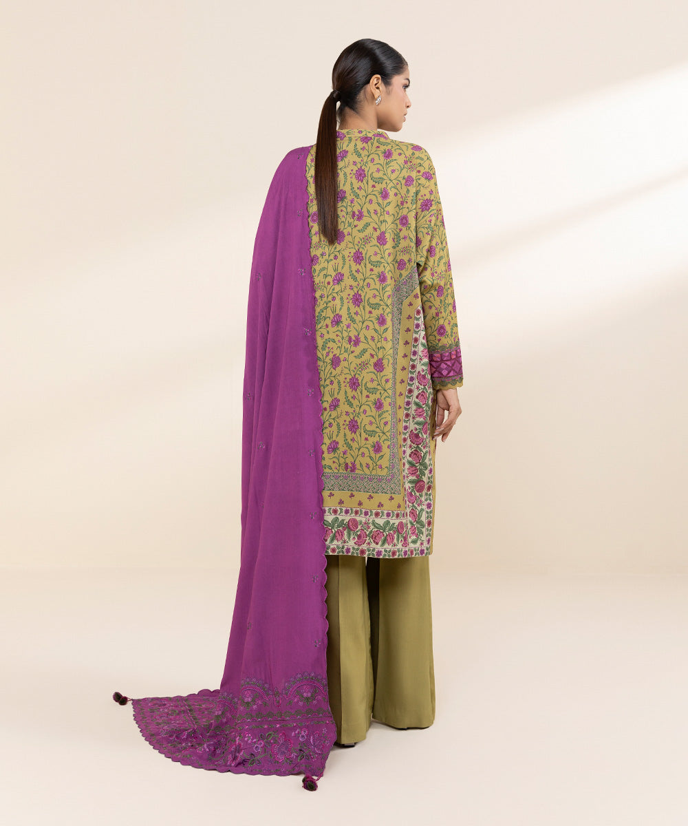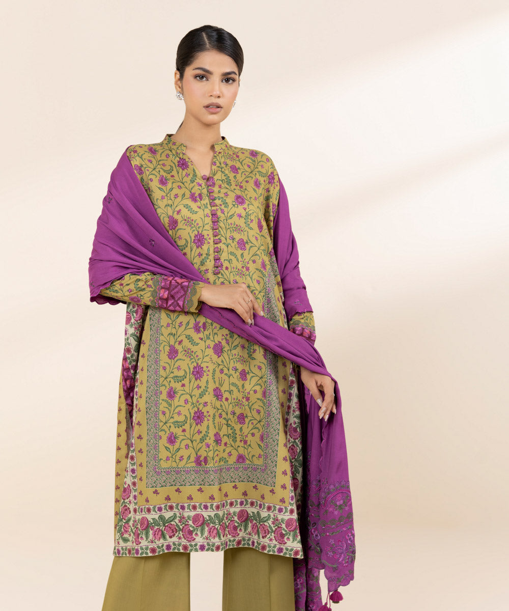Embrace winter chic in our honey mustard and purple three-piece linen printed suit, solid trousers and embroidered dupatta.