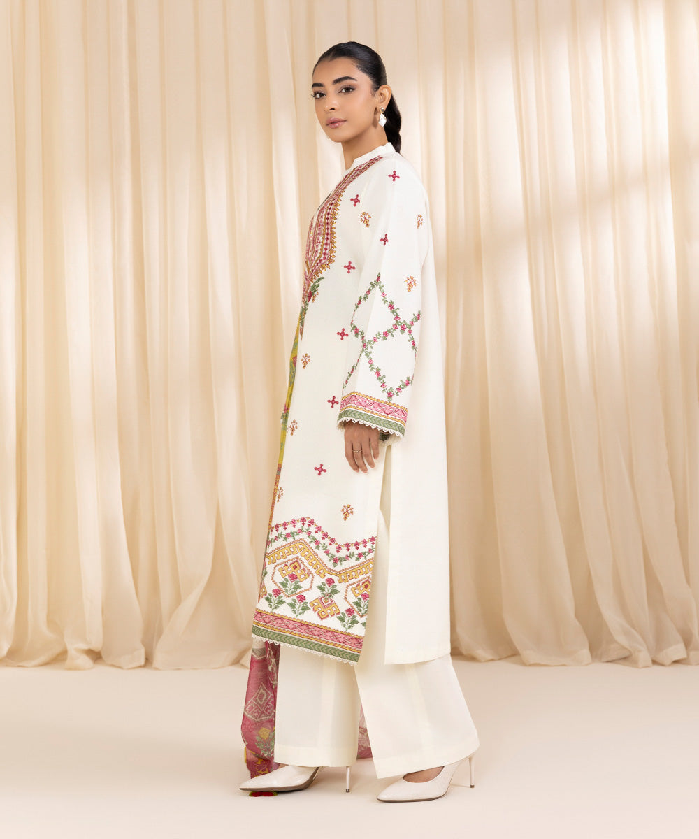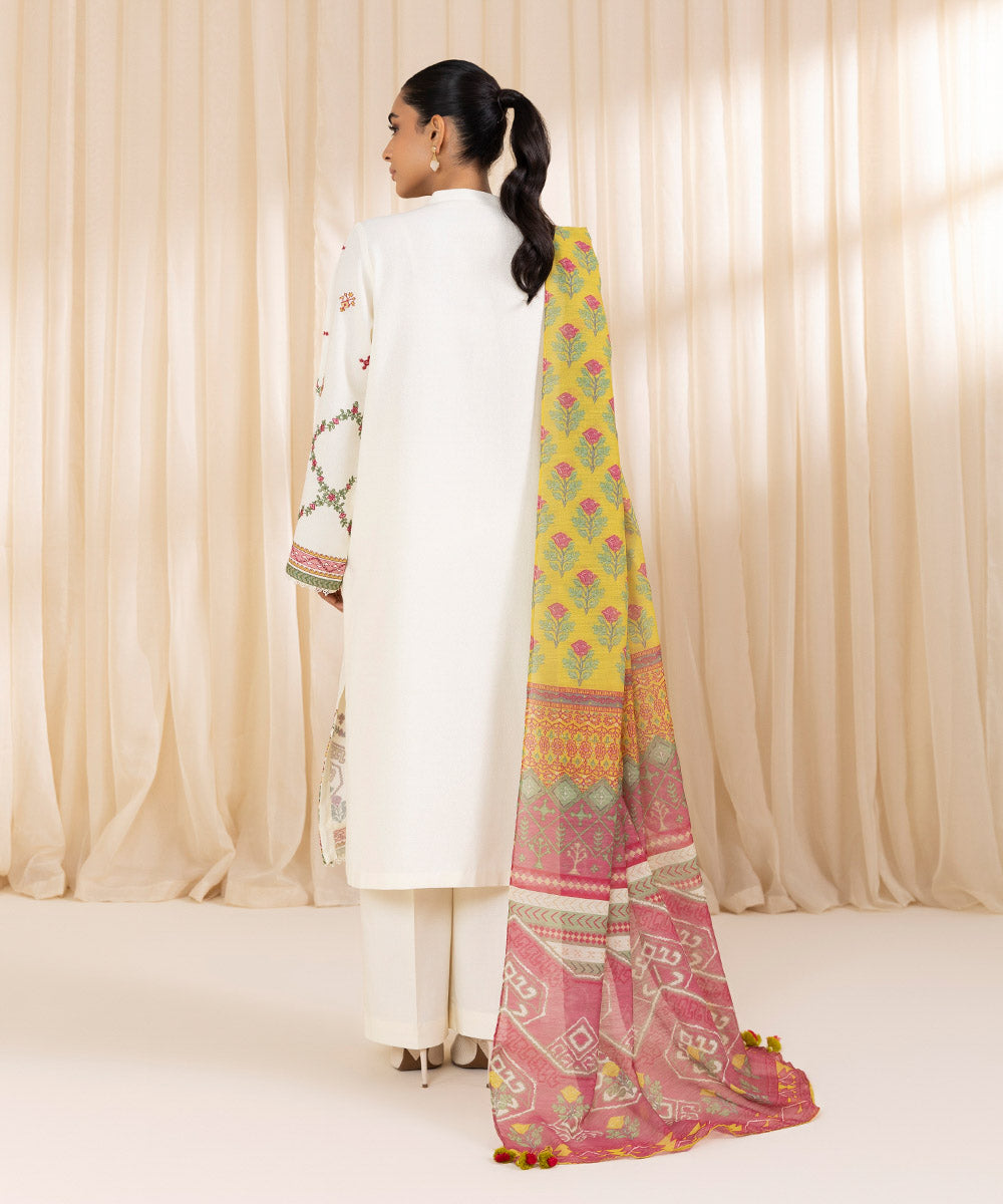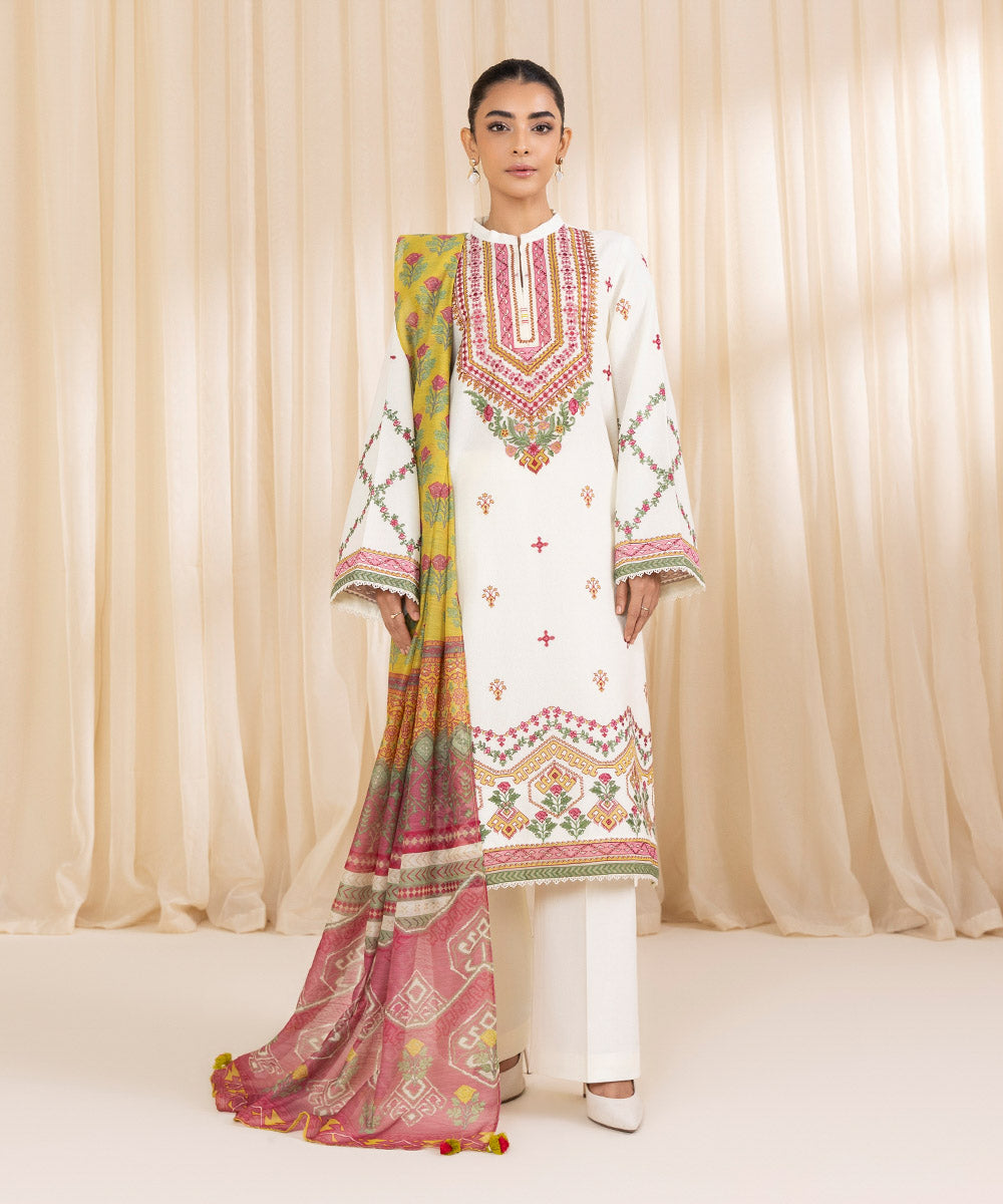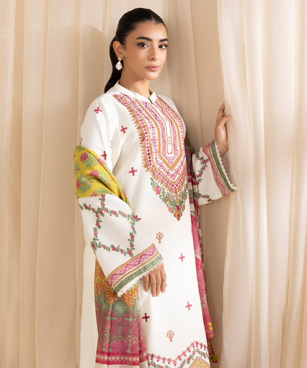 Turn heads this festive season with our three-piece embroidered ivory ensemble featuring a cotton karandi shirt, dyed trousers, and a multicoloured manar dupatta.