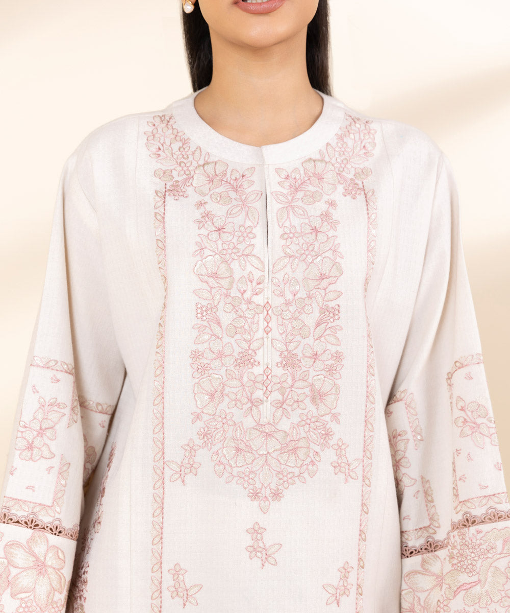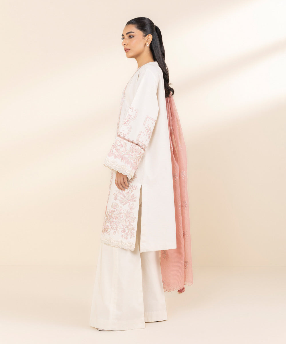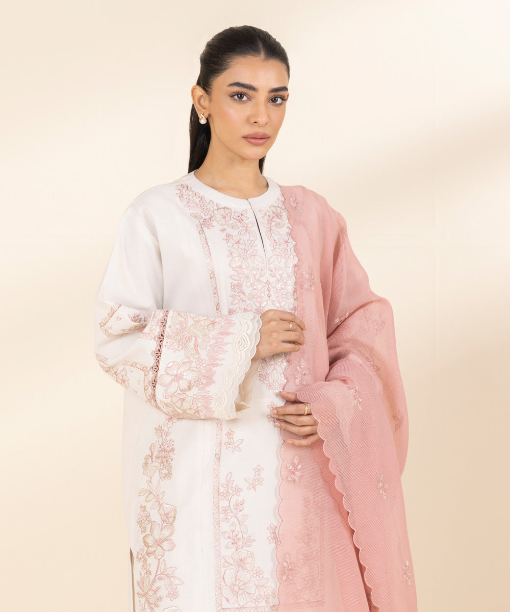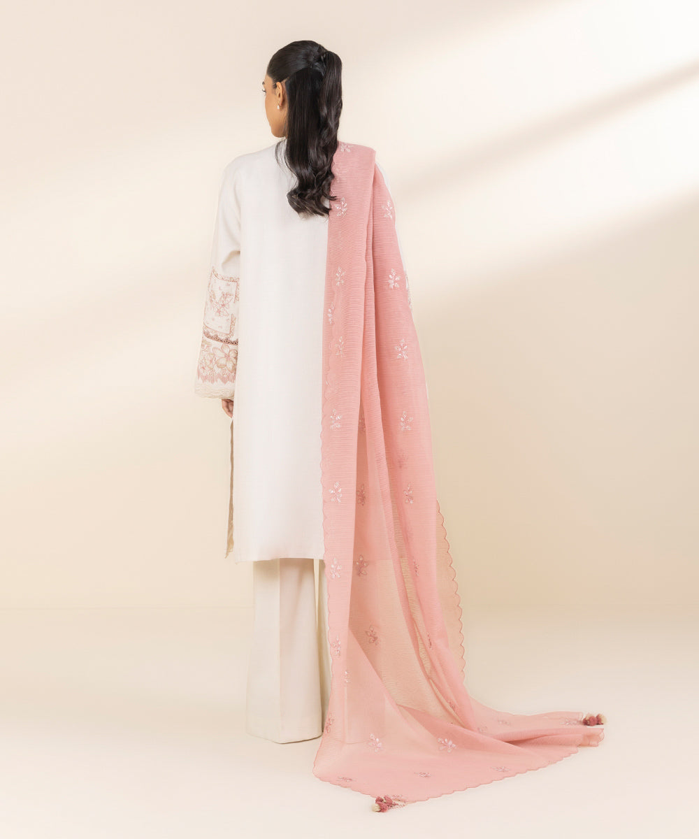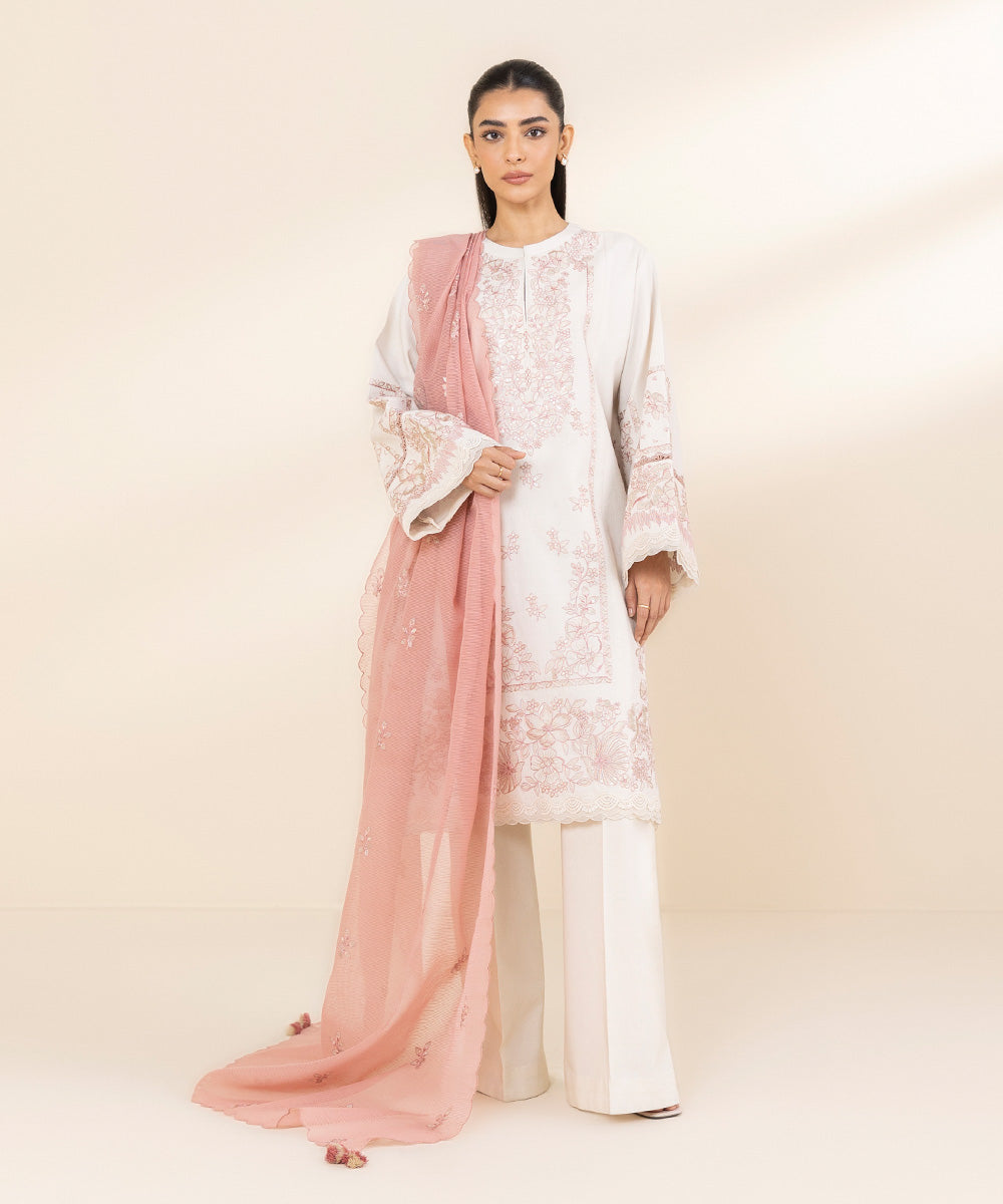 Make a statement in our off white and peachy pink dobby three piece embroidered suit with a blended textured karandi dupatta.