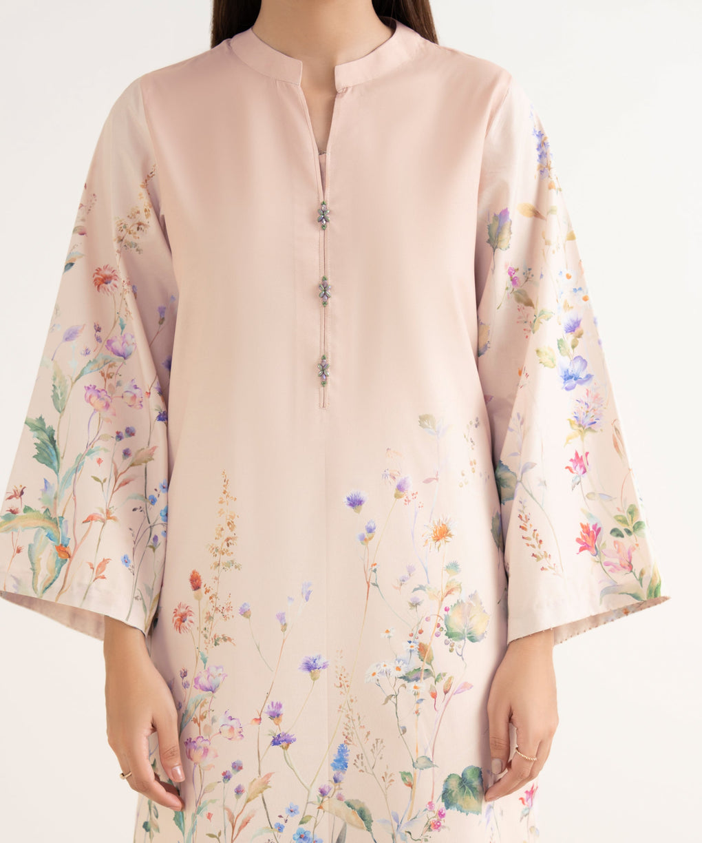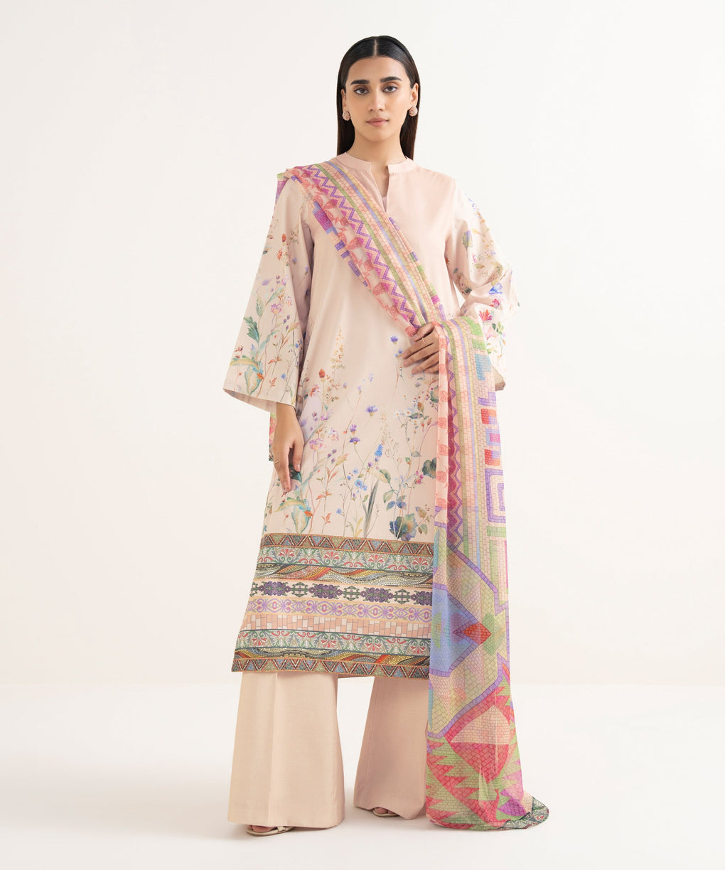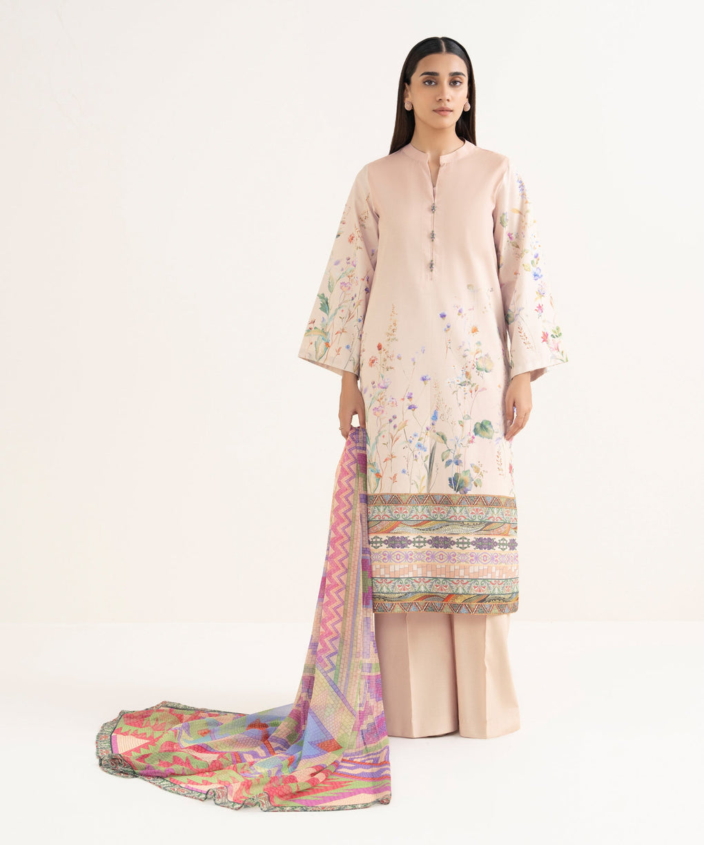 Make a statement with our three-piece printed pastel pink ensemble featuring a lawn shirt paired with a blended chiffon dupatta and cotton trousers.