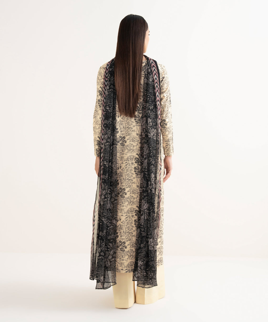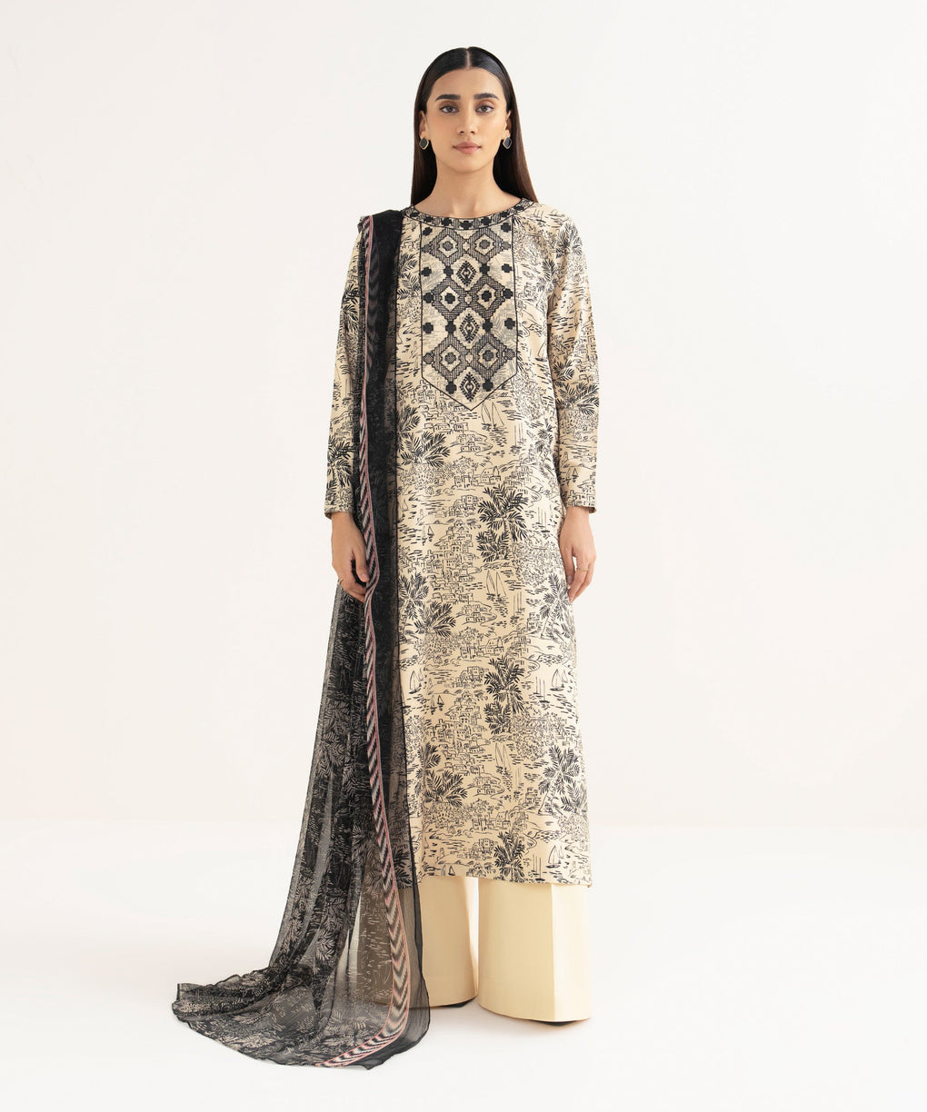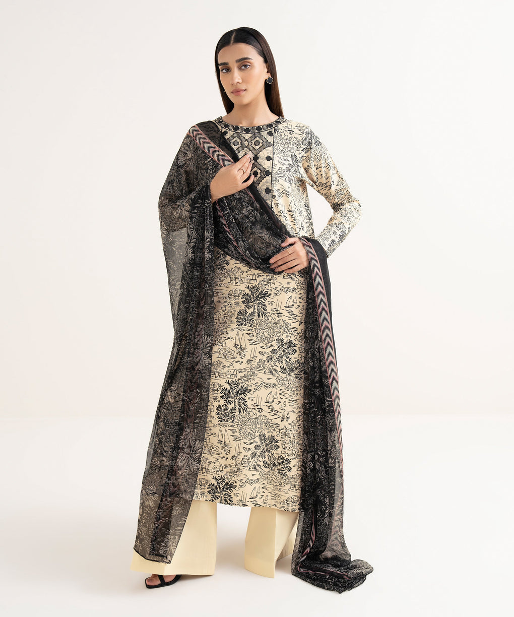Make a statement with our three-piece embroidered beige and black ensemble featuring a lawn shirt paired with a blended chiffon dupatta and cotton trousers.