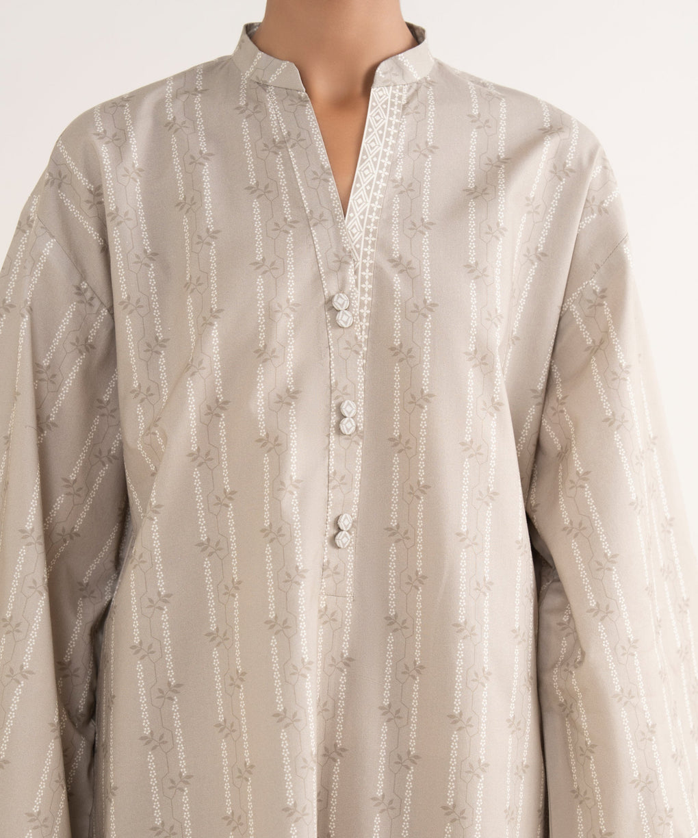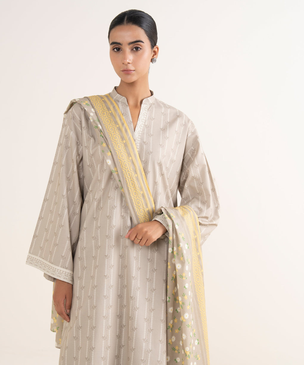 Make a statement with our three-piece printed grey ensemble, featuring a cotton shirt and trousers paired with a fine voile dupatta.