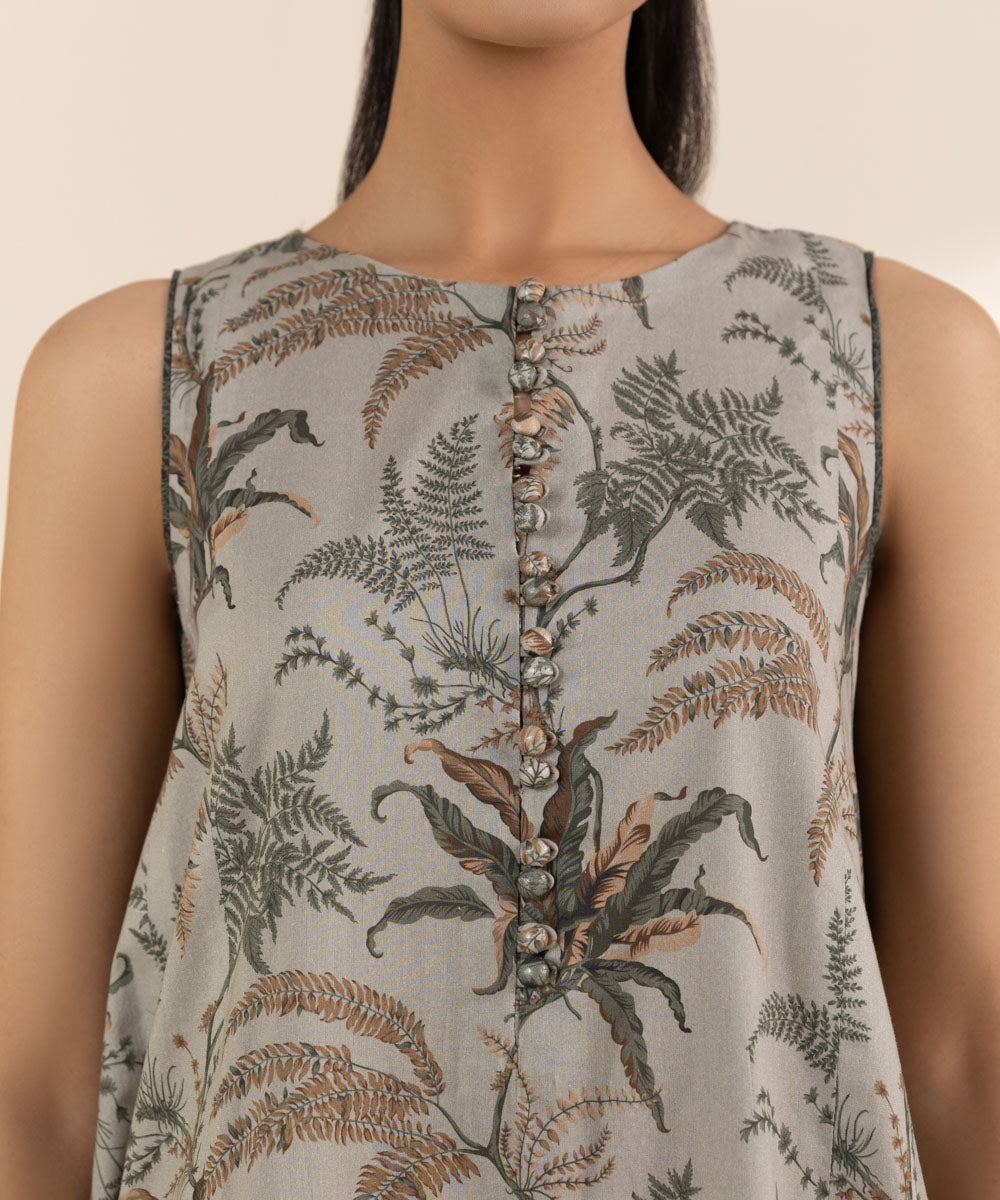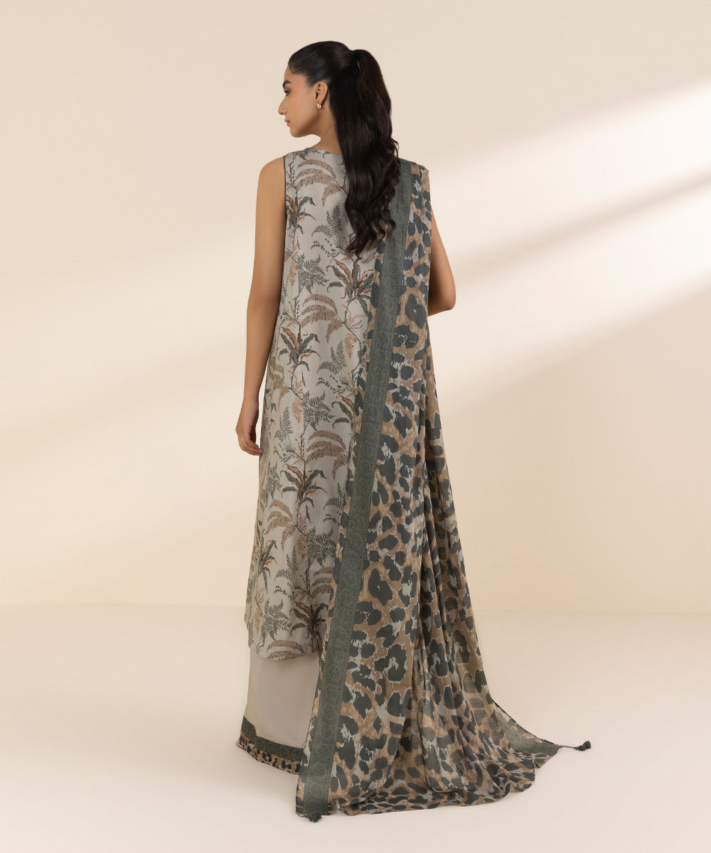 Elevate your wardrobe in our printed grey lawn shirt paired with a textured voile dupatta and cotton trousers.