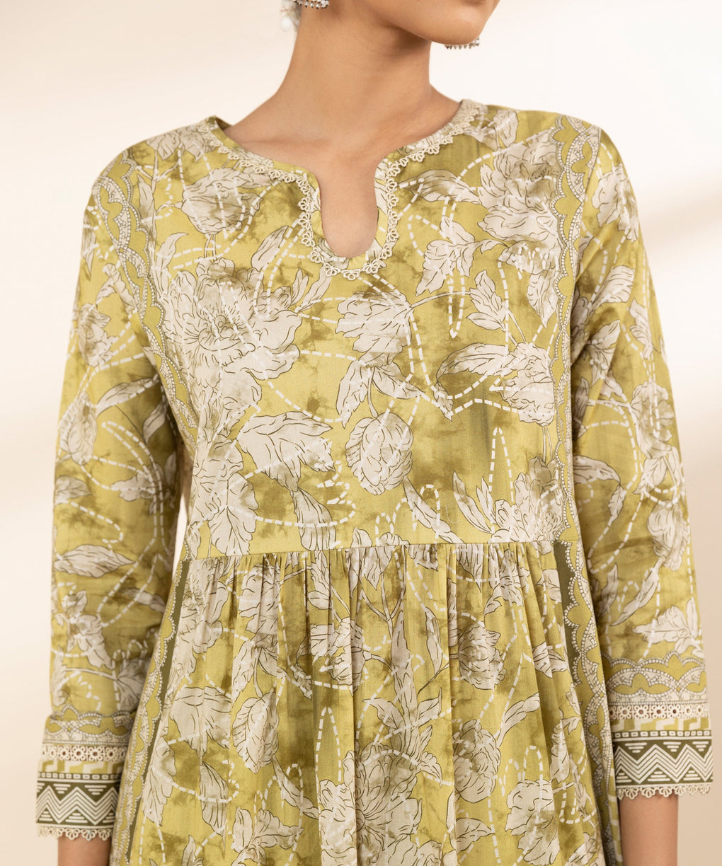 Make a statement with our three-piece printed apple green ensemble featuring a lawn shirt paired with a blended chiffon dupatta and cotton trousers.