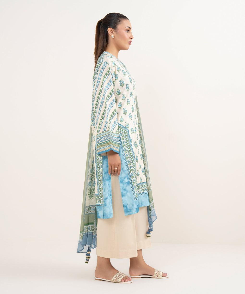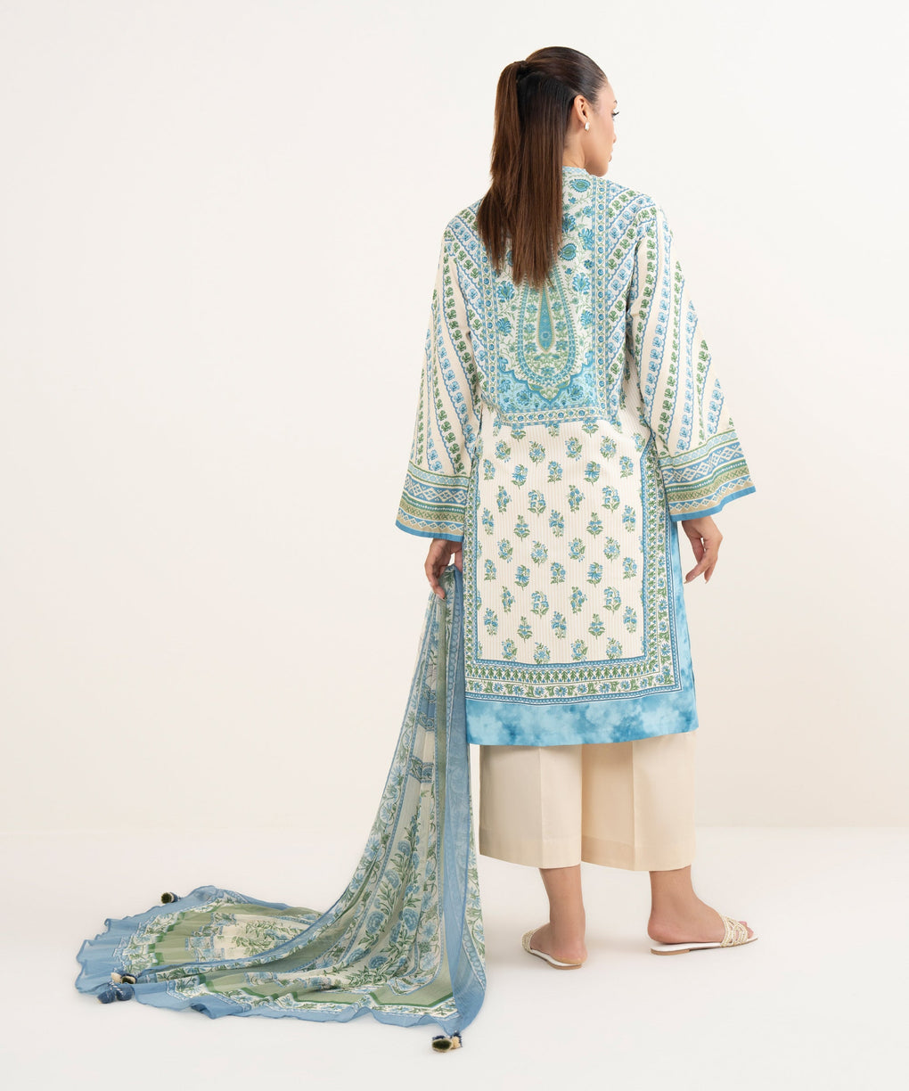Elevate your style with our three-piece printed ice blue and off-white ensemble featuring a cotton shirt and trousers paired with a blended chiffon dupatta.