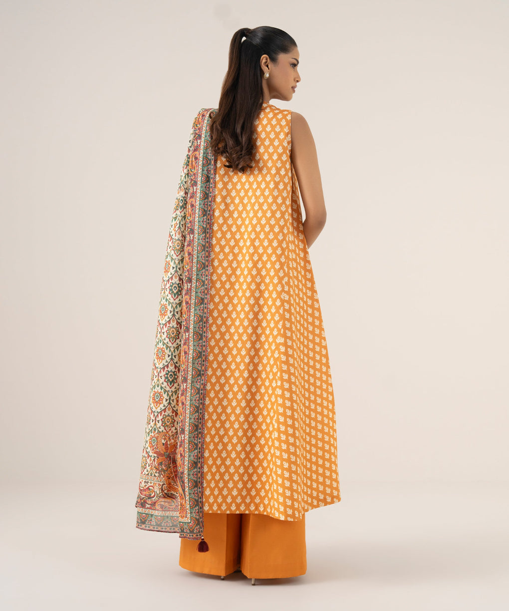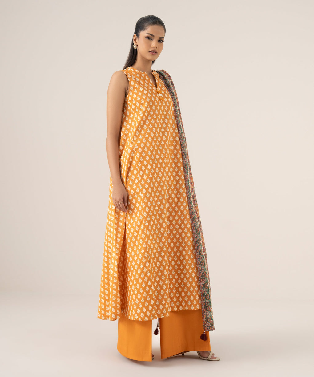 Elevate your style with our three-piece printed orange ensemble featuring a cotton shirt and trousers paired with a multicoloured blended chiffon dupatta.