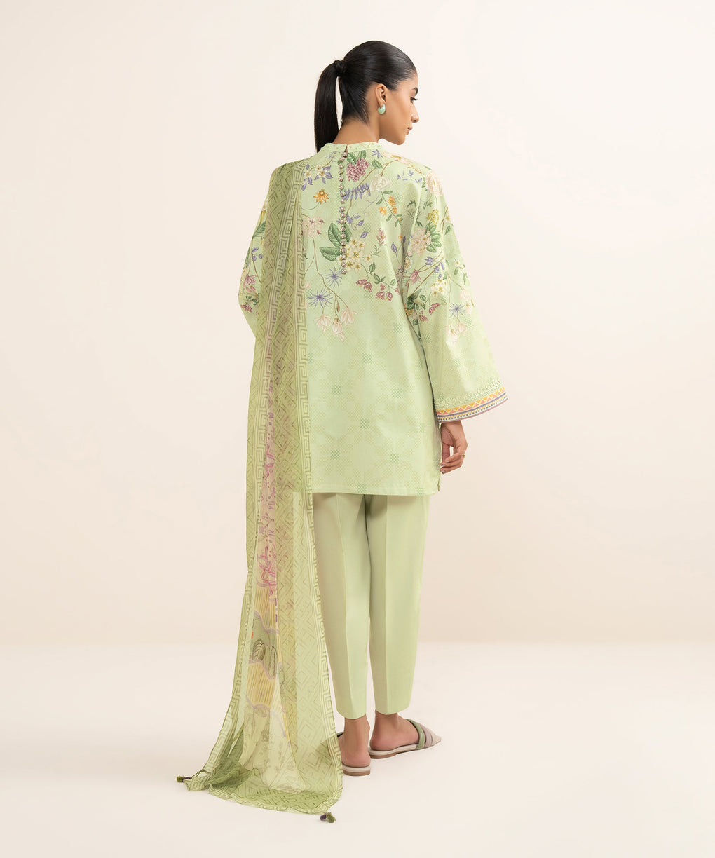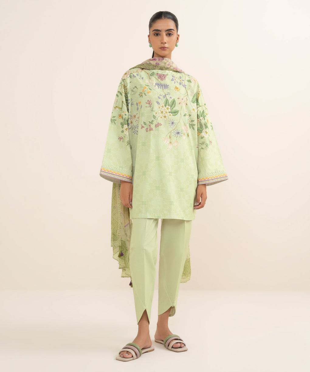 Make a statement with our three-piece printed pistachio ensemble featuring a lawn shirt paired with a blended chiffon dupatta and cotton trousers.