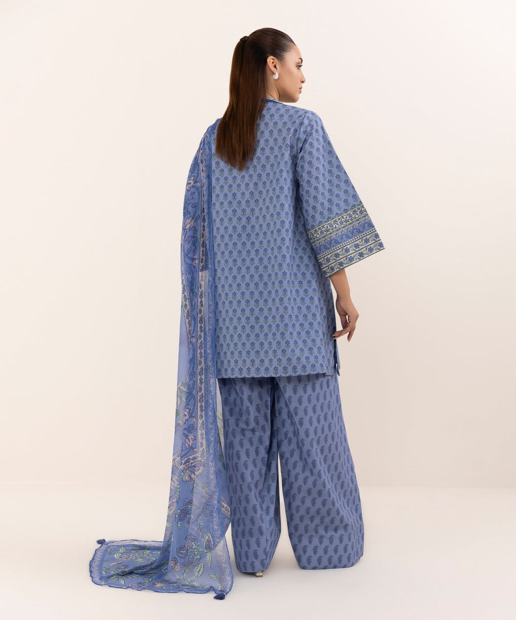 Elevate your style with our three-piece printed purple blue ensemble featuring a cotton shirt and trousers paired with a blended chiffon dupatta.