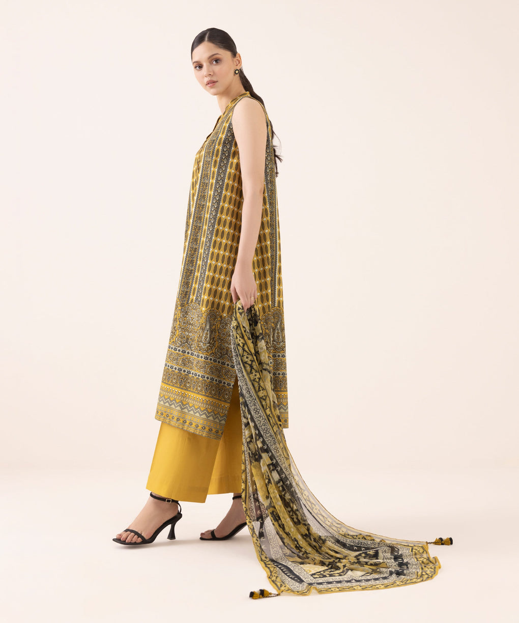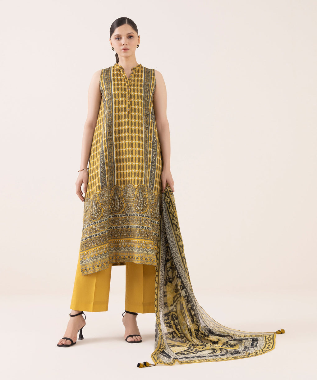 Elevate your style with our three-piece printed mustard and black ensemble featuring an arabic lawn shirt paired with a blended chiffon dupatta and cotton trousers.
