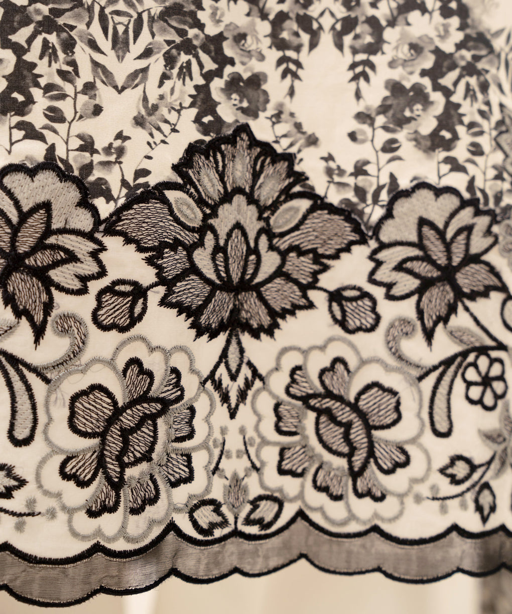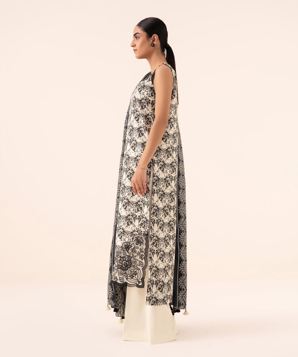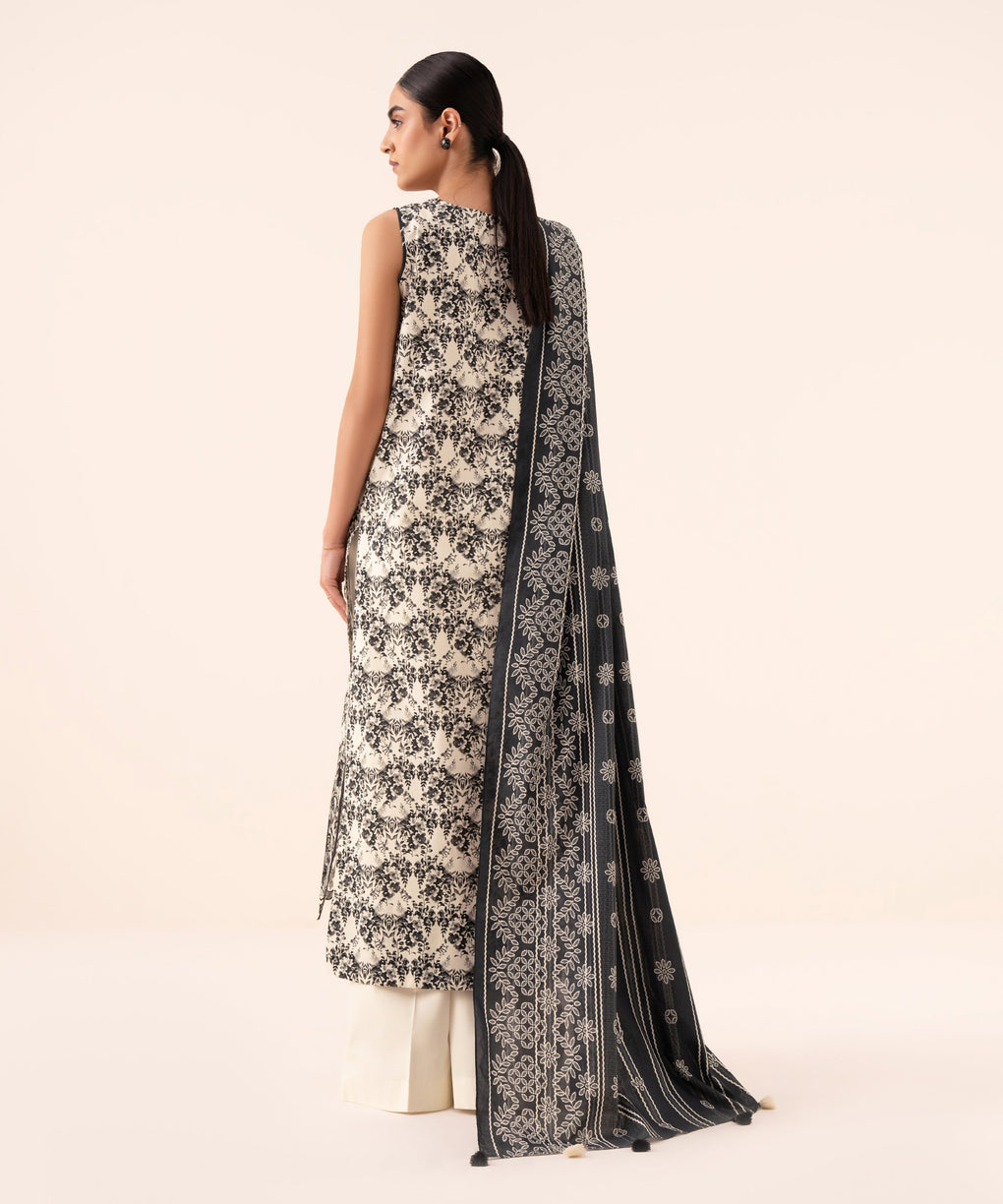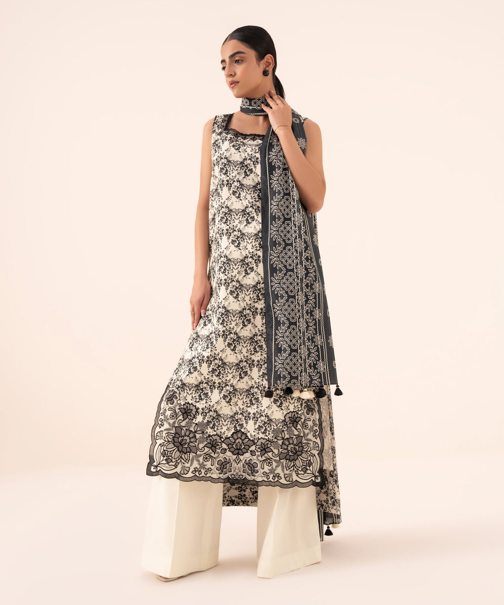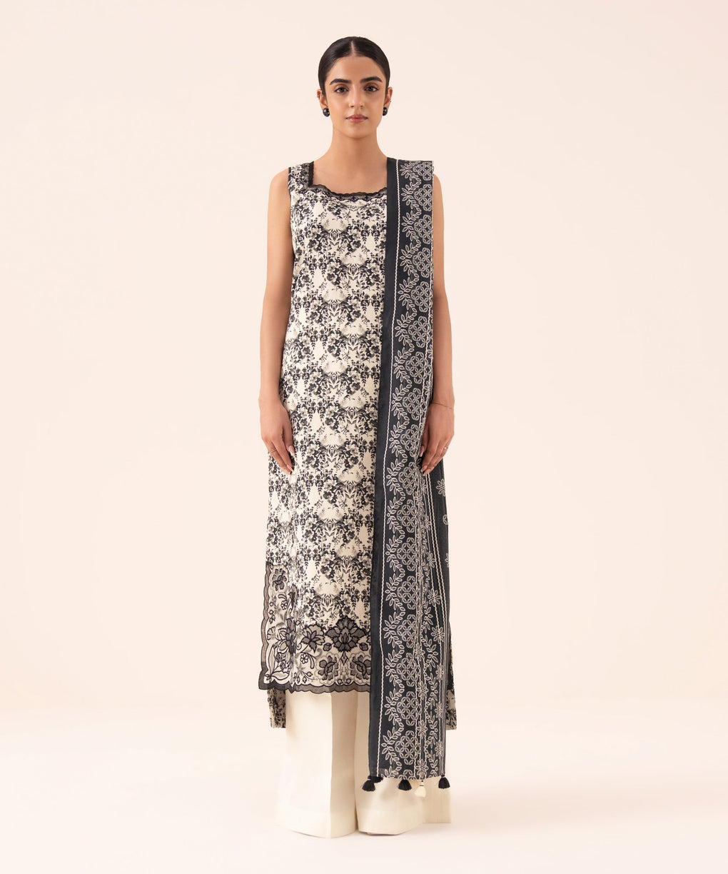 Make a statement with our black and white three-piece embroidered ensemble, featuring a cotton shirt and trousers paired with a zari voile dupatta.