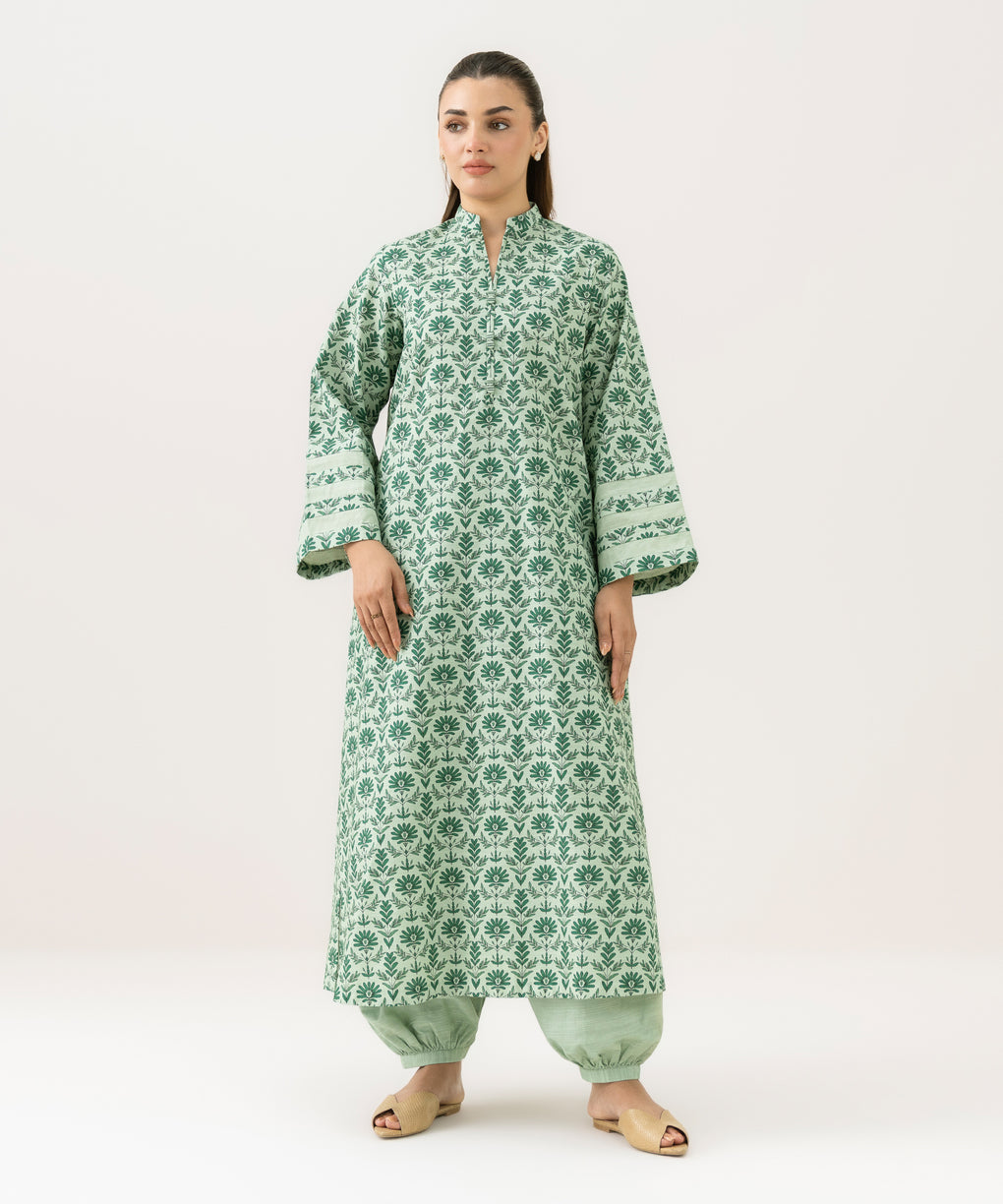 Make a statement with our two-piece printed pastel green ensemble featuring a khaddar shirt and trousers.