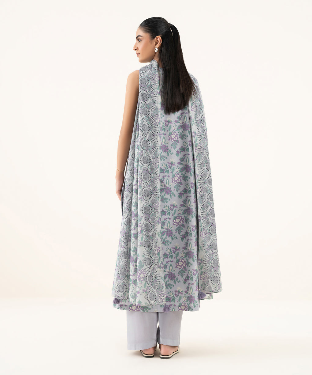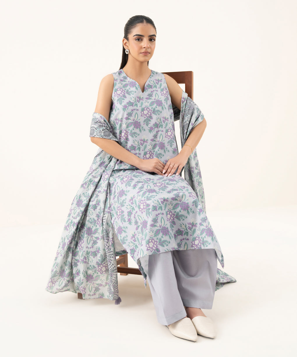 Make a statement with our three-piece printed grey and lilac ensemble featuring a cotton shirt and trousers paired with a voile dupatta.
