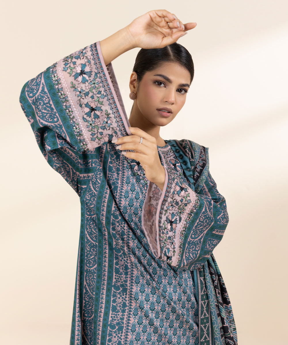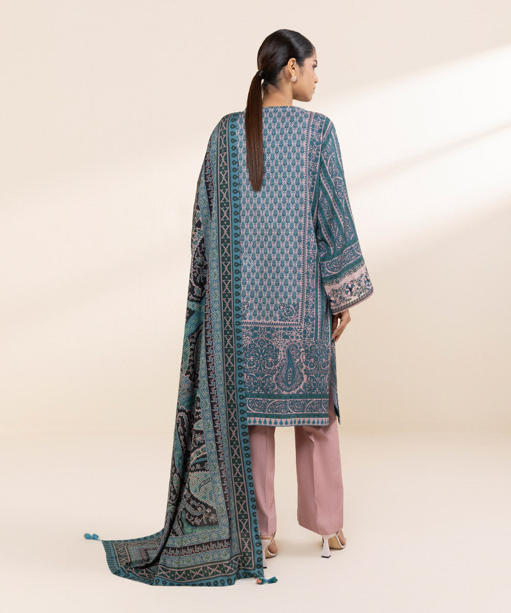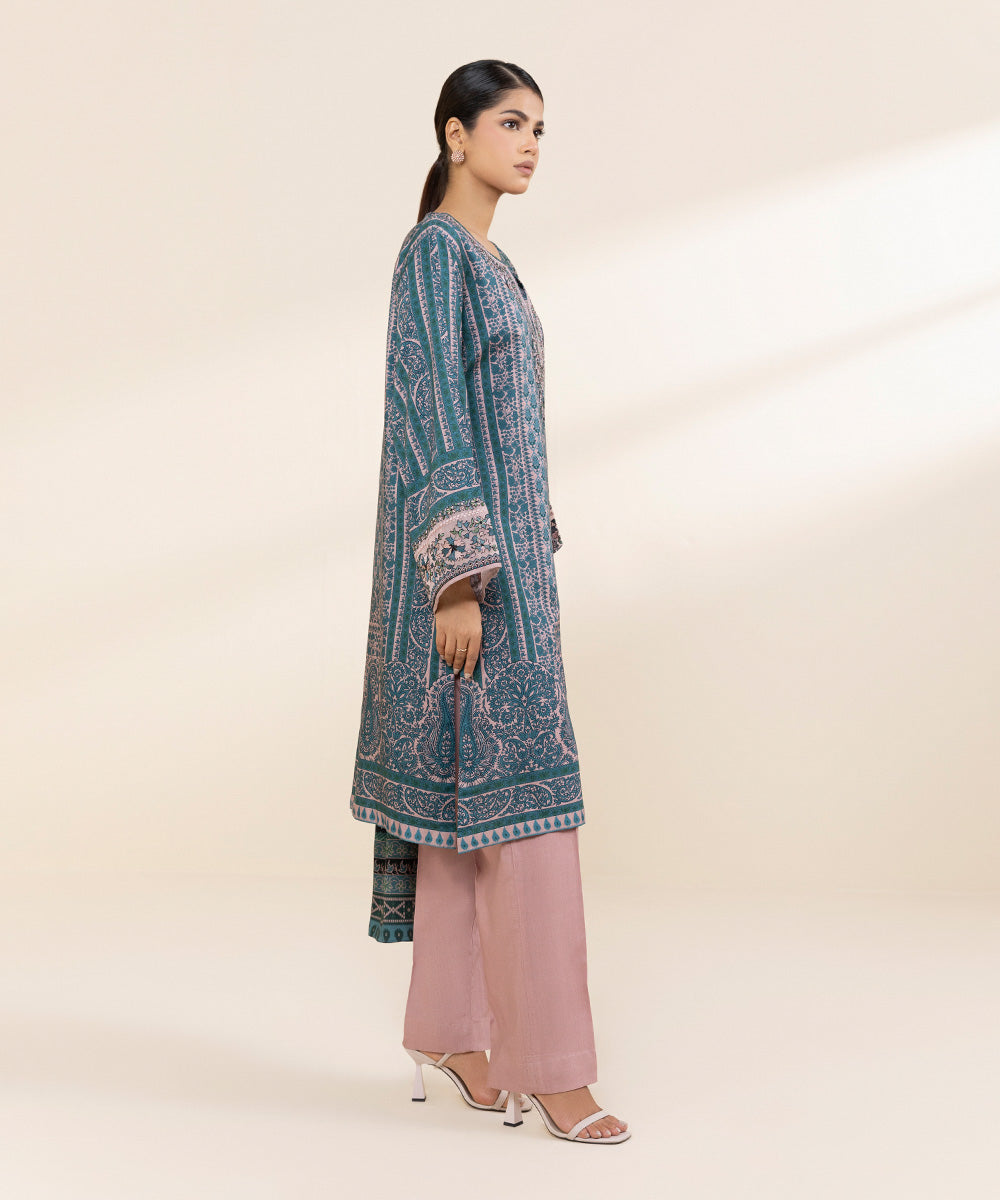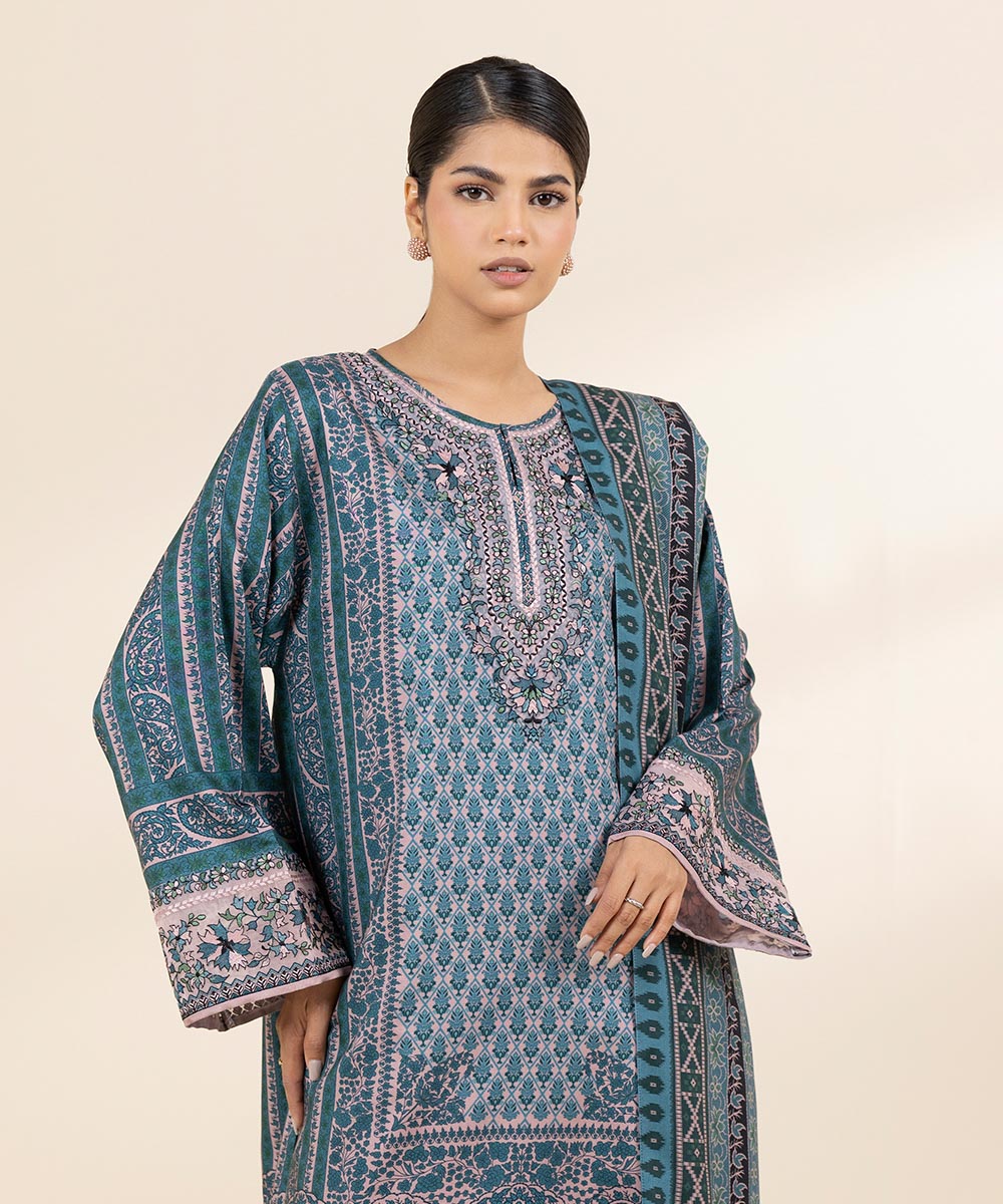 Embrace winter chic in our dusty pink, teal and multi coloured two-piece linen printed shirt and Dupatta